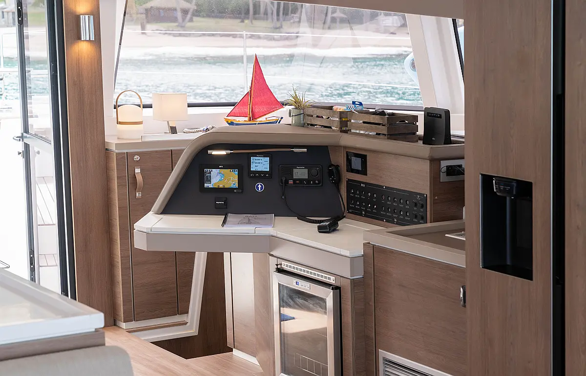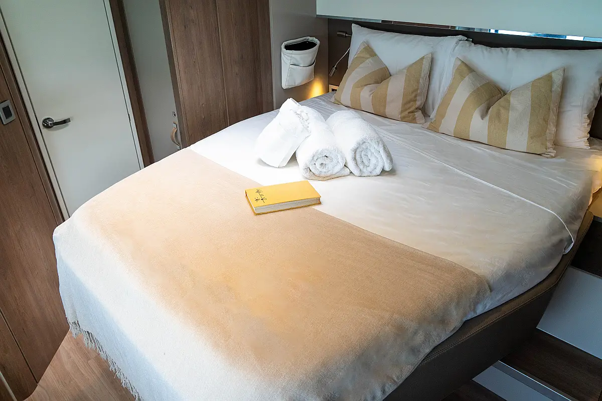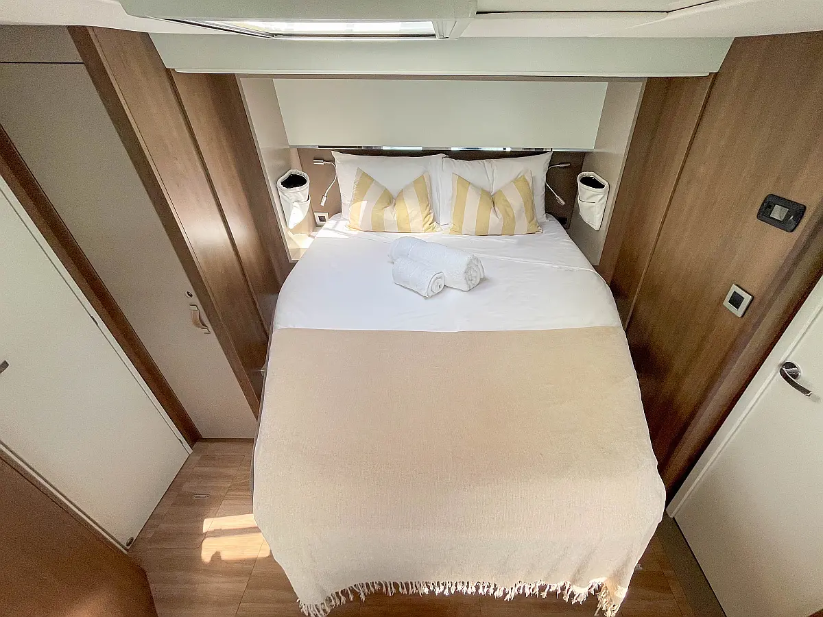 Inverter, Kühlschrank, Cockpit-Kissen, Elektrische Toilette, Wassermacher, Eismaschine, Solar-Panele, Lautsprecher im Cockpit, Klimaanlage, Elektrische Winch (Segel), Teakdeck, Beiboot