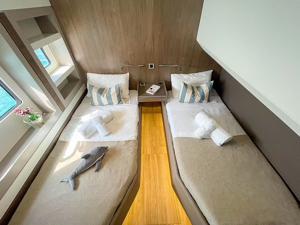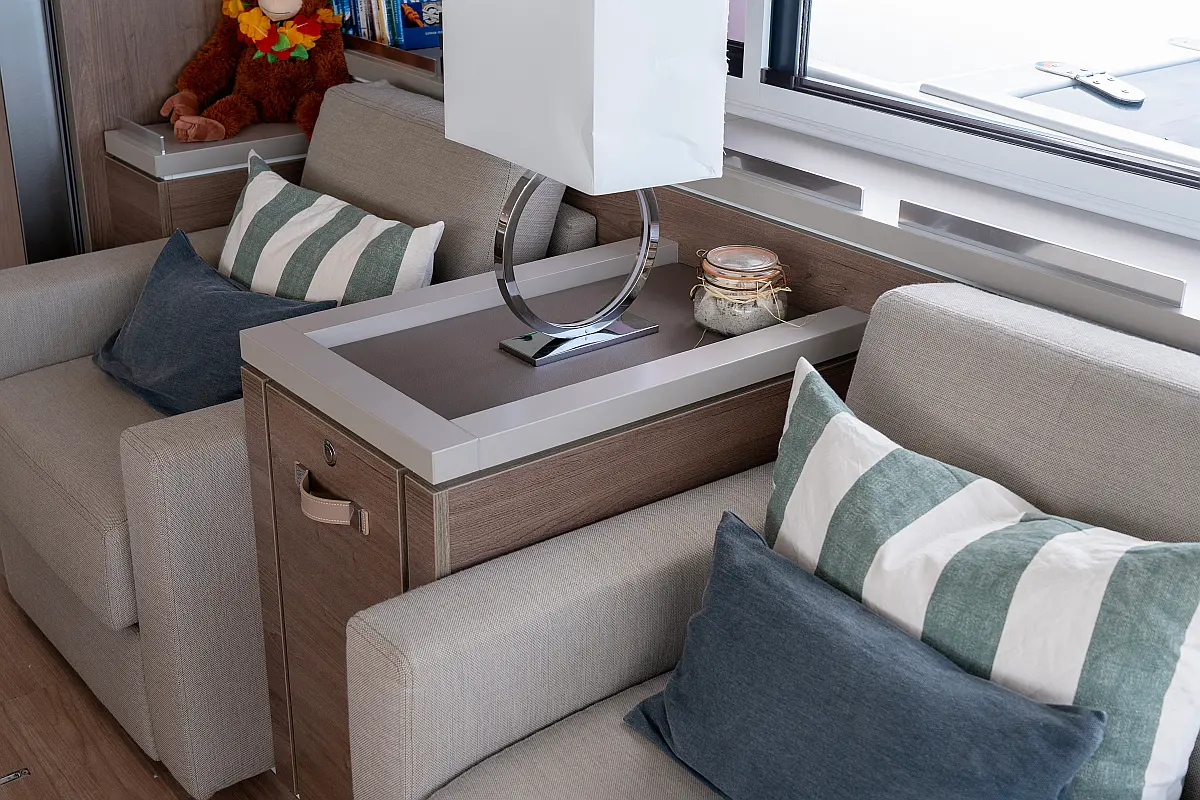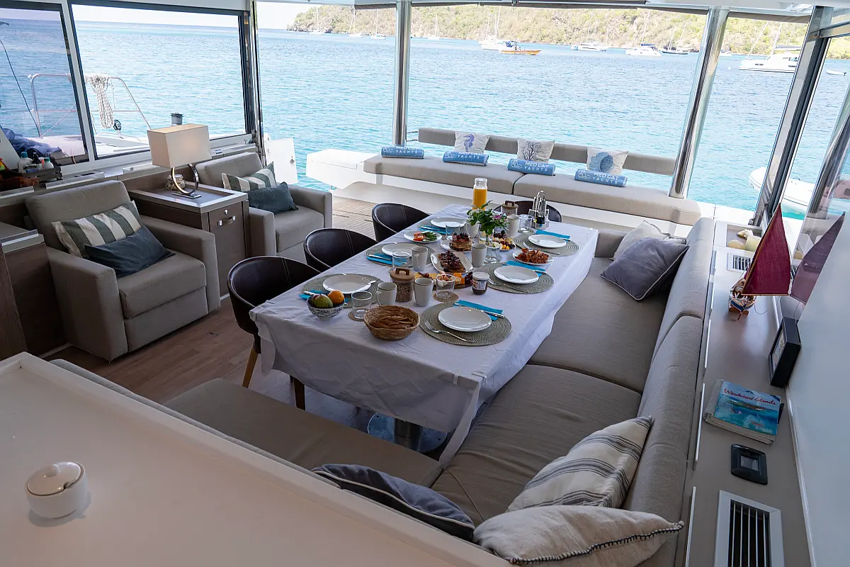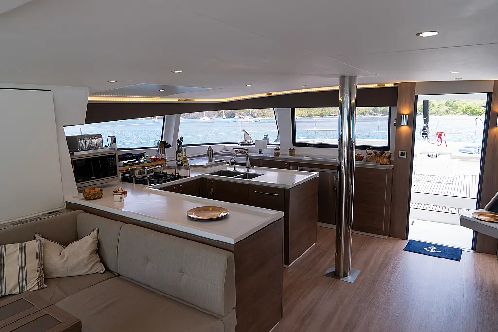 Inverter, Kühlschrank, Cockpit-Kissen, Elektrische Toilette, Wassermacher, Eismaschine, Solar-Panele, Lautsprecher im Cockpit, Klimaanlage, Elektrische Winch (Segel), Teakdeck, Beiboot