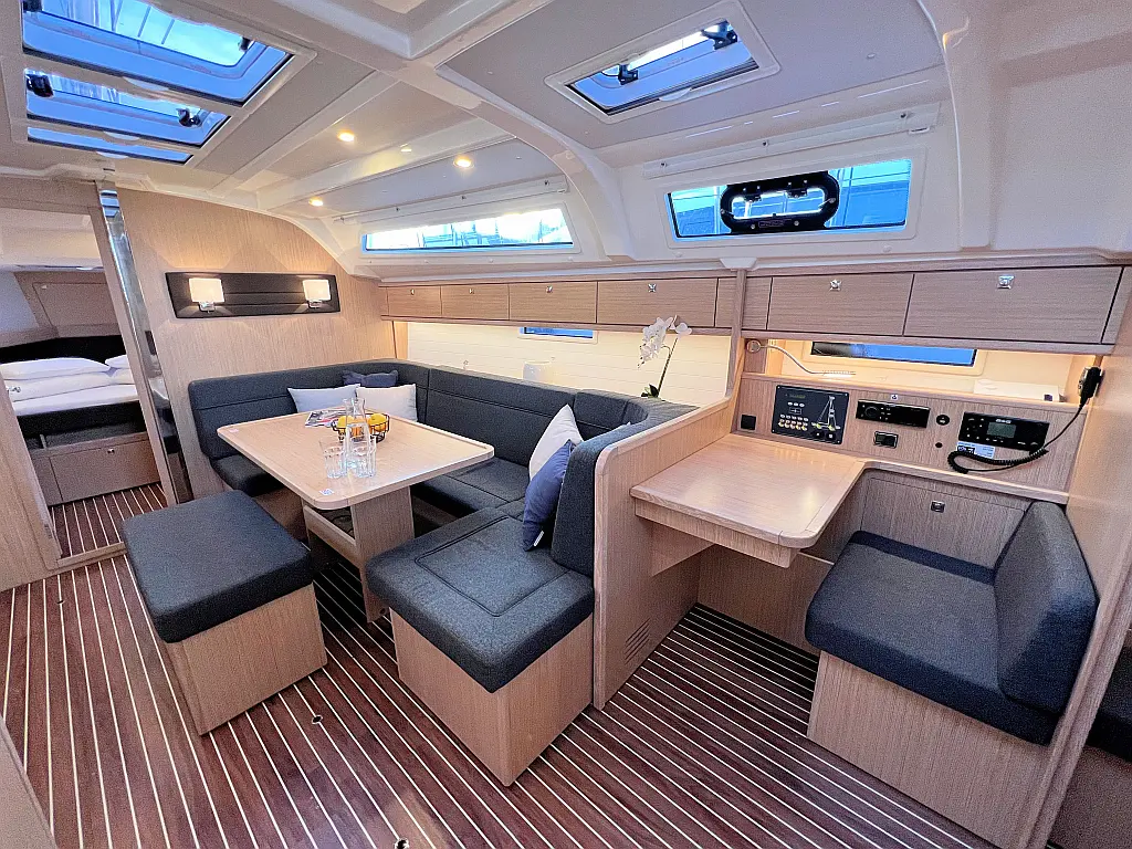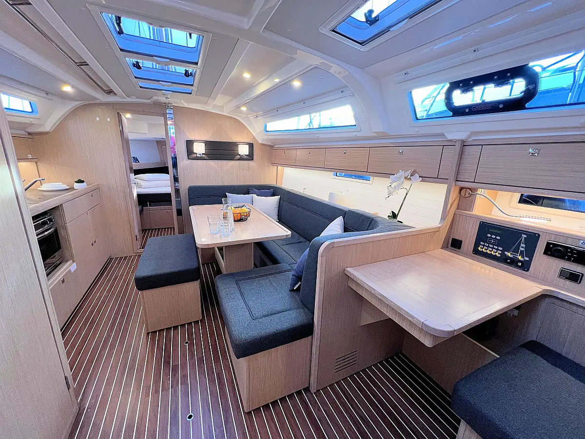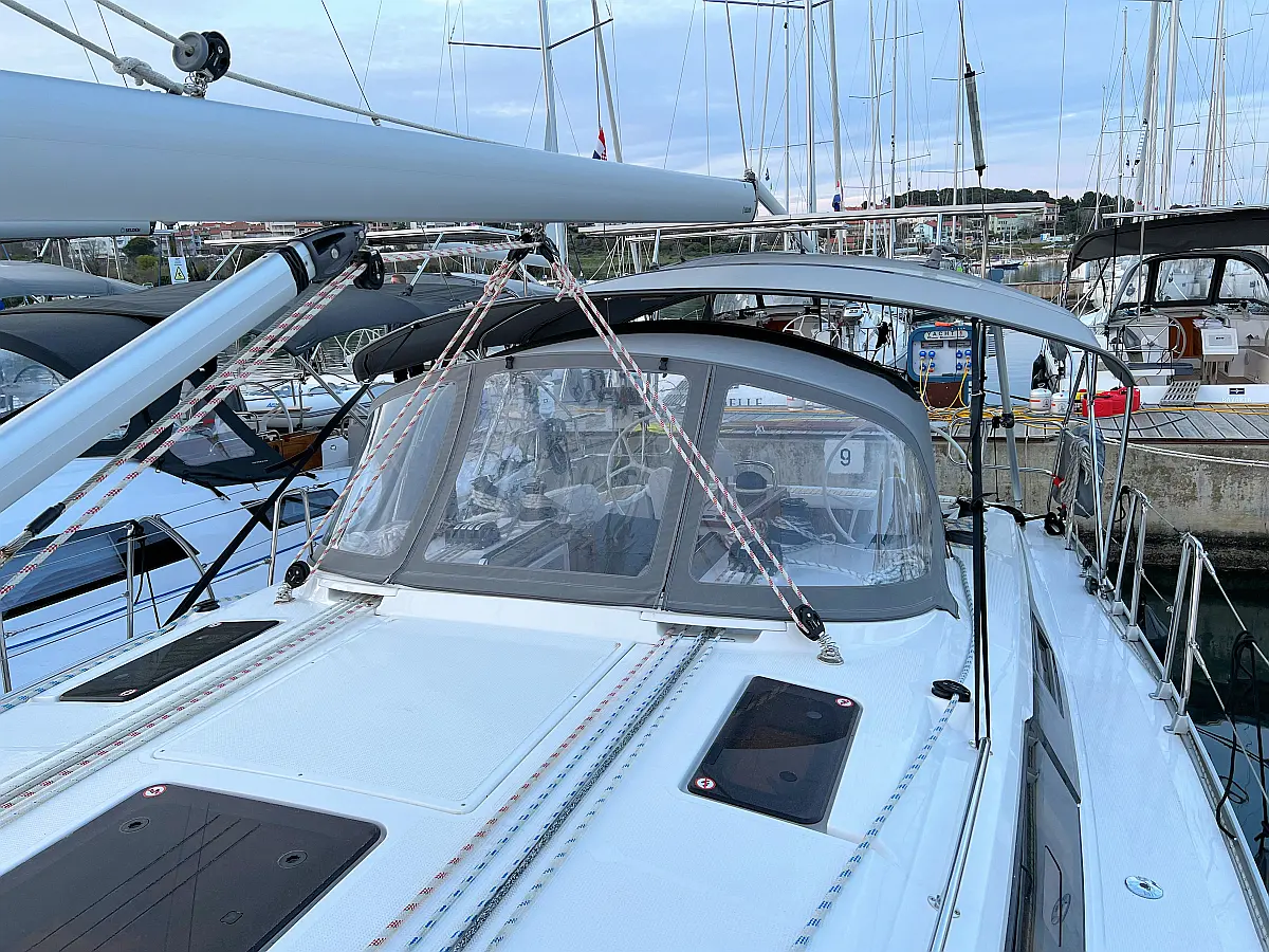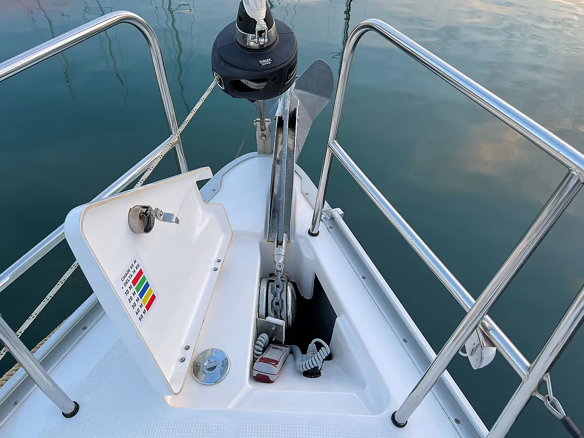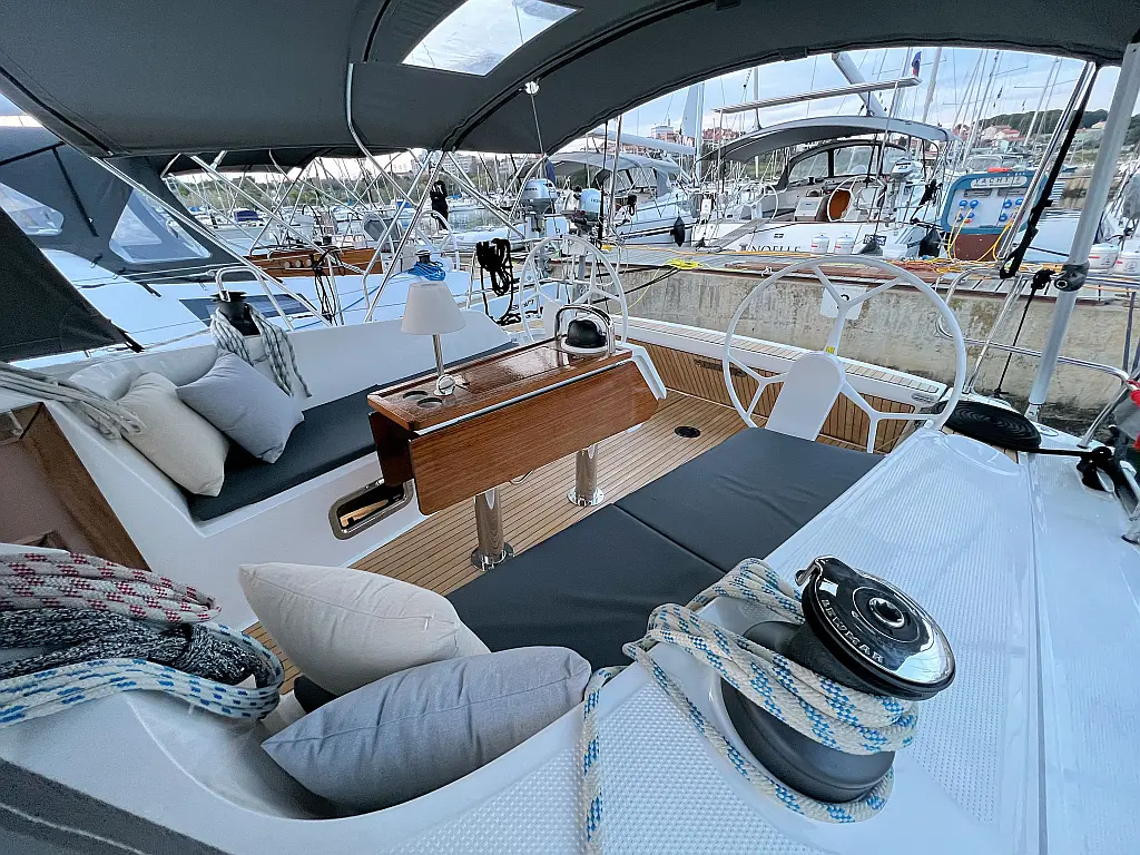 Lautsprecher im Cockpit, Fäkalientank, Bimini, Cockpit-Kissen, Beiboot, Sprayhood, Teak Cockpit, Kühlschrank, Heizung, Solar-Panele