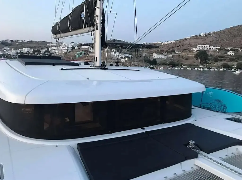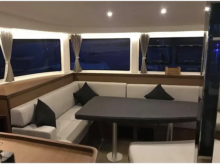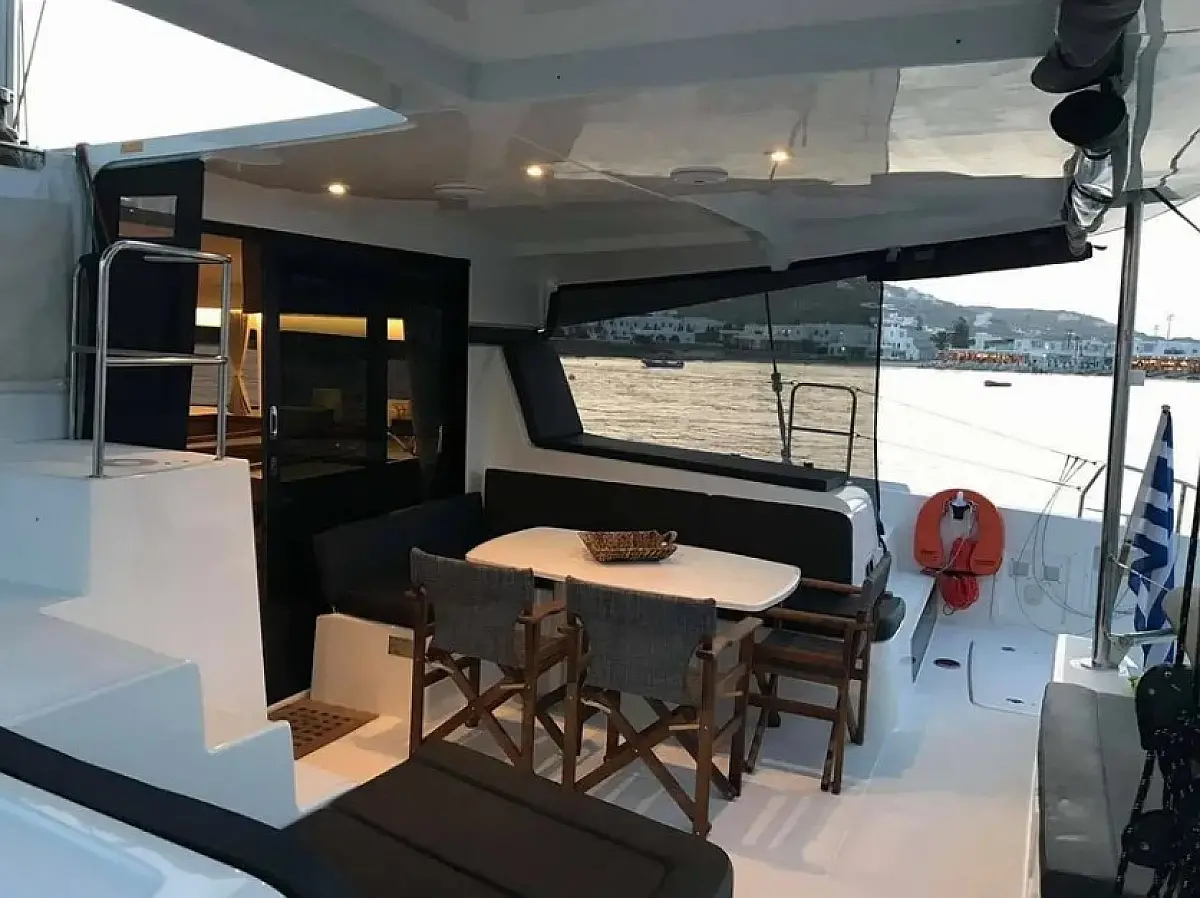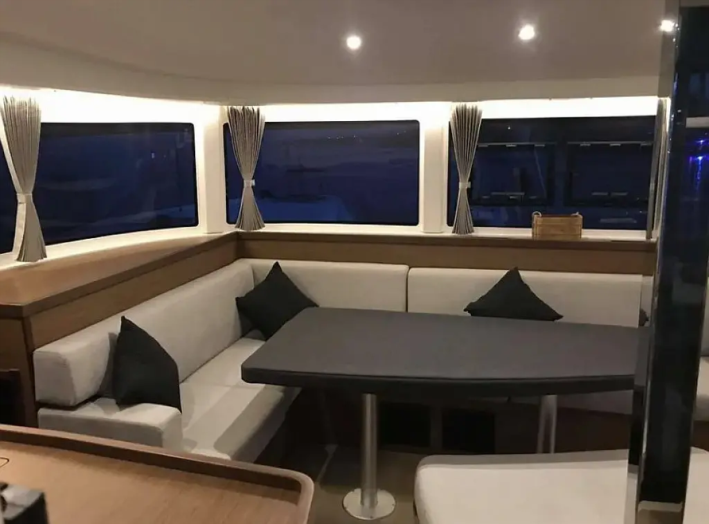Klimaanlage, Bimini, Elektrische Toilette, Generator, Inverter, Solar-Panele, Sprayhood, Wassermacher, Elektrische Winch (Segel), Kühlschrank, Cockpit-Kissen, Kaffeemaschine, Außenbordmotor, Beiboot