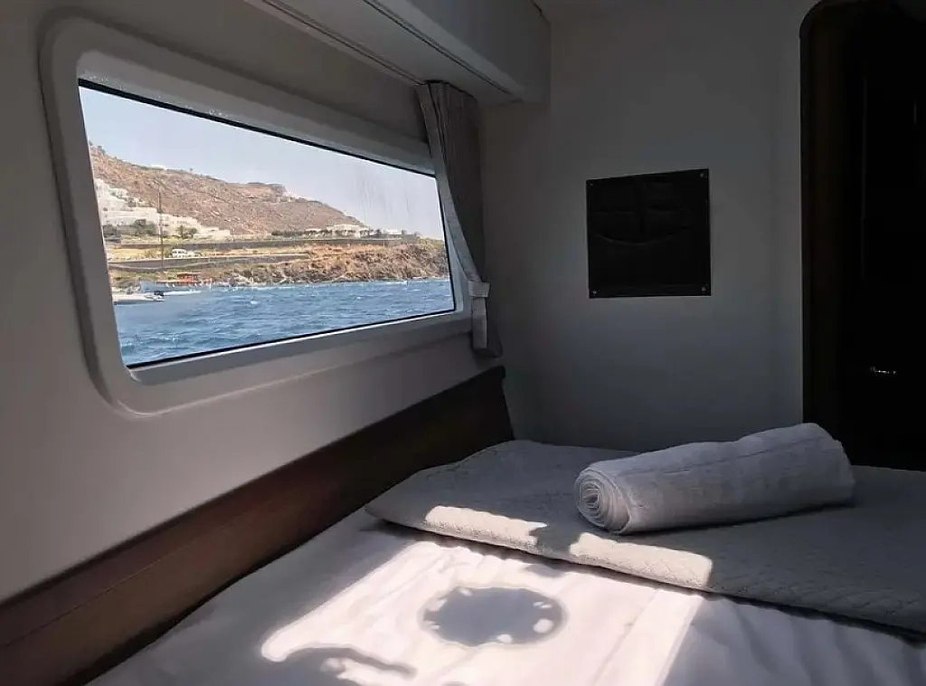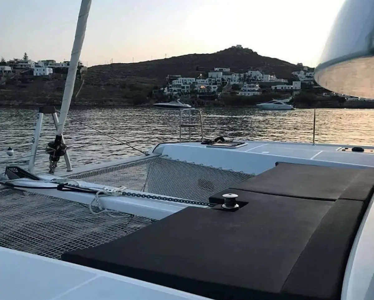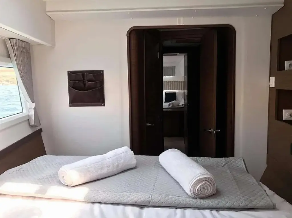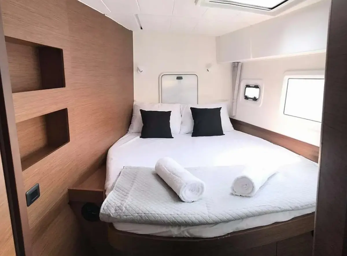 Klimaanlage, Bimini, Elektrische Toilette, Generator, Inverter, Solar-Panele, Sprayhood, Wassermacher, Elektrische Winch (Segel), Kühlschrank, Cockpit-Kissen, Kaffeemaschine, Außenbordmotor, Beiboot