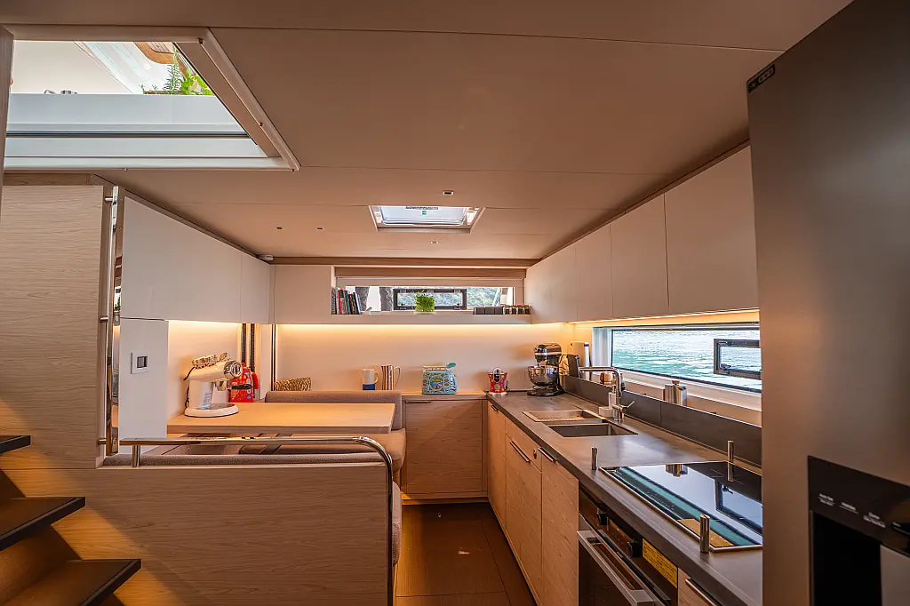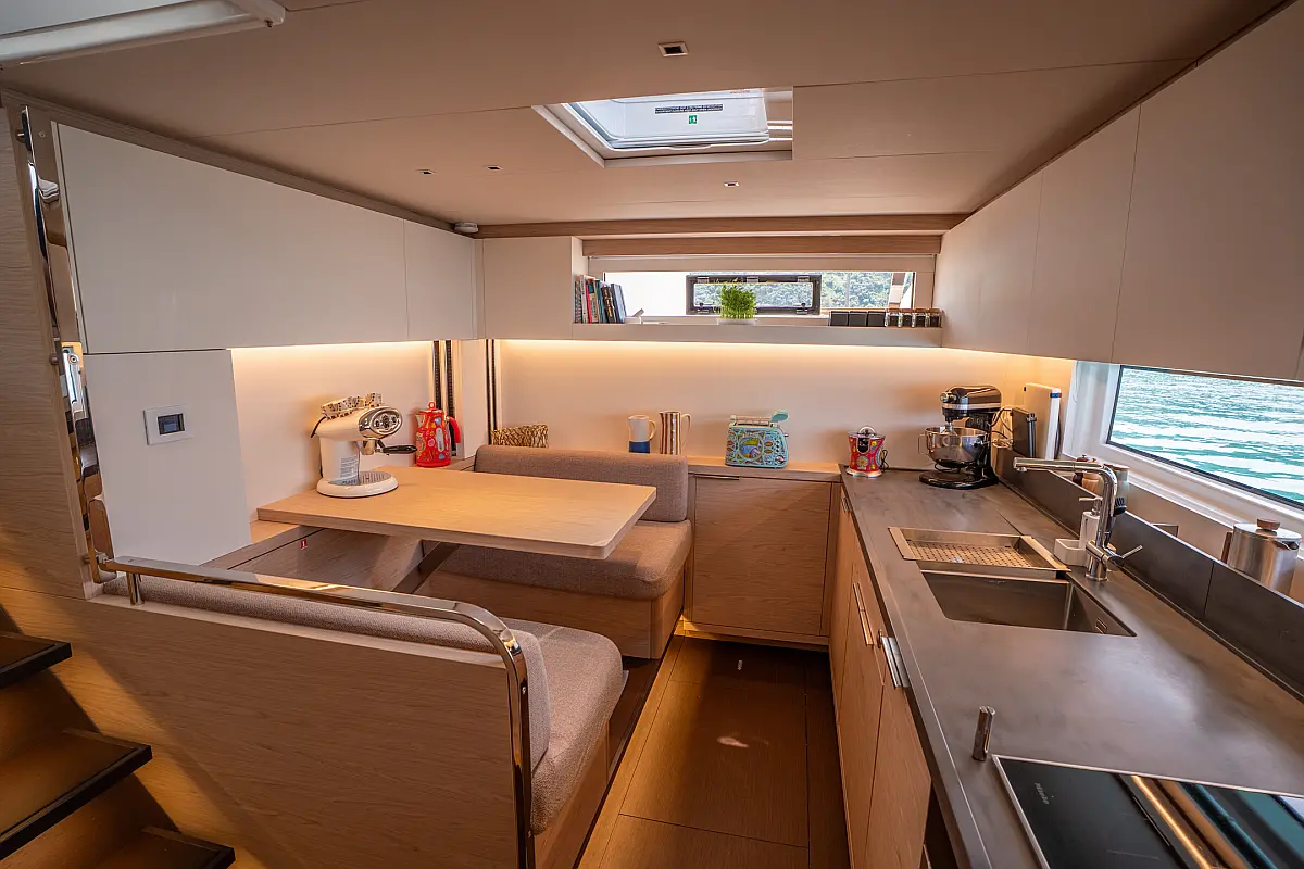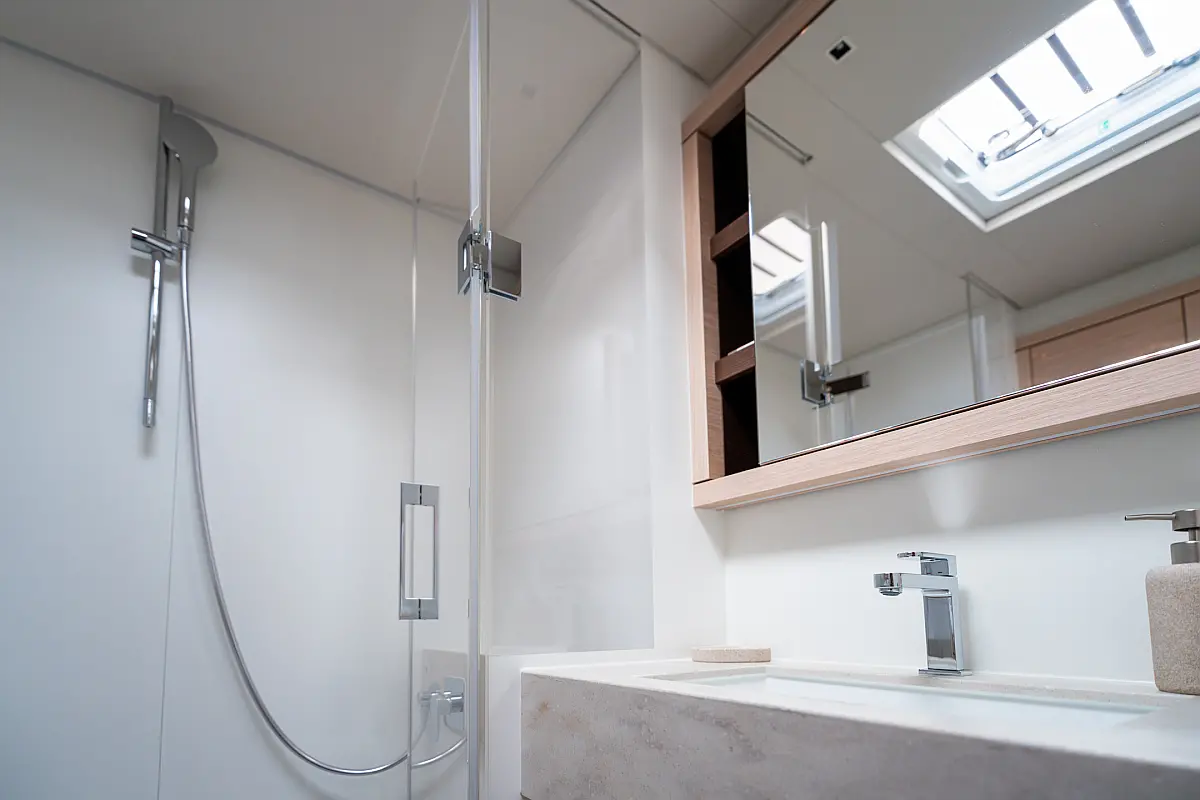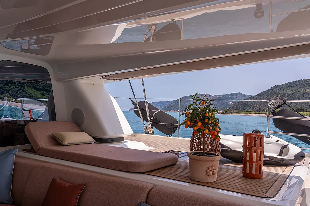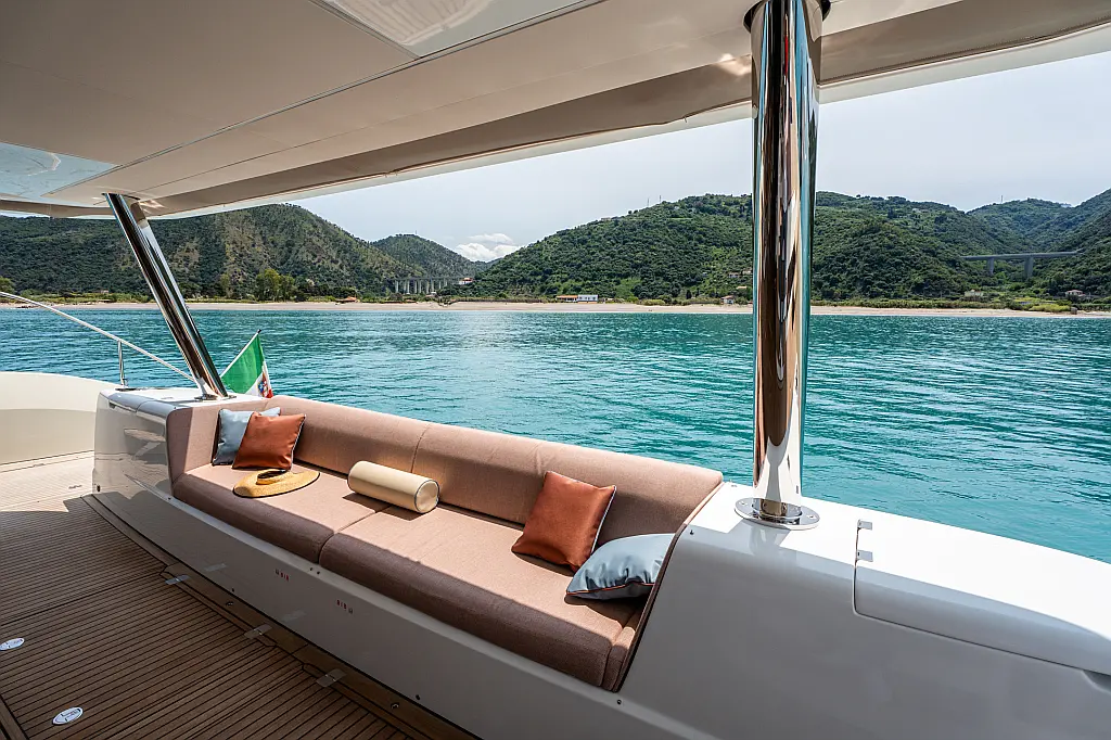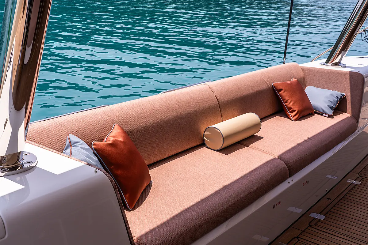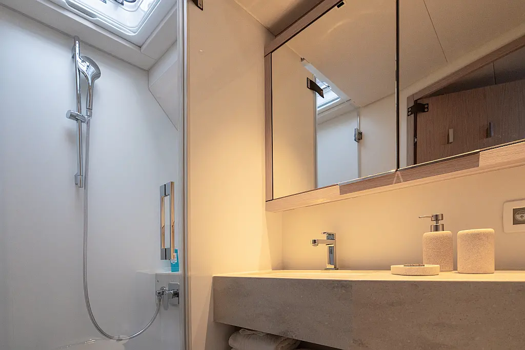 Beiboot, Kühlschrank, Teak Cockpit, Hydraulische Gangway, Flybridge, Klimaanlage, Lautsprecher im Cockpit, Grill im Cockpit, Inverter, Wassermacher, Kaffeemaschine, Generator, Elektrische Toilette