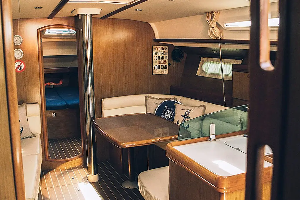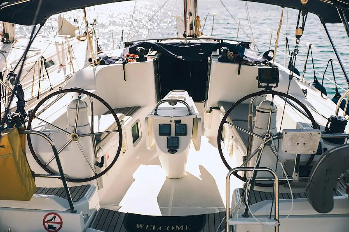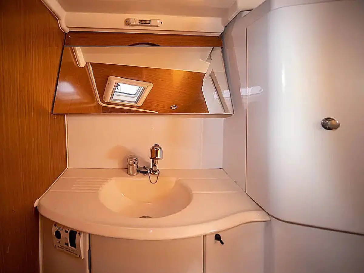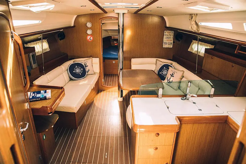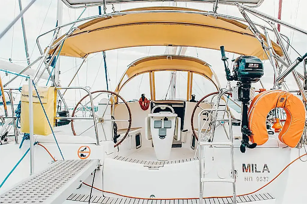 Beiboot, Bimini, Sprayhood, Cockpit-Kissen, Elektrische Toilette, Kühlschrank, Solar-Panele, Außenbordmotor, Lautsprecher im Cockpit