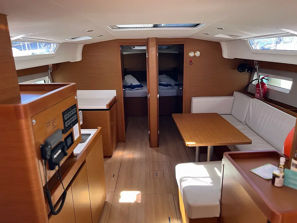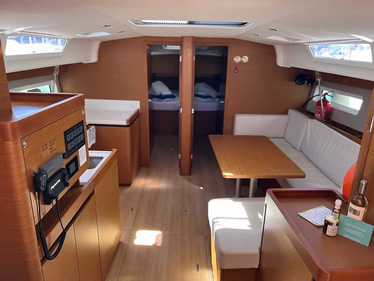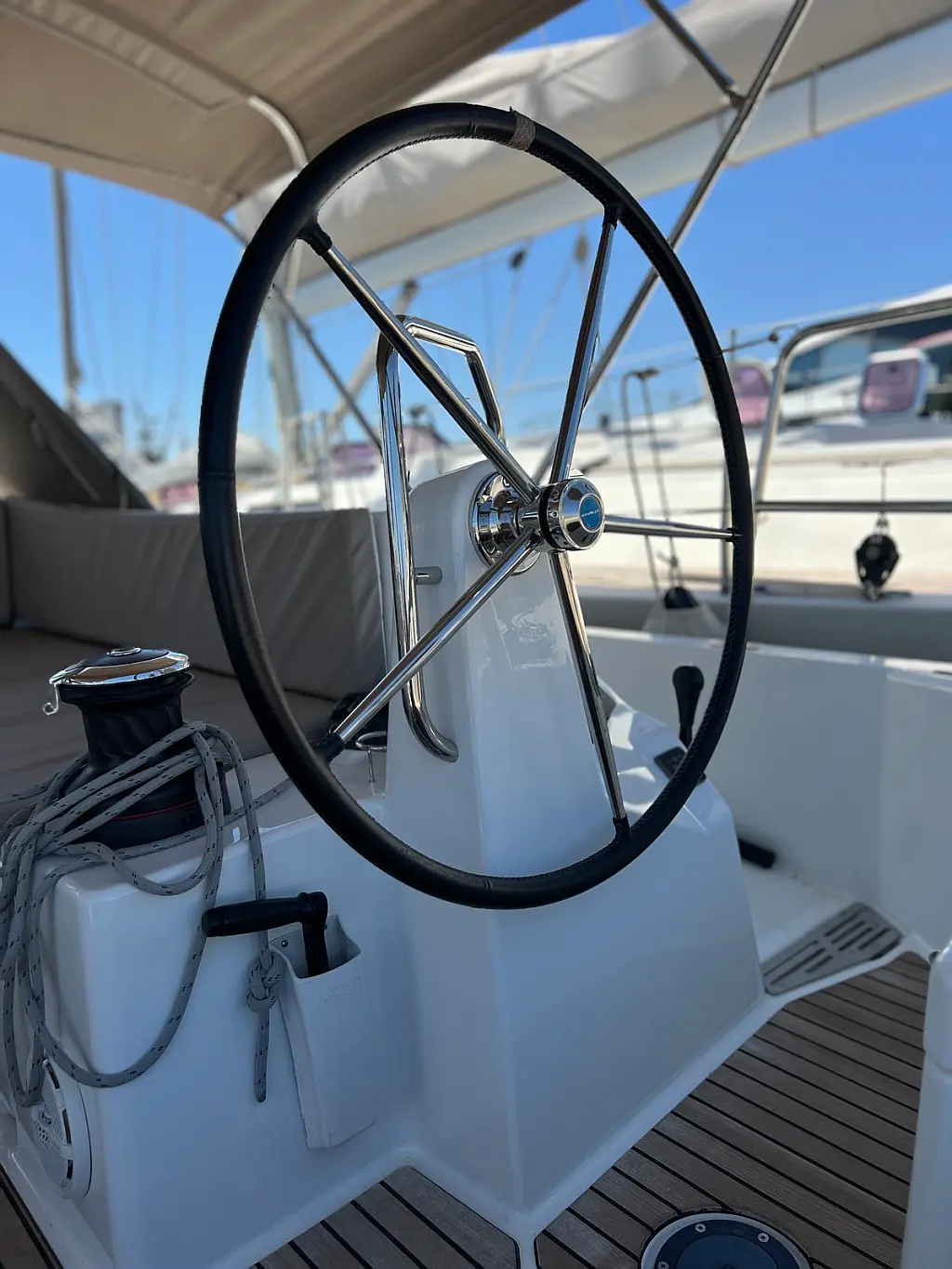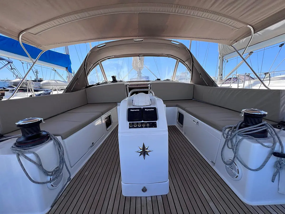 Lautsprecher im Cockpit, Cockpit-Kissen, Kühlschrank, Teak Cockpit, Badeplattform, Fäkalientank, Sprayhood, Beiboot, Bimini