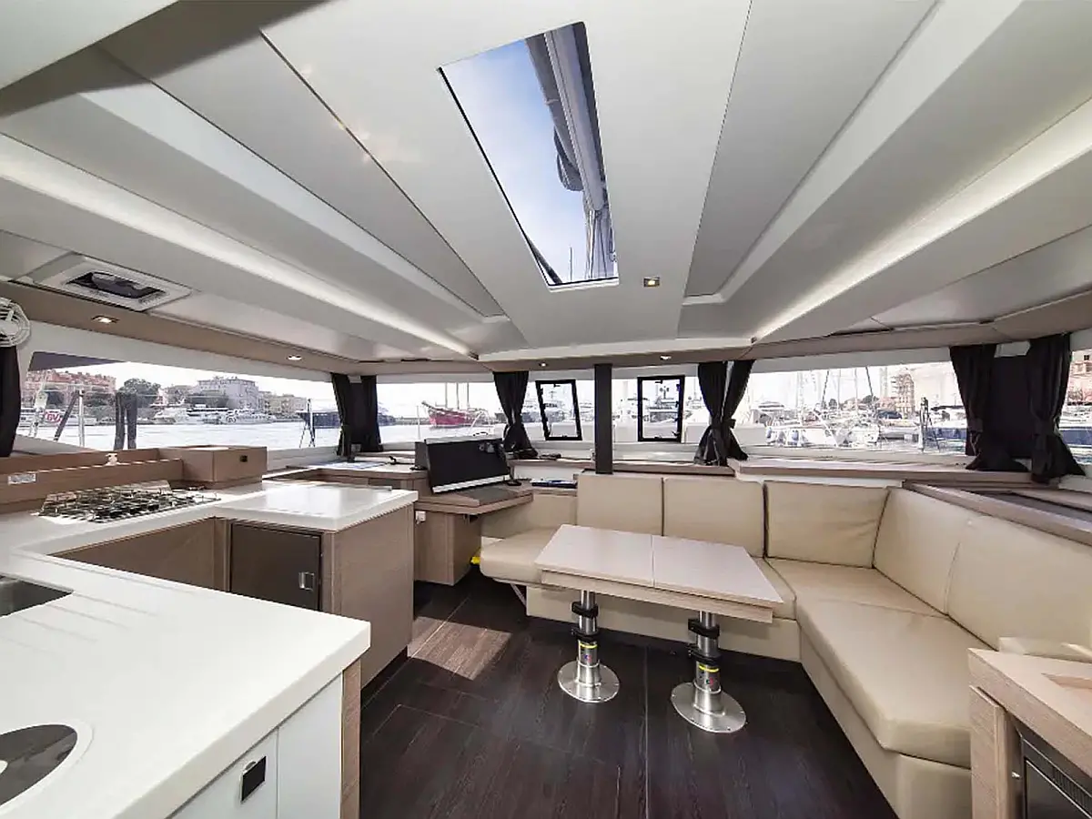 41 ft | Length 4 Cabins 8 Berths 4 Heads Technical Specifications Draught: 4 ft | Engine: 2x30 CV Water capacity: 700.00 l Main sail: None Displacement: N/A Fuel capacity: 470.00 l Beam: 24 ft | Genoa: None Equipment Comfort: Electric winches, Inverter Sails: Lazy bag, Lazy jack Entertainment: TV Documents Download Brochure