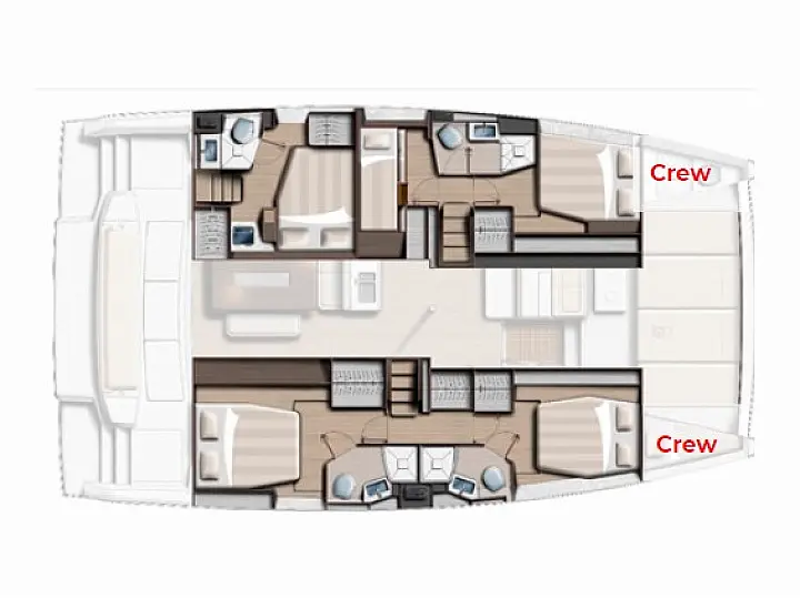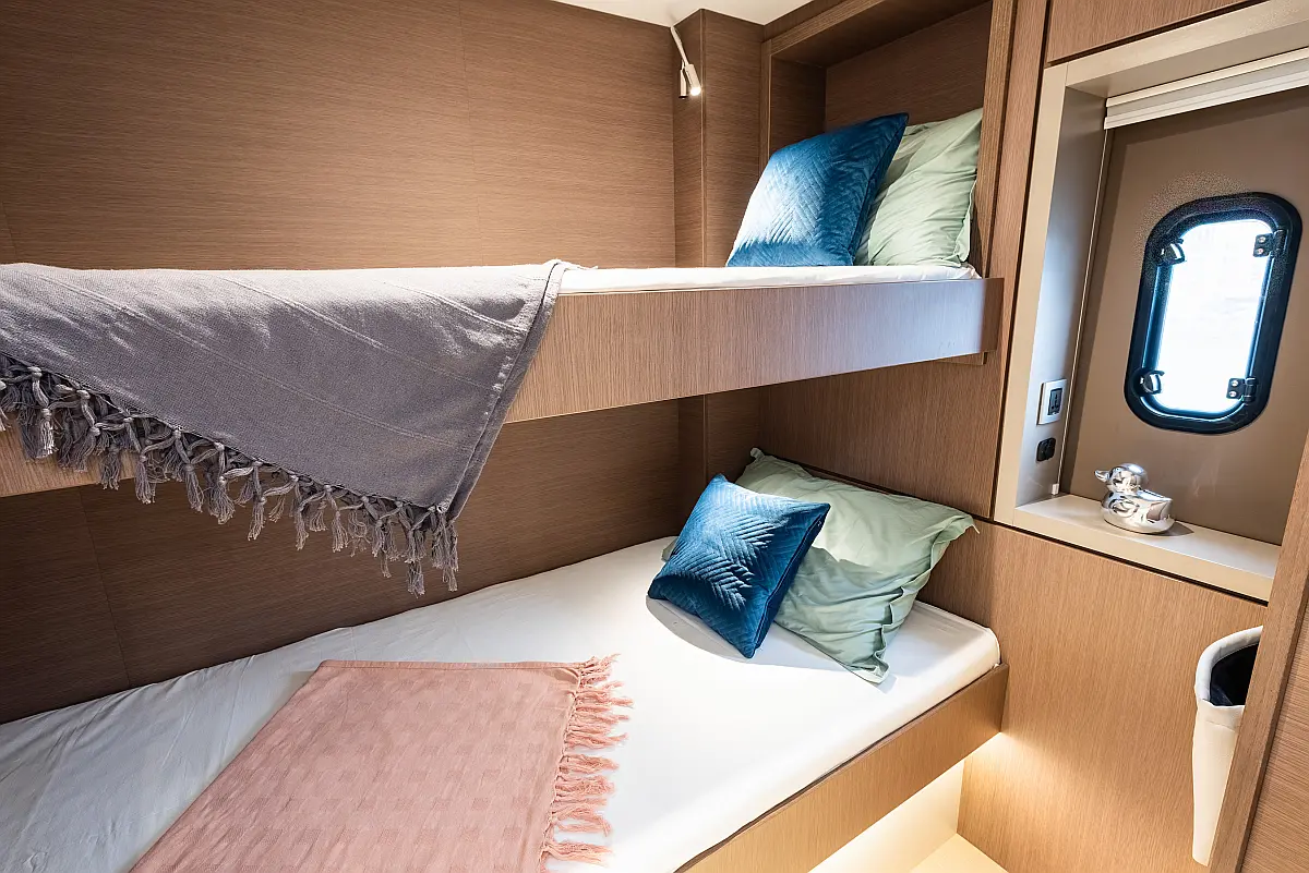5 GUESTS: 5 double cabins (1 bunk cabin) + 4 WCs; CREW: 1 single cabin in forepeak + 1 WC