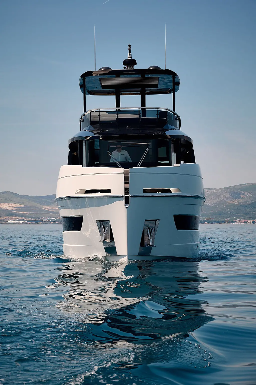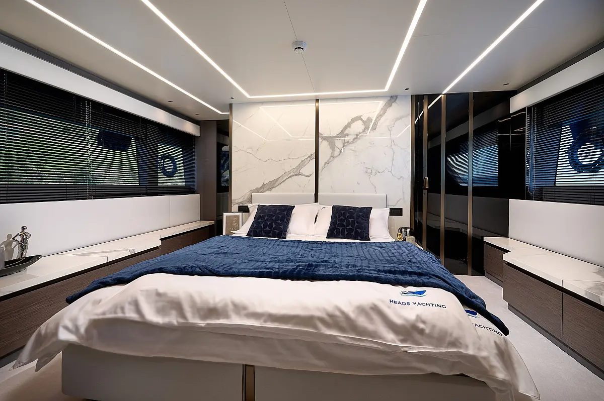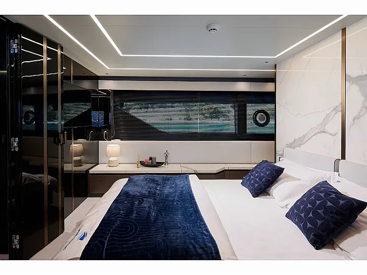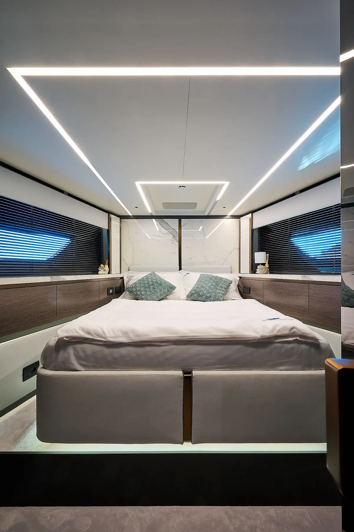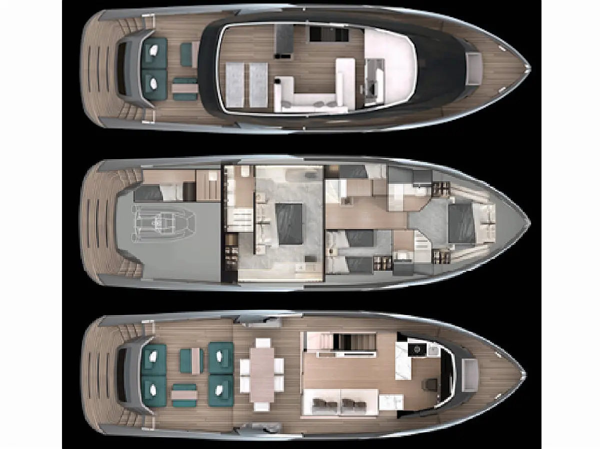 62 ft | Length 5 3+2 Cabins 8 6+2 Berths 4 3+1 Heads Technical Specifications Draught: 4 ft | Engine: 2 x 800 IPS Volvo Penta Water capacity: 1000.00 l Main sail: None Displacement: 27000.00 kg Fuel capacity: 2800.00 l Beam: 17 ft | Genoa: None Documents Download Brochure