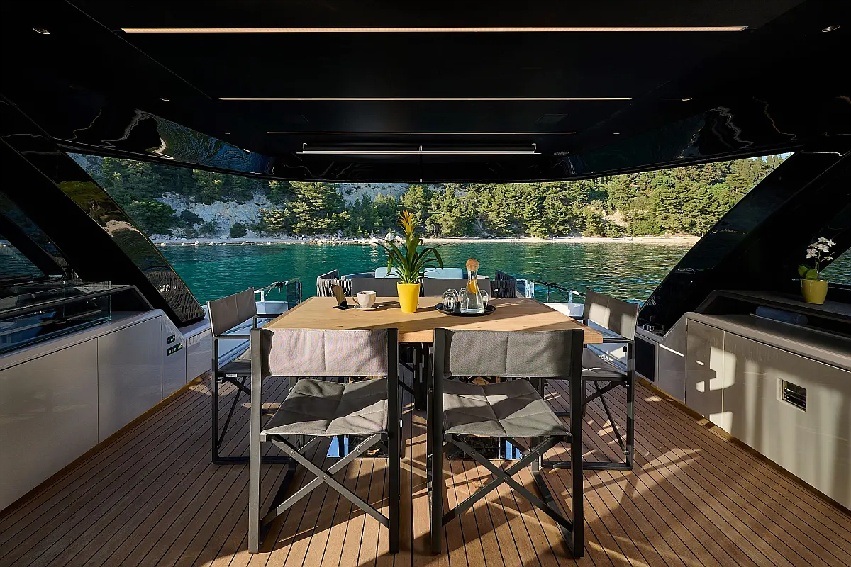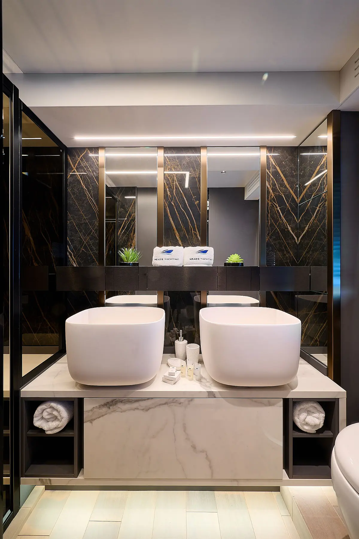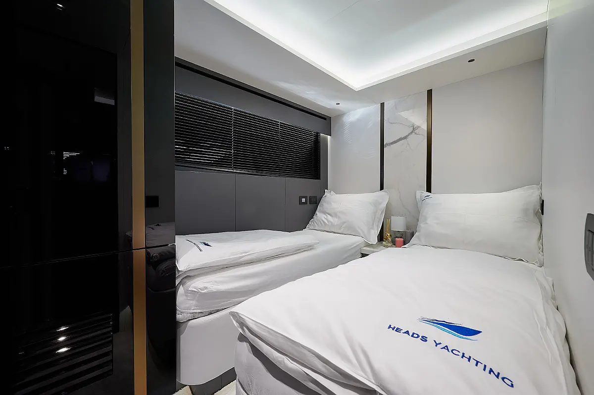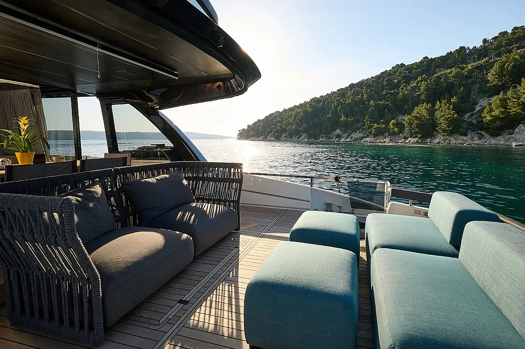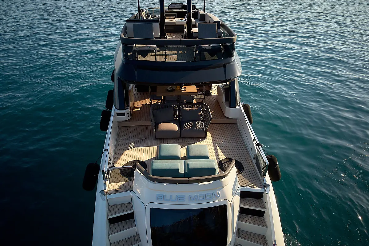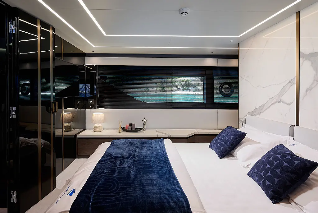 62 ft | Length 5 3+2 Cabins 8 6+2 Berths 4 3+1 Heads Technical Specifications Draught: 4 ft | Engine: 2 x 800 IPS Volvo Penta Water capacity: 1000.00 l Main sail: None Displacement: 27000.00 kg Fuel capacity: 2800.00 l Beam: 17 ft | Genoa: None Documents Download Brochure
