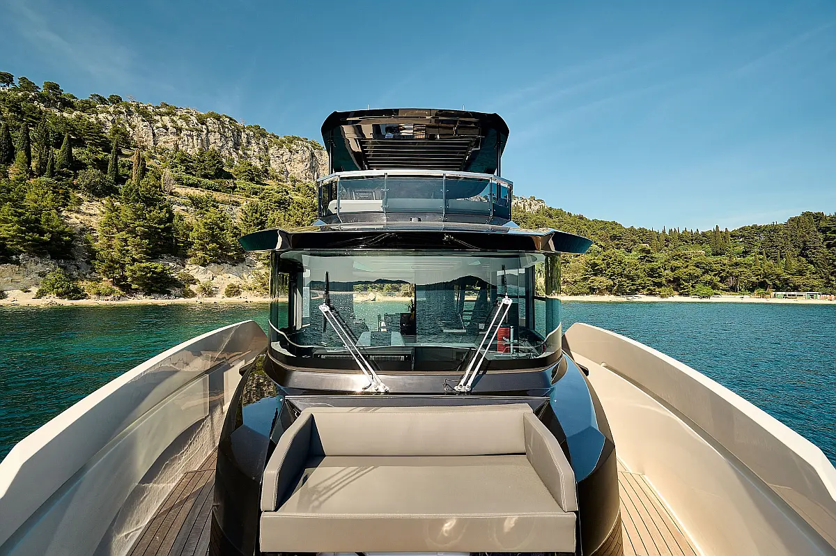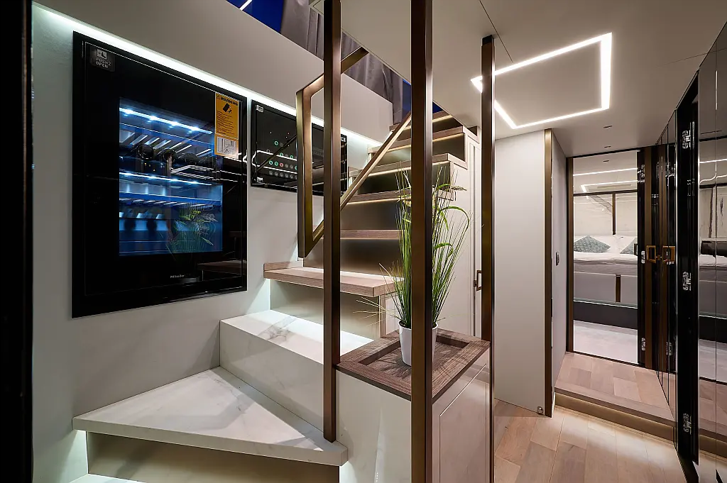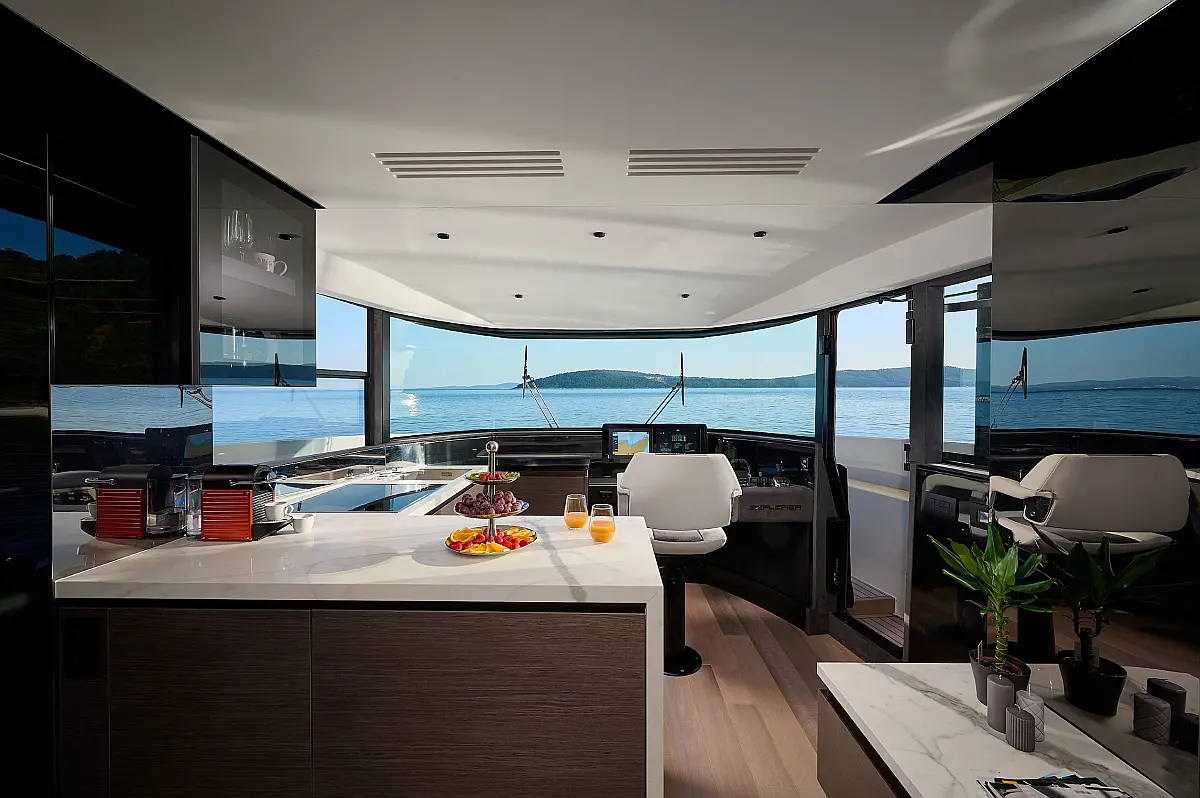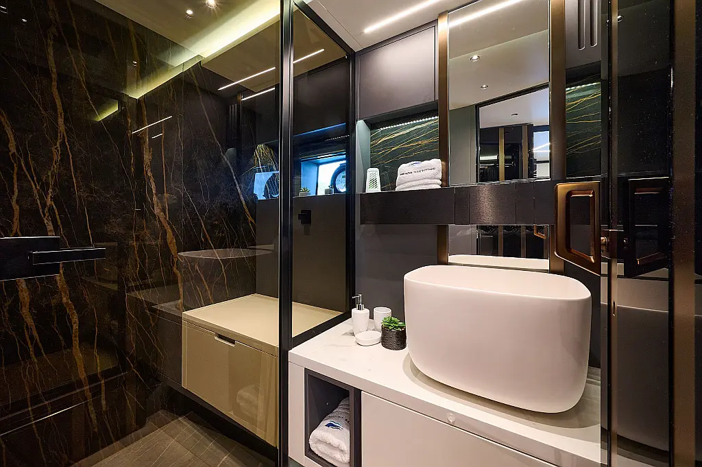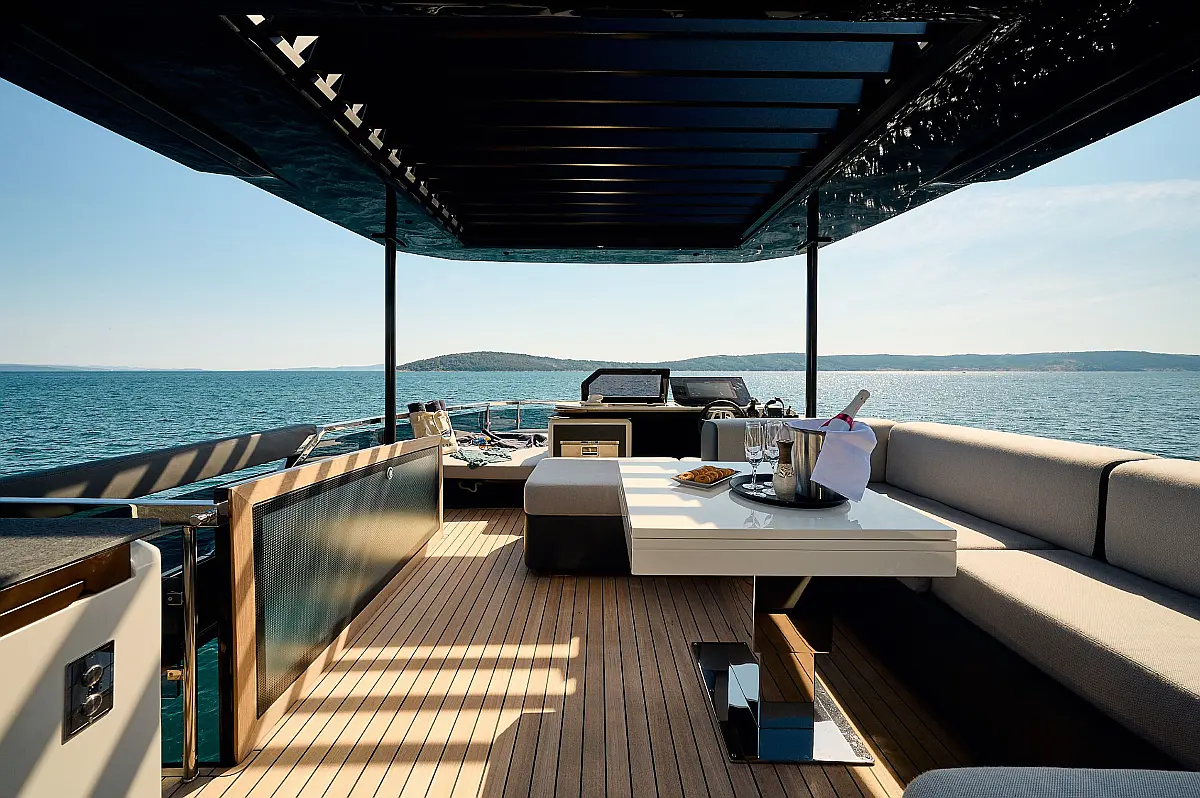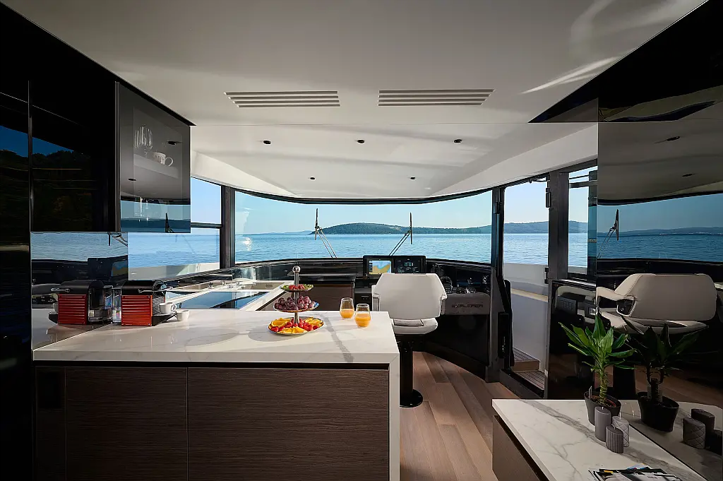 62 ft | Length 5 3+2 Cabins 8 6+2 Berths 4 3+1 Heads Technical Specifications Draught: 4 ft | Engine: 2 x 800 IPS Volvo Penta Water capacity: 1000.00 l Main sail: None Displacement: 27000.00 kg Fuel capacity: 2800.00 l Beam: 17 ft | Genoa: None Documents Download Brochure