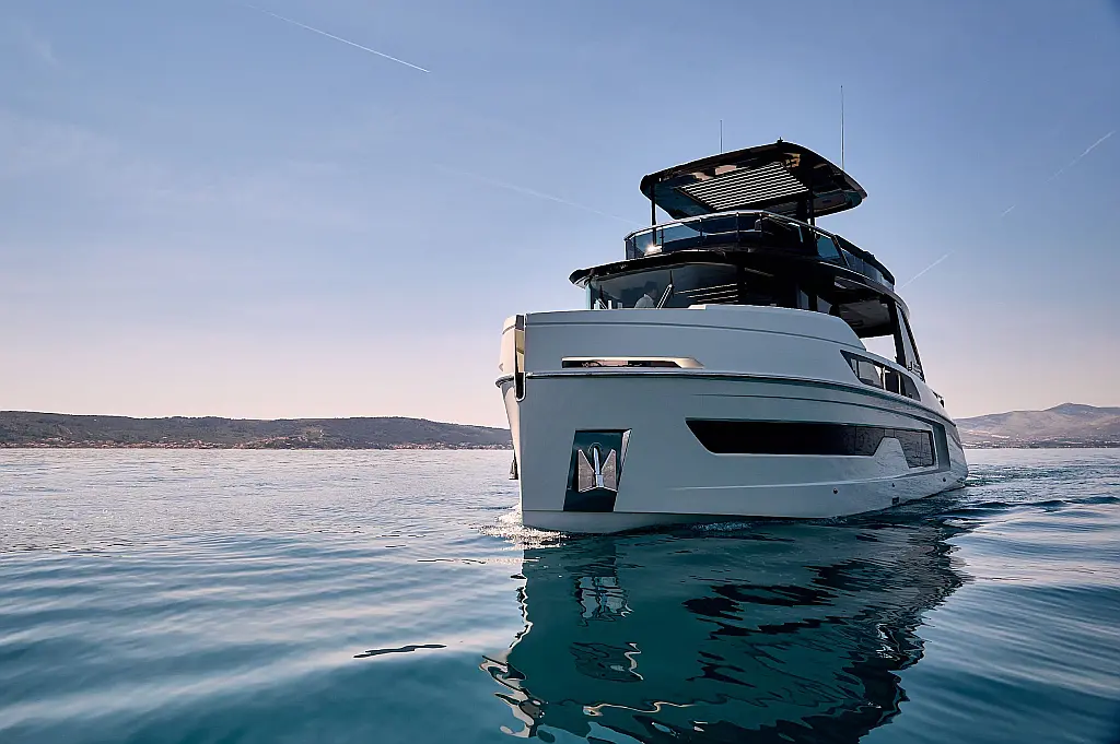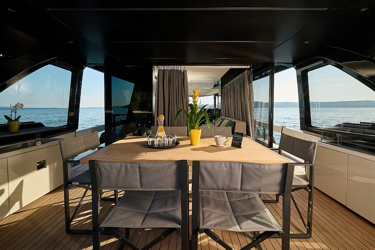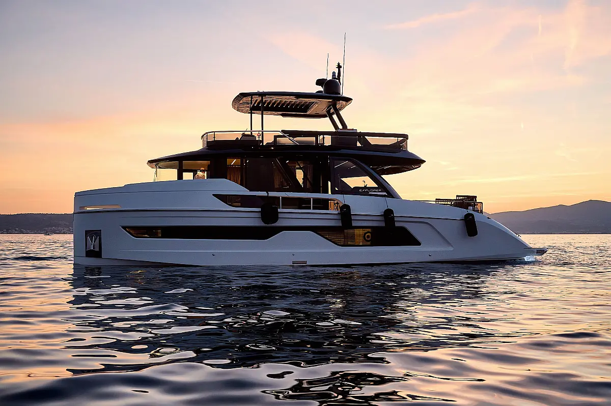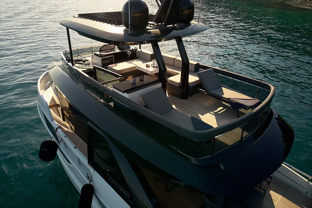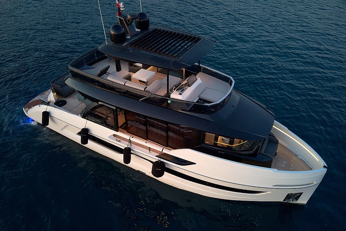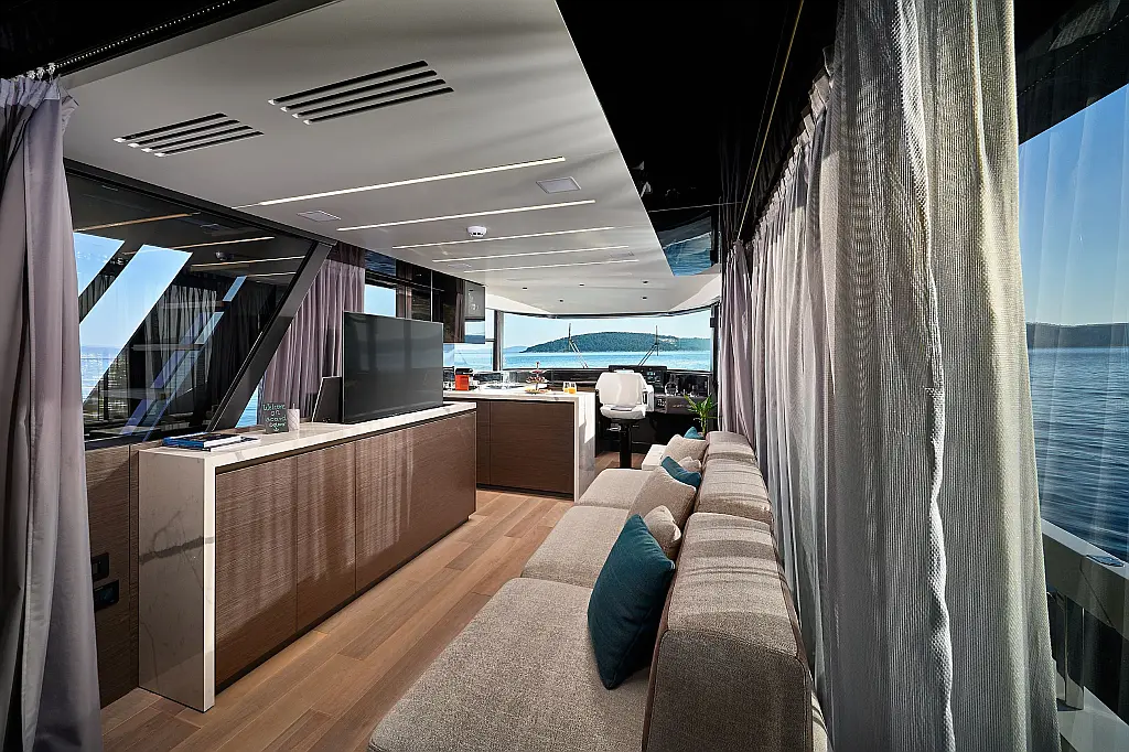 62 ft | Length 5 3+2 Cabins 8 6+2 Berths 4 3+1 Heads Technical Specifications Draught: 4 ft | Engine: 2 x 800 IPS Volvo Penta Water capacity: 1000.00 l Main sail: None Displacement: 27000.00 kg Fuel capacity: 2800.00 l Beam: 17 ft | Genoa: None Documents Download Brochure