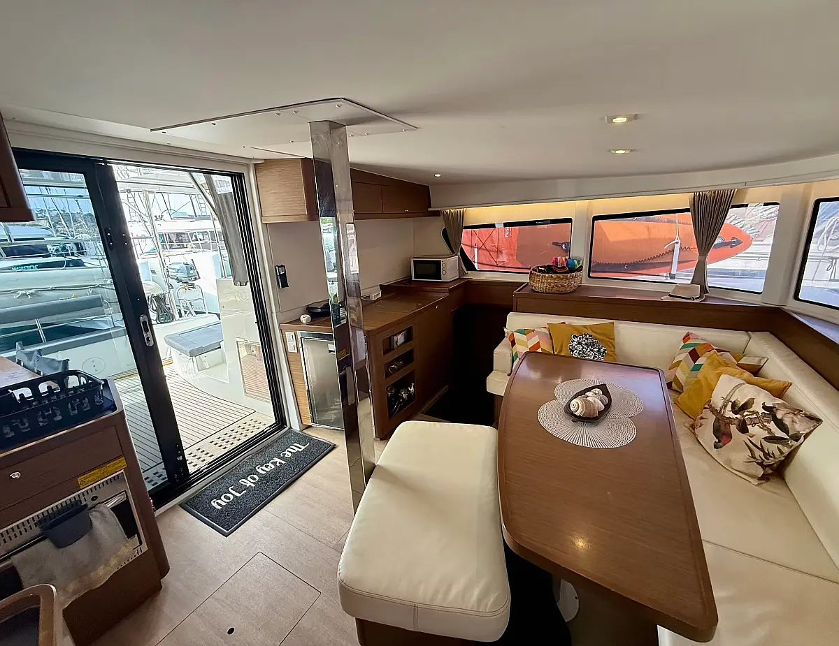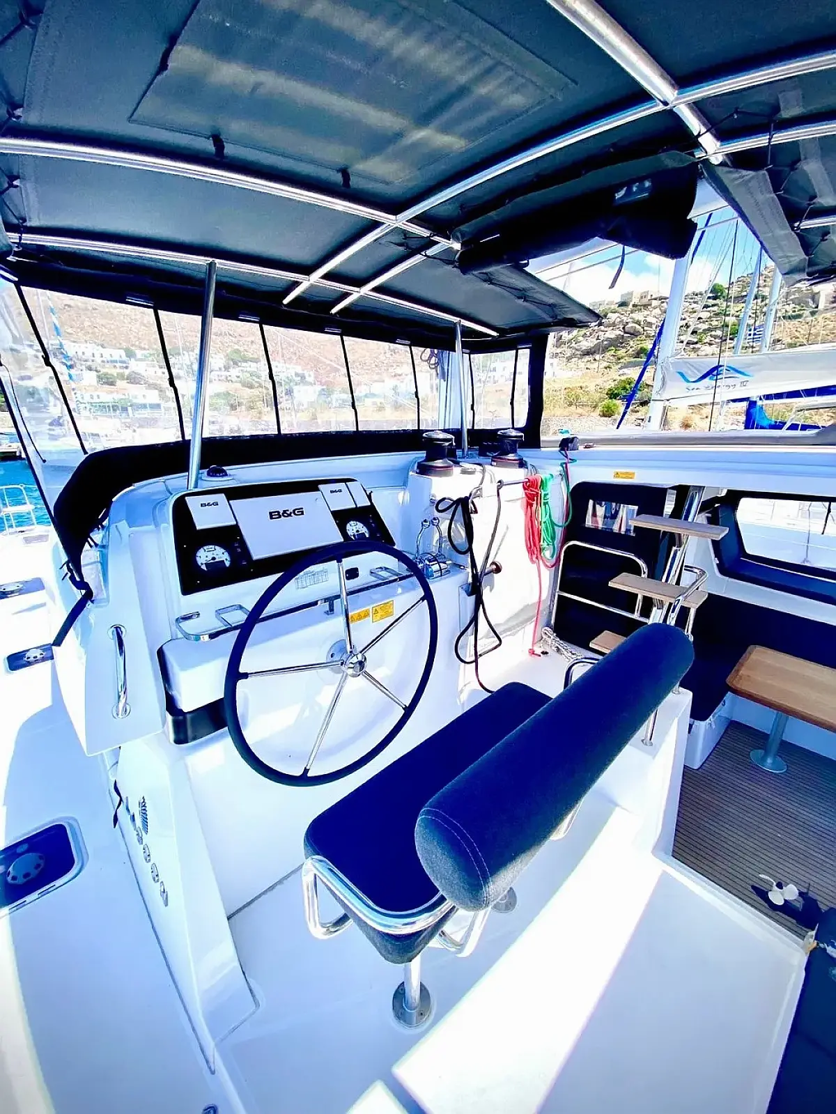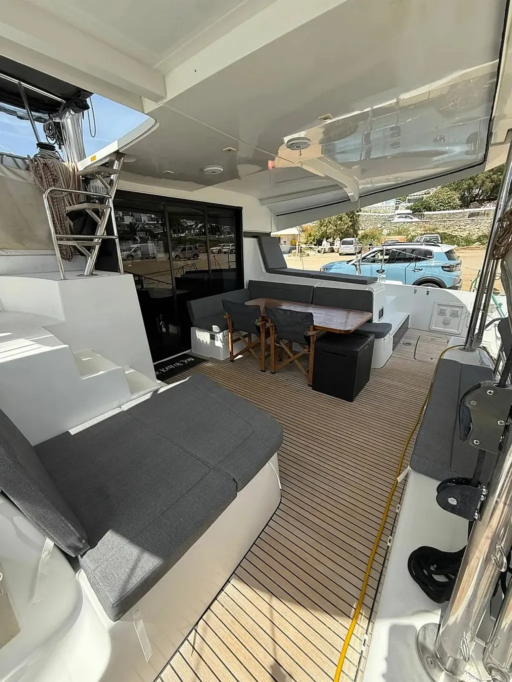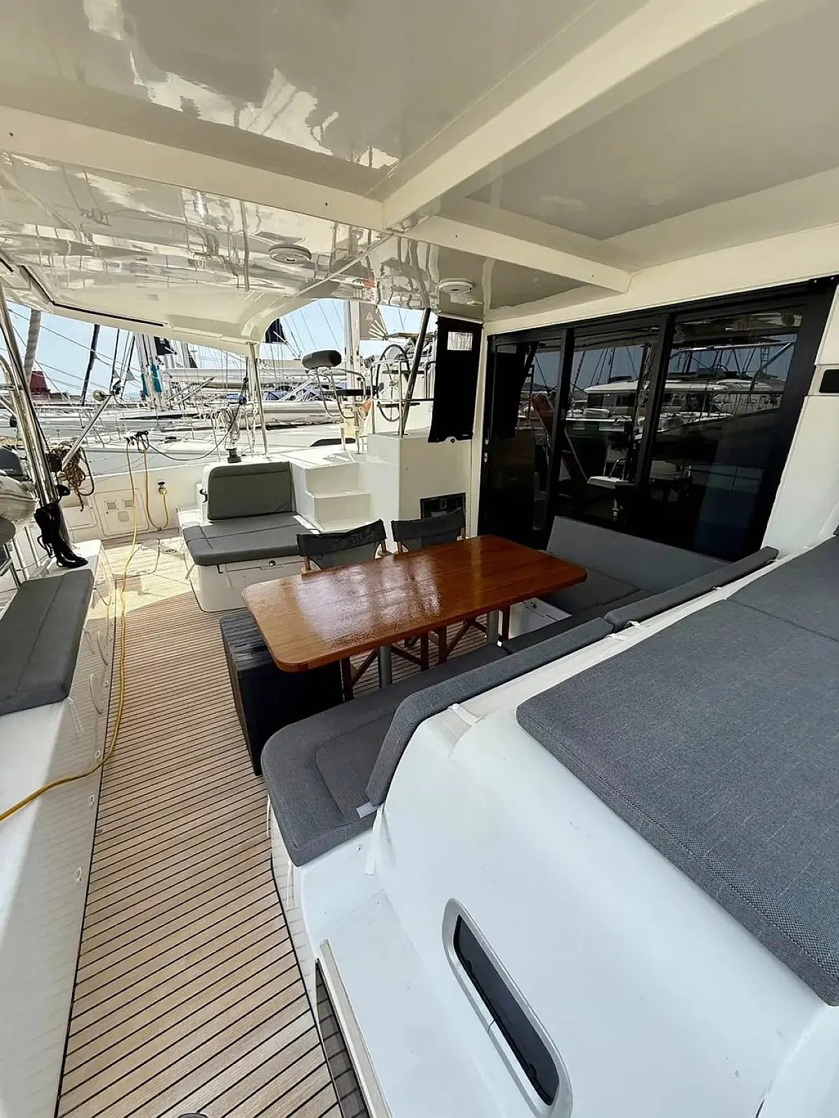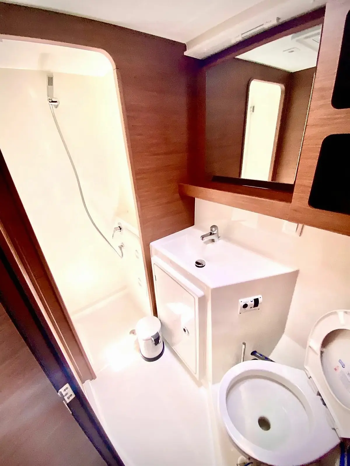 Refrigerator, Air condition, Generator, Inverter, Bimini, Sprayhood, Cockpit cushions, Cockpit speakers, Outboard engine, Coffee maker, Solar Panels, Teak deck, Water maker, Dinghy, Electric toilet, Ice maker