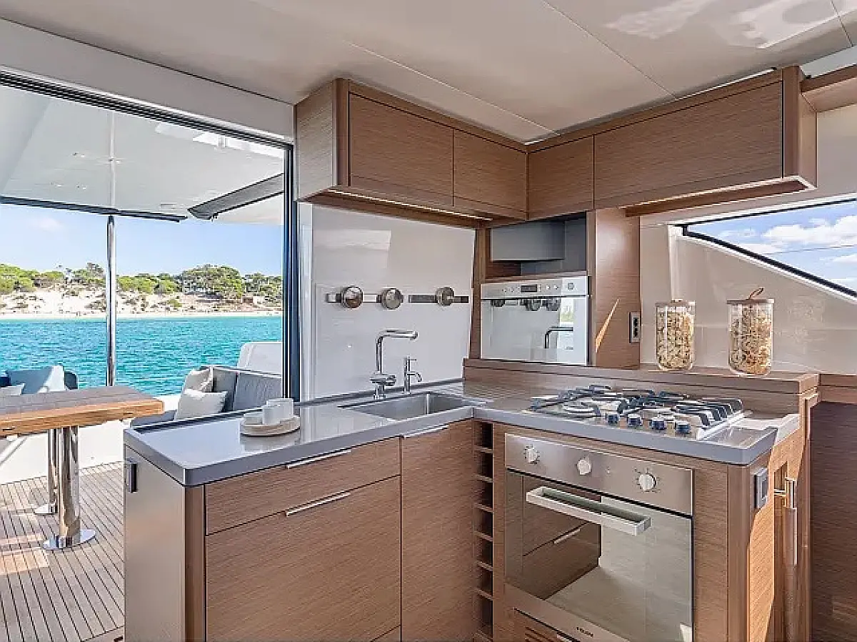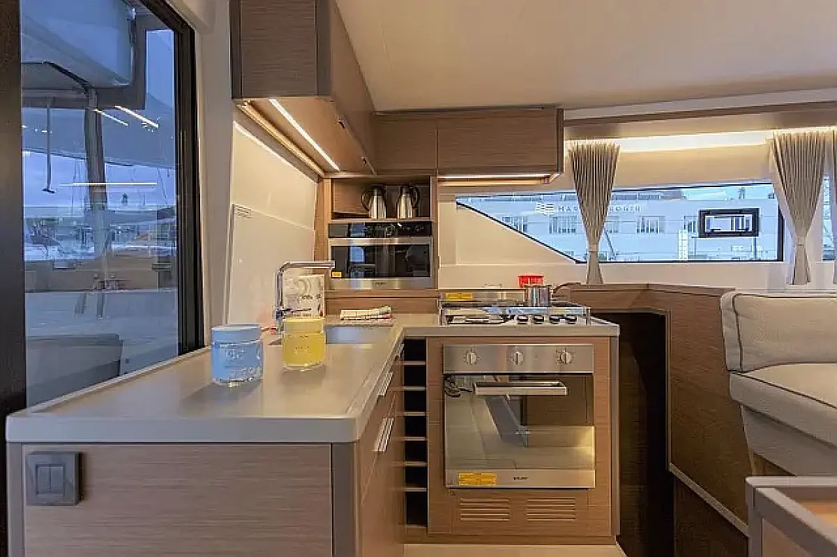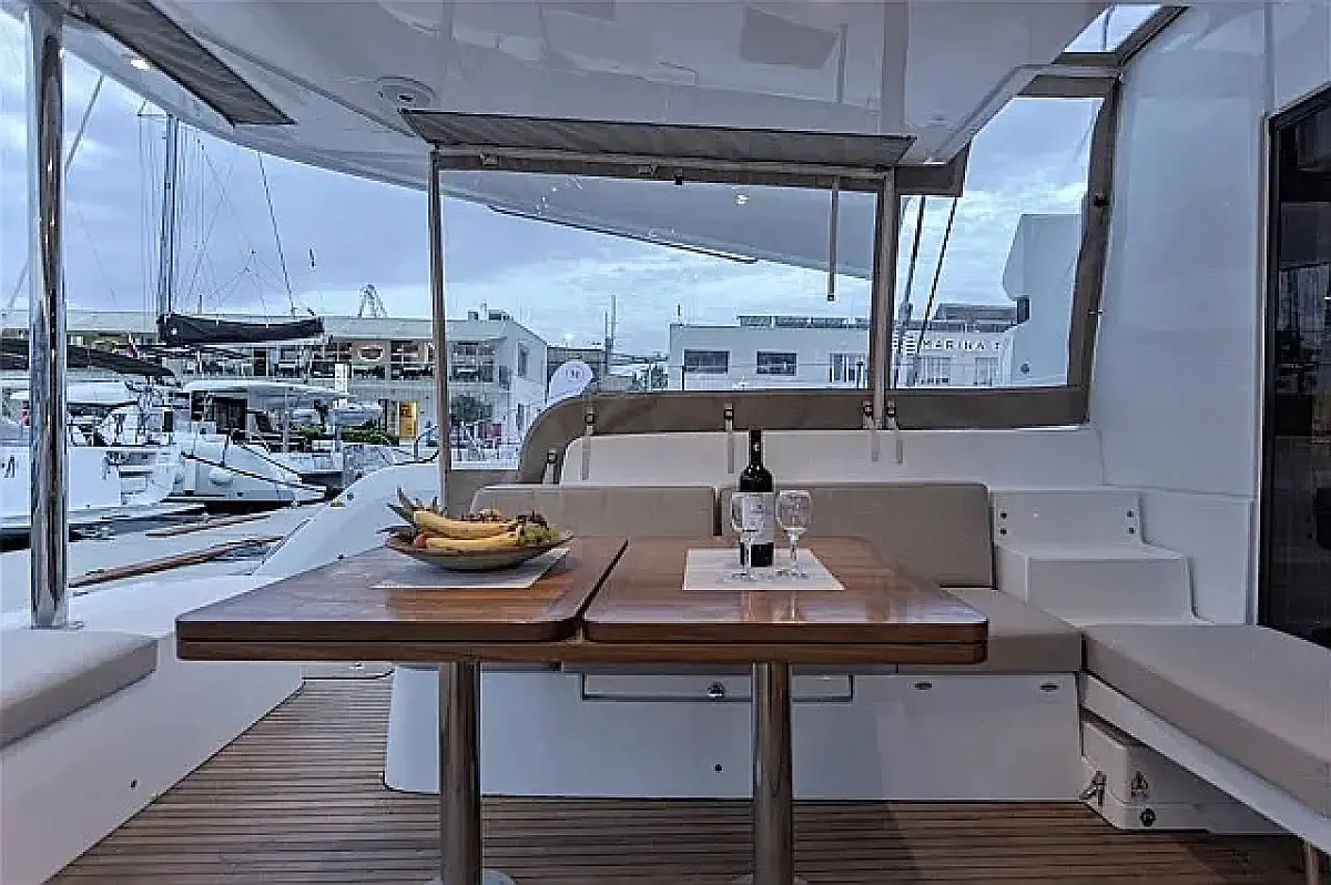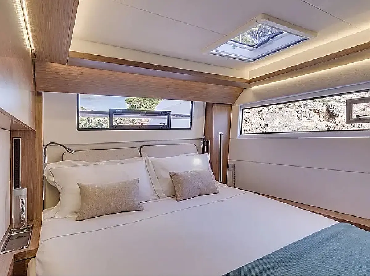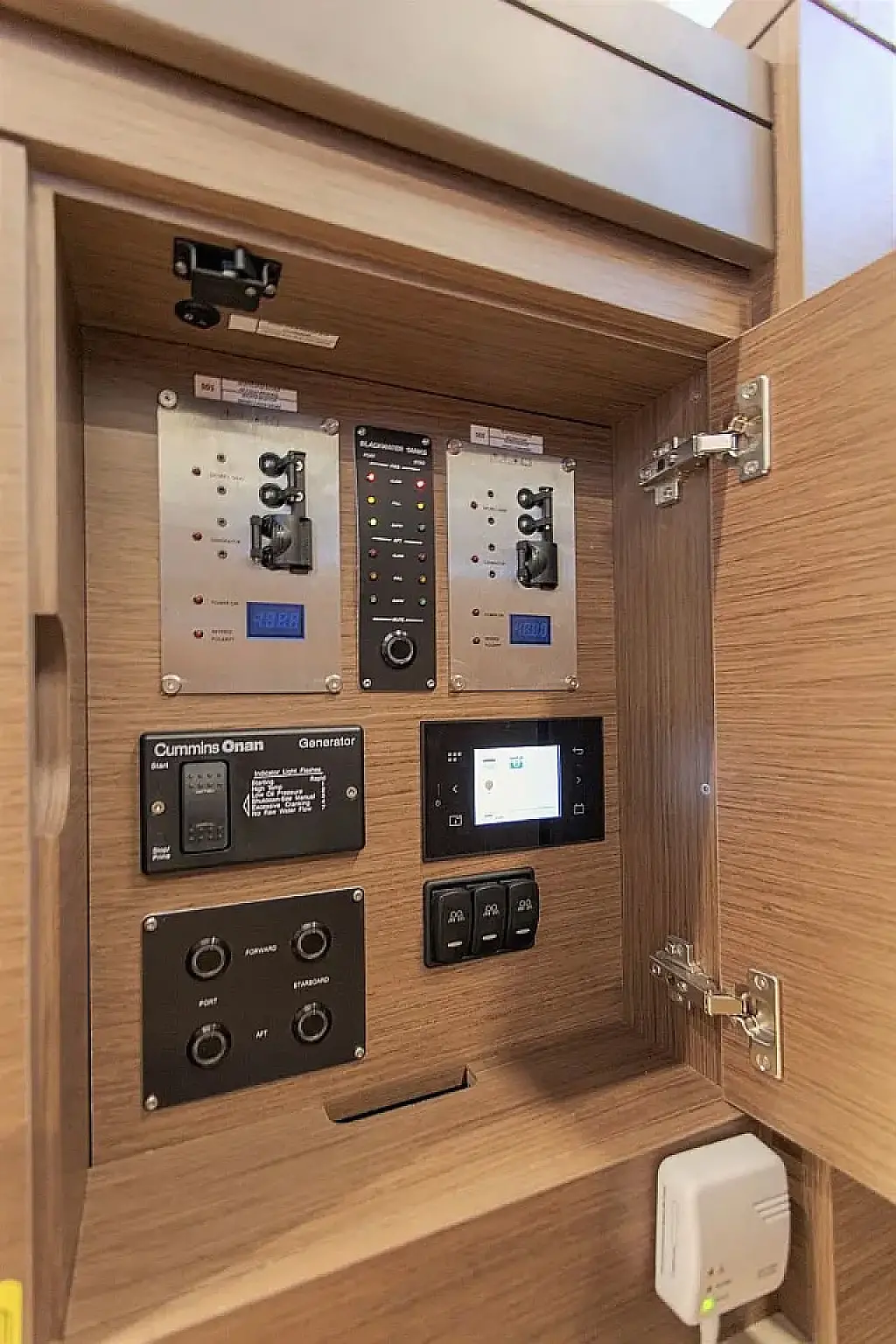 Air condition, Swimming platform, Cockpit cushions, Cockpit speakers, Dinghy, Coffee maker, Dishwasher, Refrigerator, Electric toilet, Generator, Heating, Holding tank, Ice maker, Inverter, Outboard engine, Teak Cockpit, Water maker, Wi-Fi & Internet