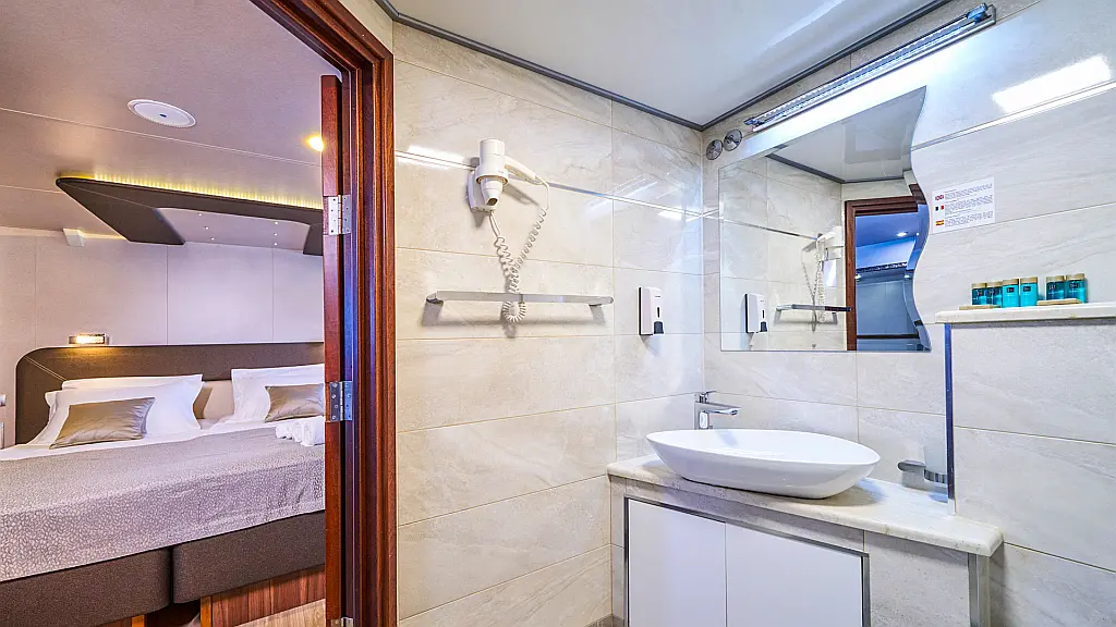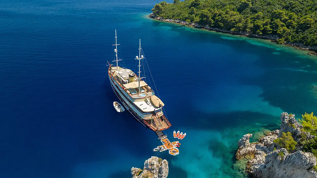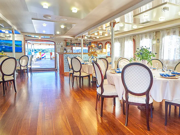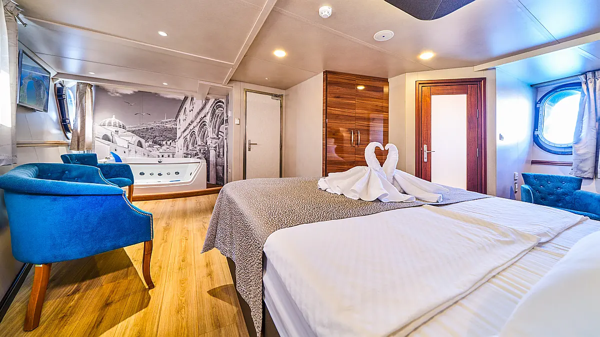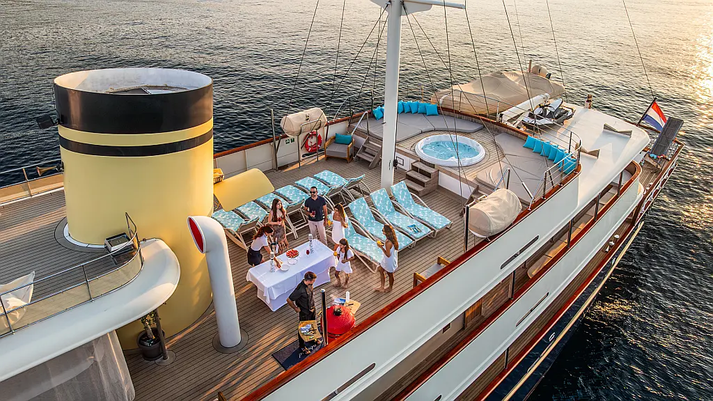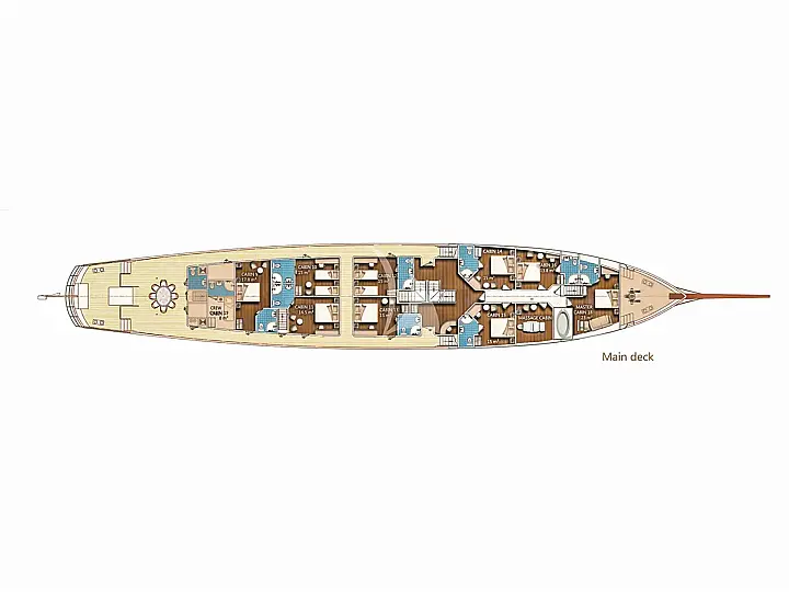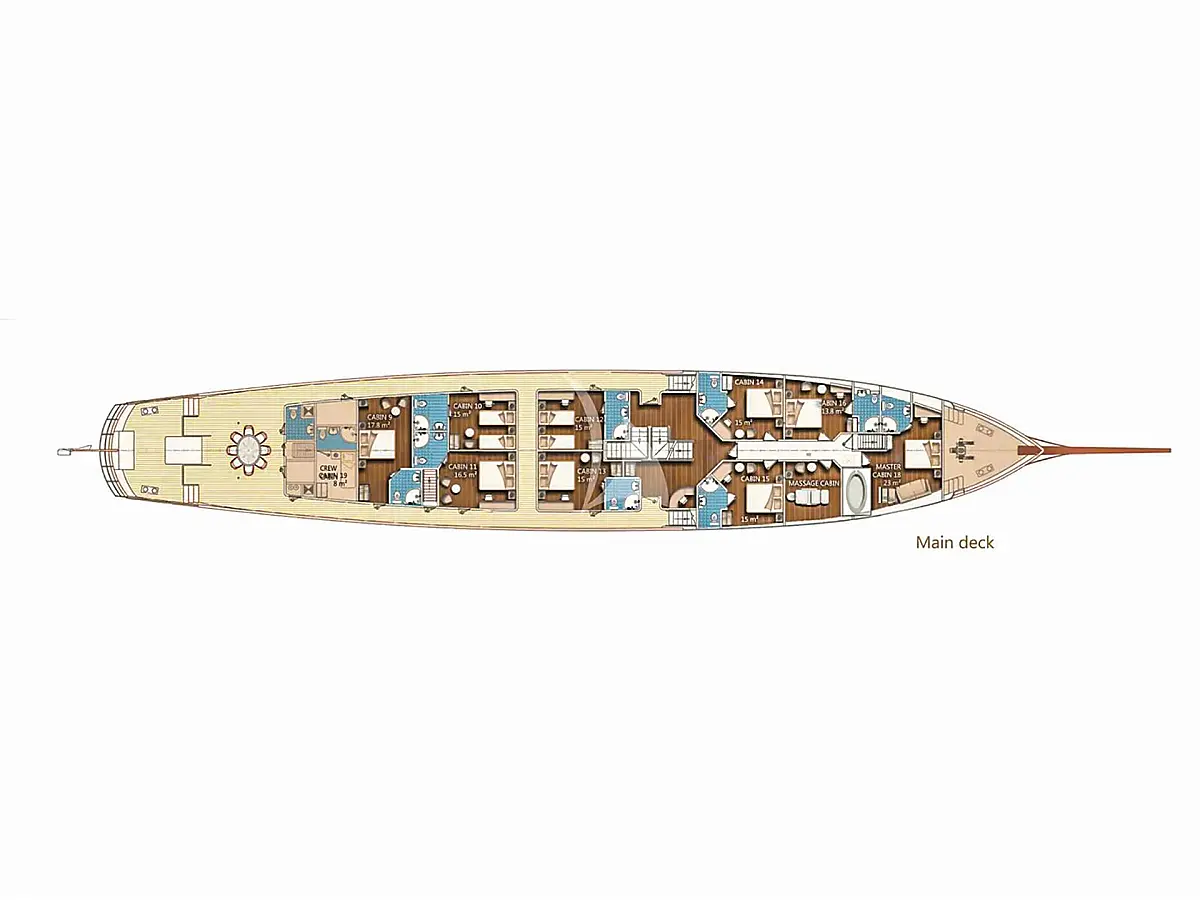 175 ft | Length 18 (7 Double Cabins, 5 Twin Cabins, 6 Convertible Cabins) + crew Cabins 36 Berths 18 Heads Technical Specifications Draught: 13 ft | Engine: N/A Water capacity: N/A Main sail: None Displacement: N/A Fuel capacity: N/A Beam: 29 ft | Genoa: None Equipment Comfort: Dinghy, Air condition, Wi-Fi & Internet Entertainment: Stand up paddle, TV Documents Download Brochure Download Brochure Download Brochure