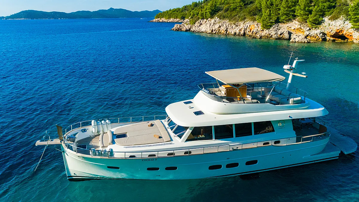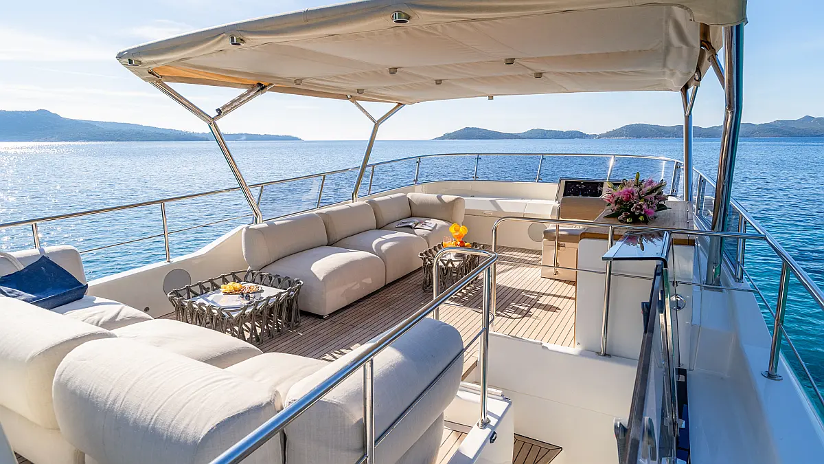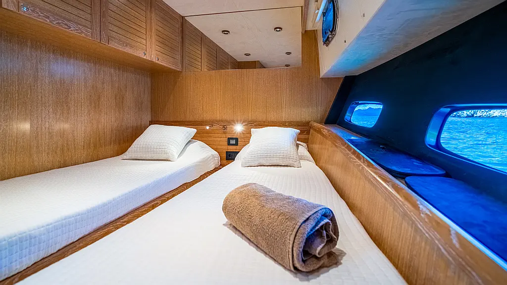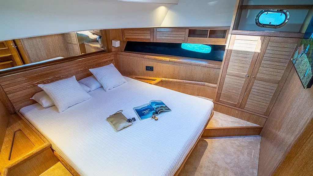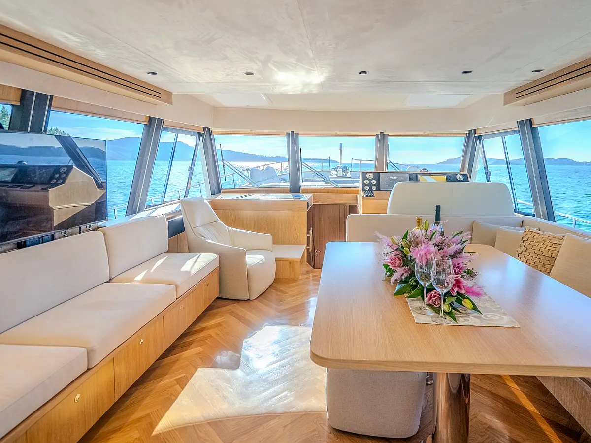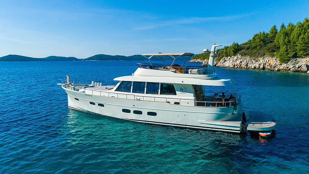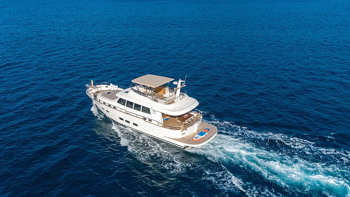 70 ft | Length 3 Cabins 6 Berths 3 Heads Technical Specifications Draught: 5 ft | Engine: N/A Water capacity: N/A Main sail: None Displacement: N/A Fuel capacity: N/A Beam: 19 ft | Genoa: None Equipment Entertainment: Stand up paddle, TV Comfort: Dinghy, Flybridge Documents Download Brochure Download Brochure