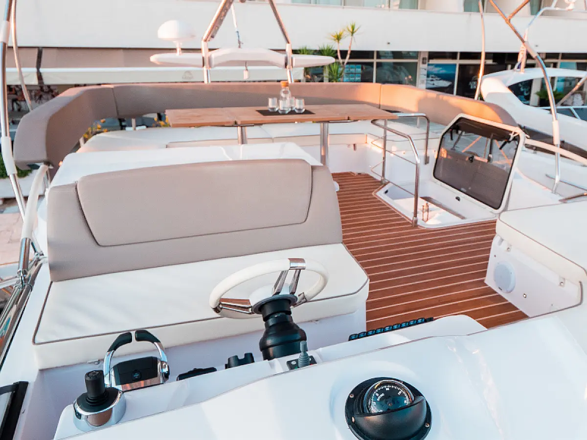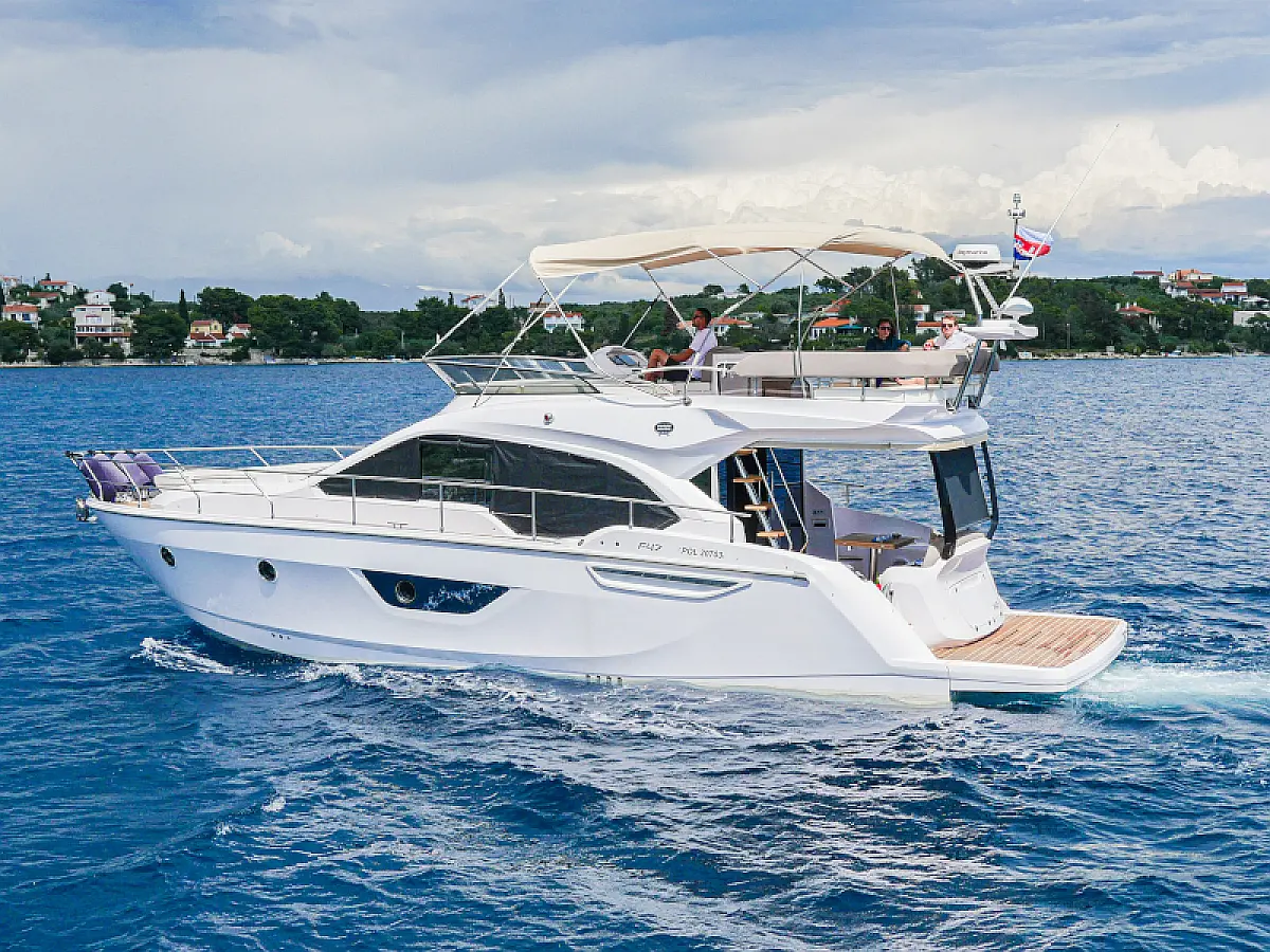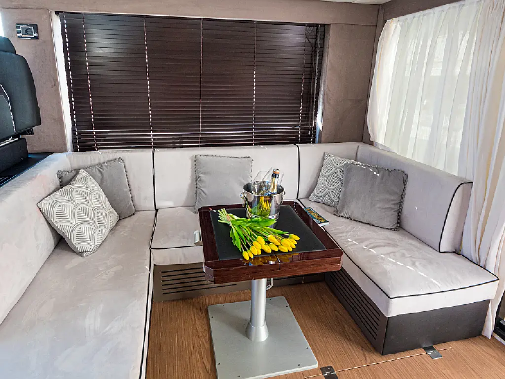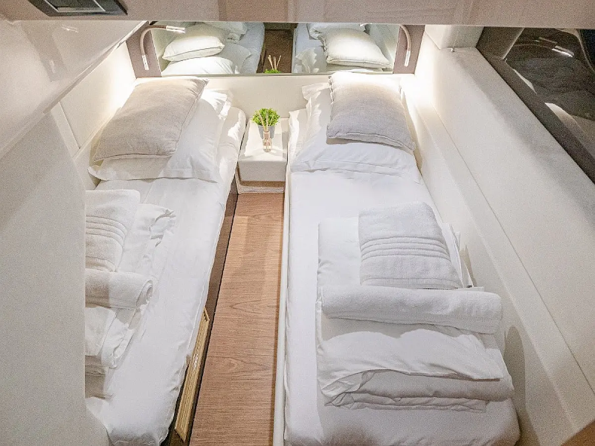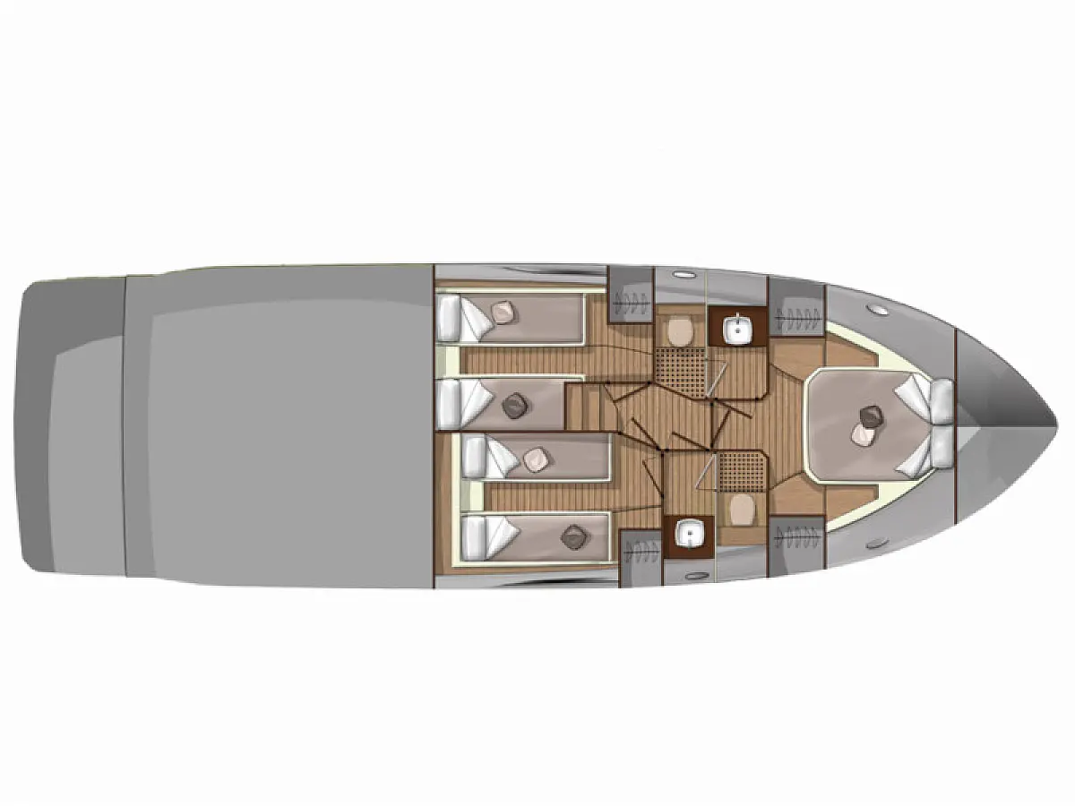 47 ft | Length 3 Cabins 8 6+2 Berths 2 Heads Technical Specifications Draught: 4 ft | Engine: 2x435 hp 2x Volvo Penta D6 IPS 600 Water capacity: 560.00 l Main sail: None Displacement: N/A Fuel capacity: 1272.00 l Beam: 14 ft | Genoa: None Equipment Comfort: Bimini Documents Download Brochure