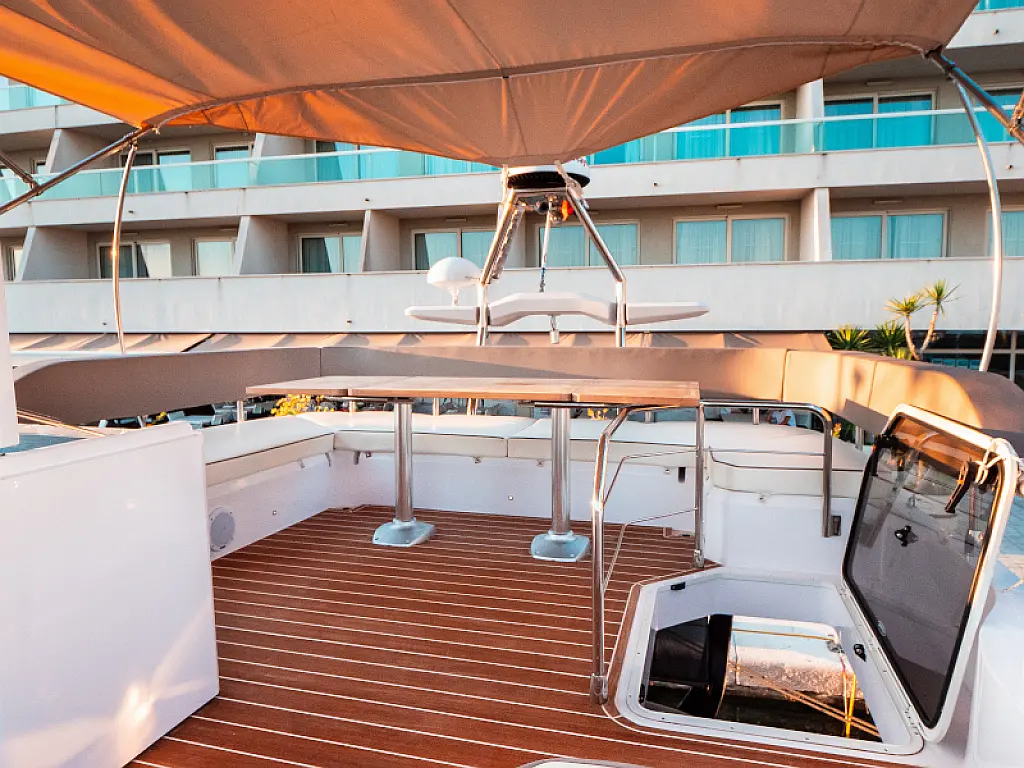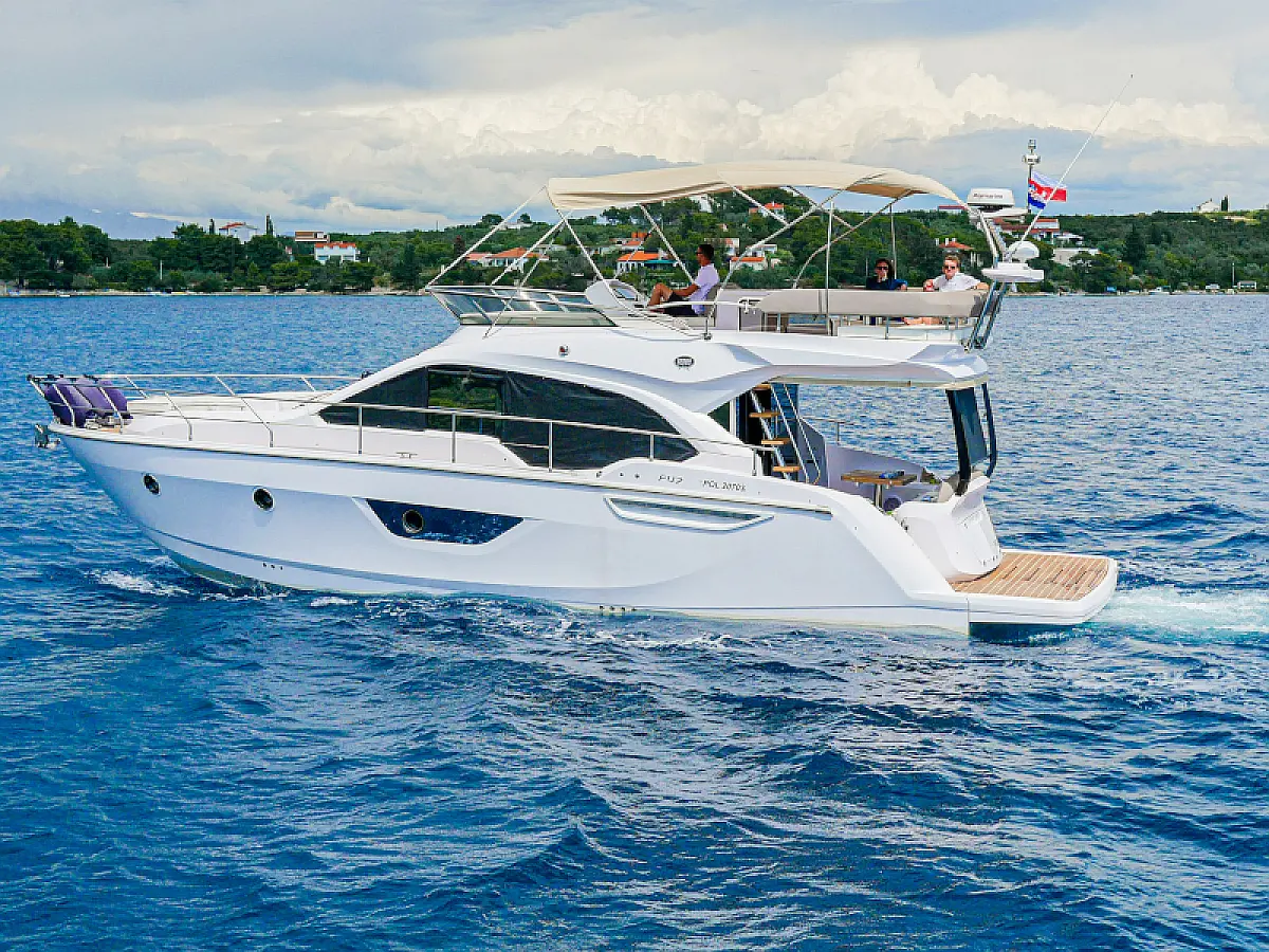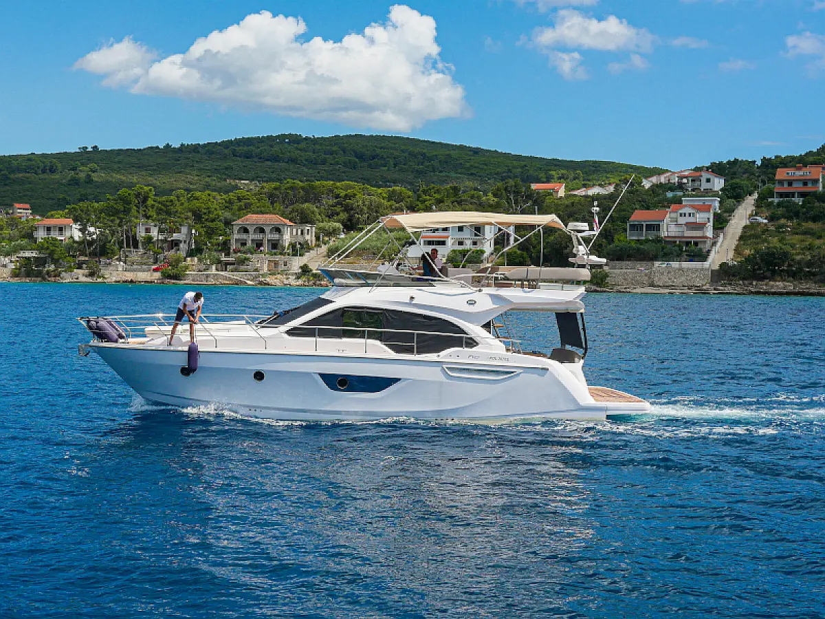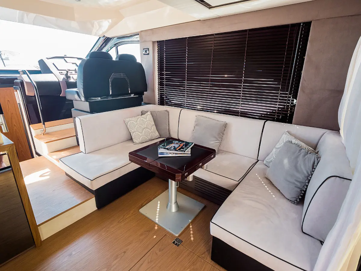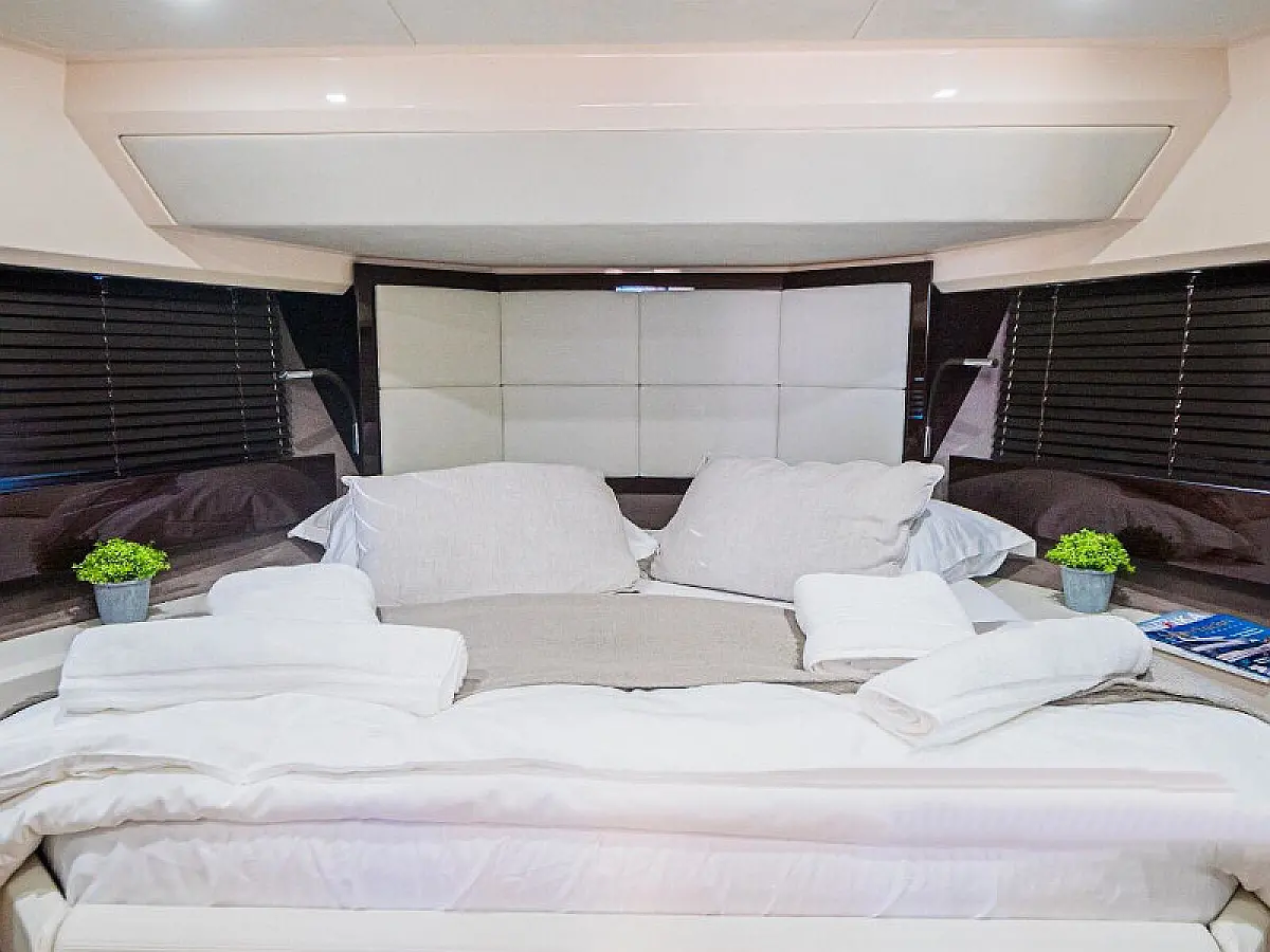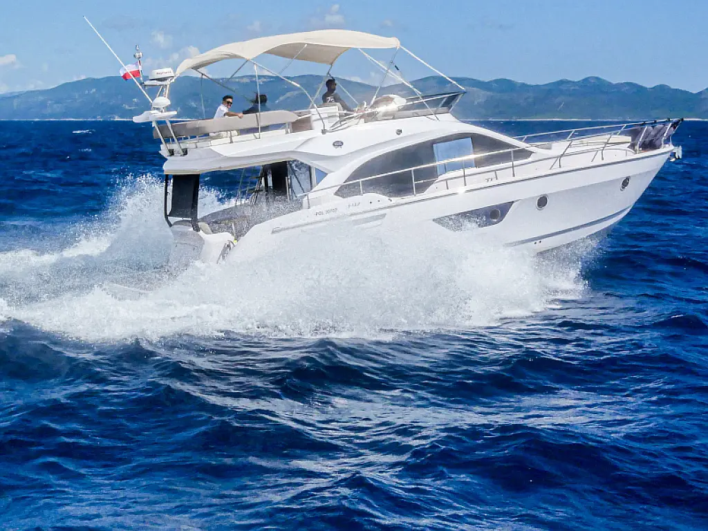 47 ft | Length 3 Cabins 8 6+2 Berths 2 Heads Technical Specifications Draught: 4 ft | Engine: 2x435 hp 2x Volvo Penta D6 IPS 600 Water capacity: 560.00 l Main sail: None Displacement: N/A Fuel capacity: 1272.00 l Beam: 14 ft | Genoa: None Equipment Comfort: Bimini Documents Download Brochure