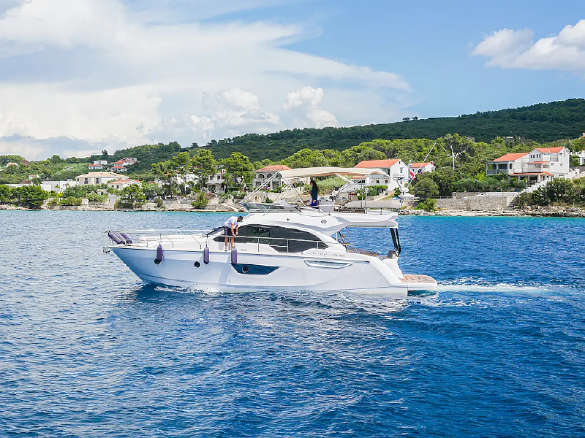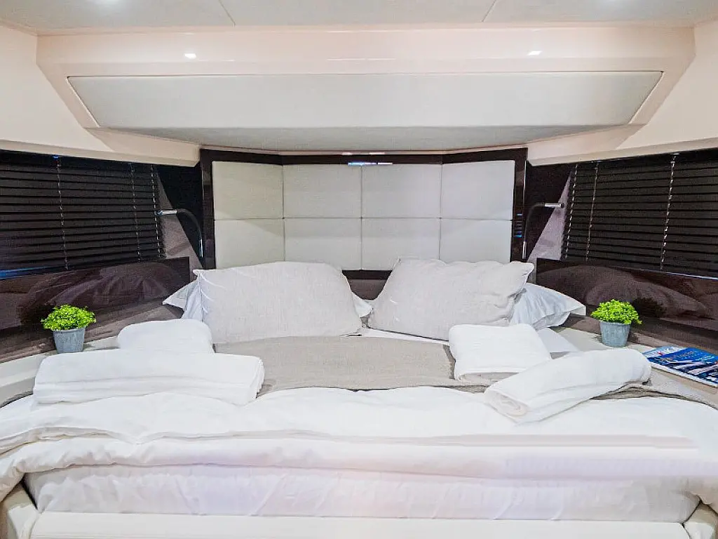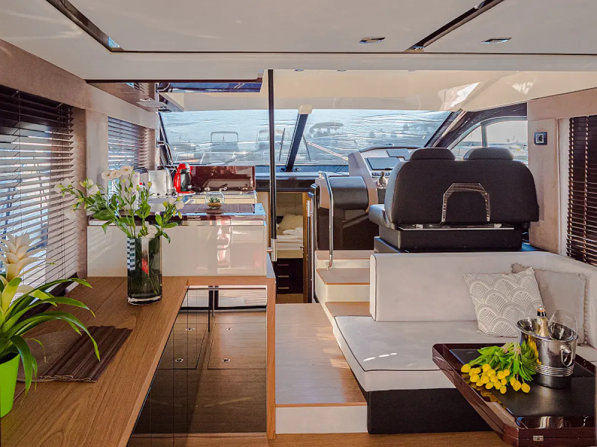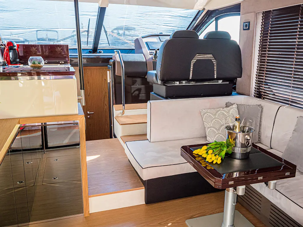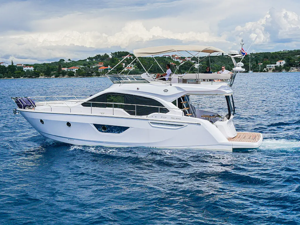 47 ft | Length 3 Cabins 8 6+2 Berths 2 Heads Technical Specifications Draught: 4 ft | Engine: 2x435 hp 2x Volvo Penta D6 IPS 600 Water capacity: 560.00 l Main sail: None Displacement: N/A Fuel capacity: 1272.00 l Beam: 14 ft | Genoa: None Equipment Comfort: Bimini Documents Download Brochure