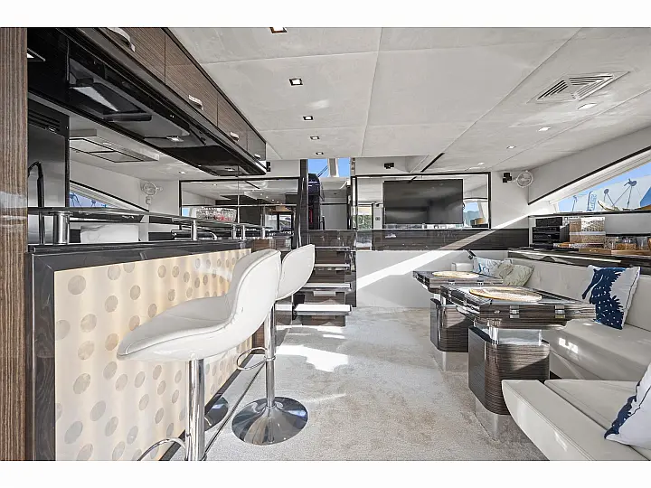 Flybridge, Dinghy, Hydraulic gangway, Electric toilet, Refrigerator, Generator, Air condition, Water maker