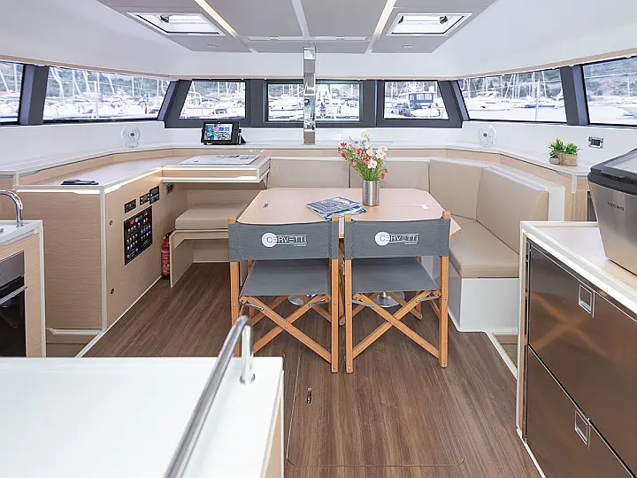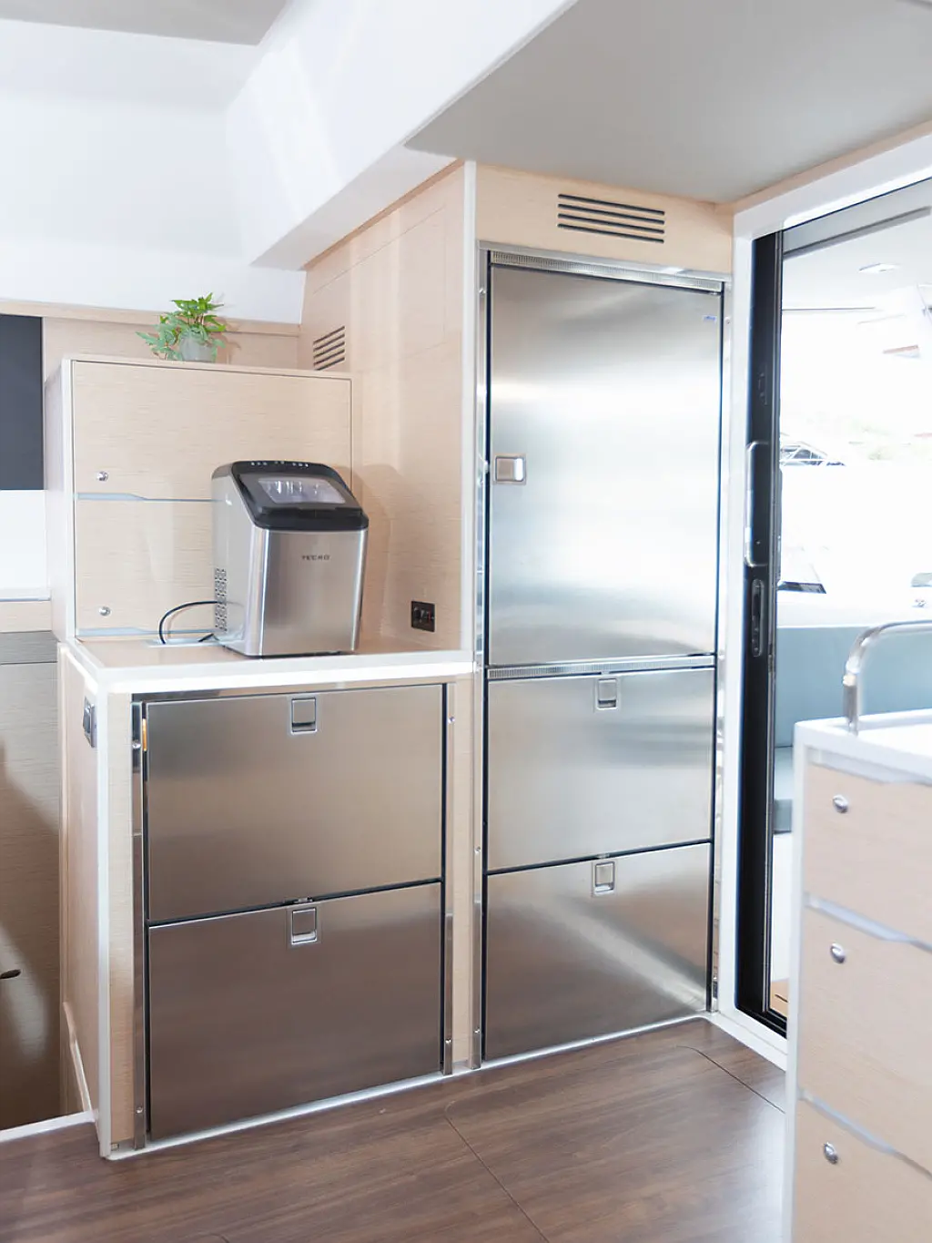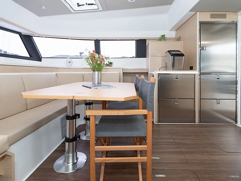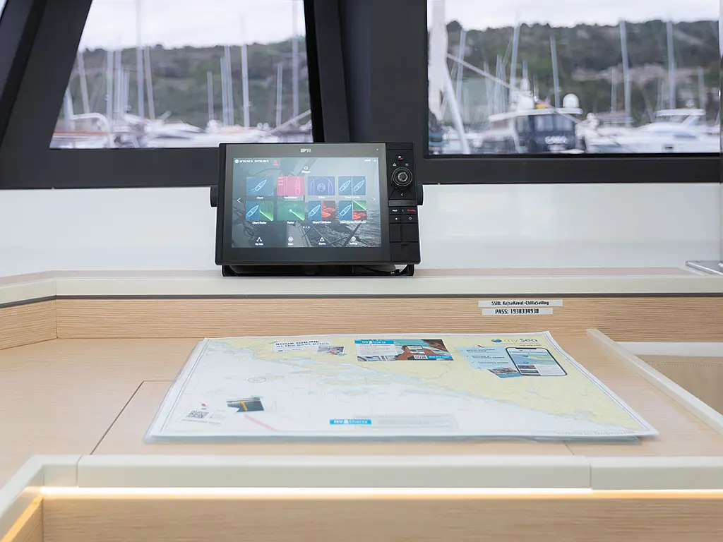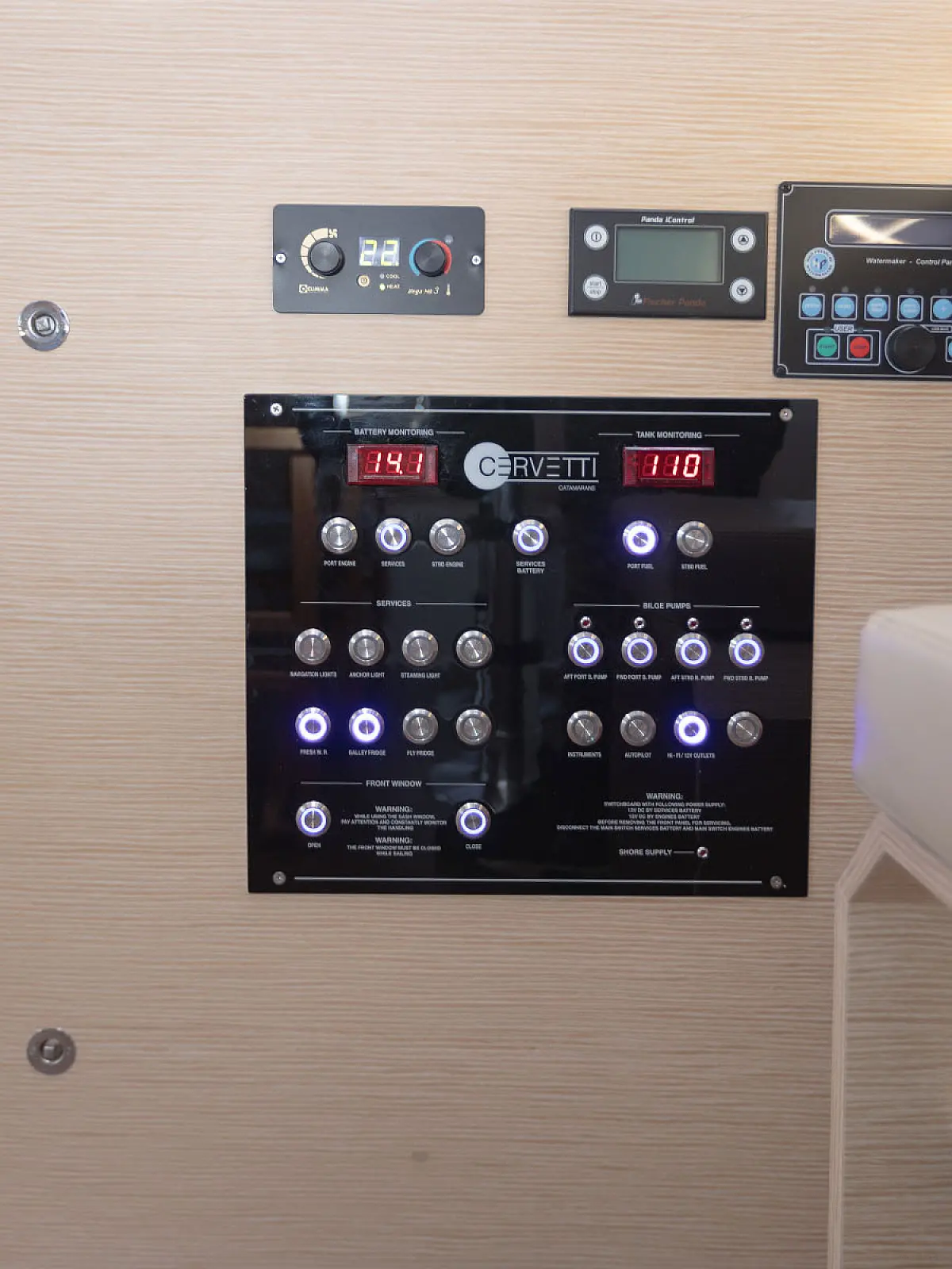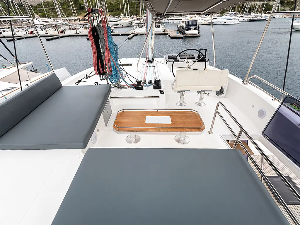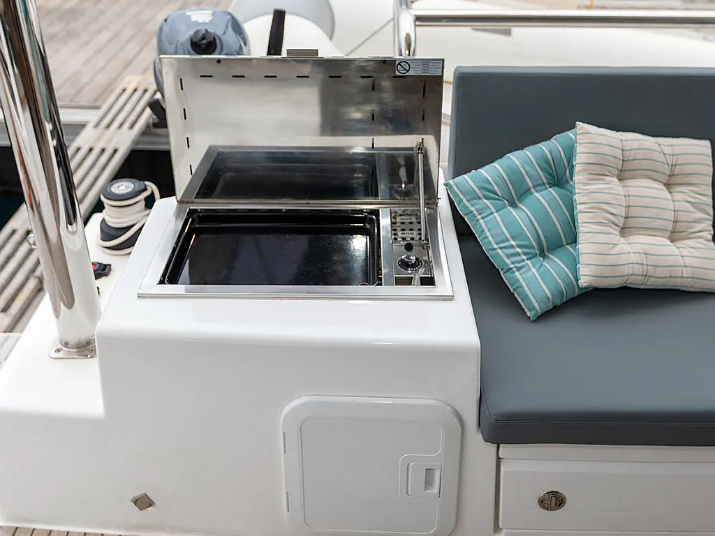 Teak Cockpit, Cockpit cushions, Teak deck, Flybridge, Refrigerator, Coffee maker, Ice maker, Generator, Air condition, Solar Panels, Inverter, Water maker, Electric winches