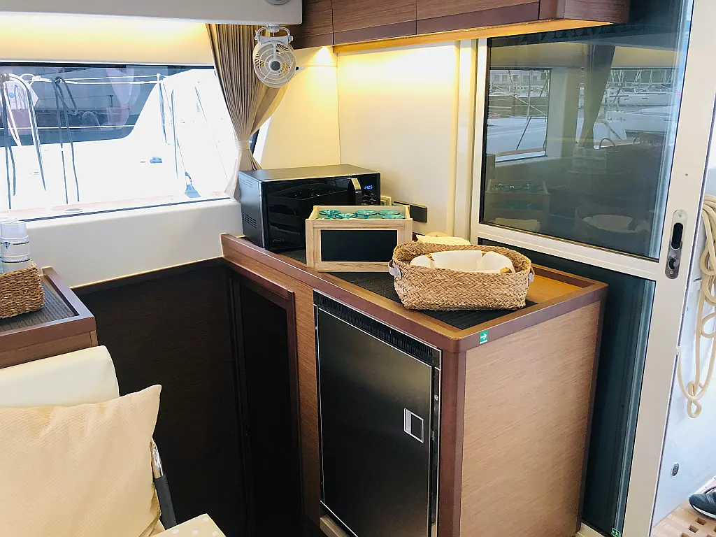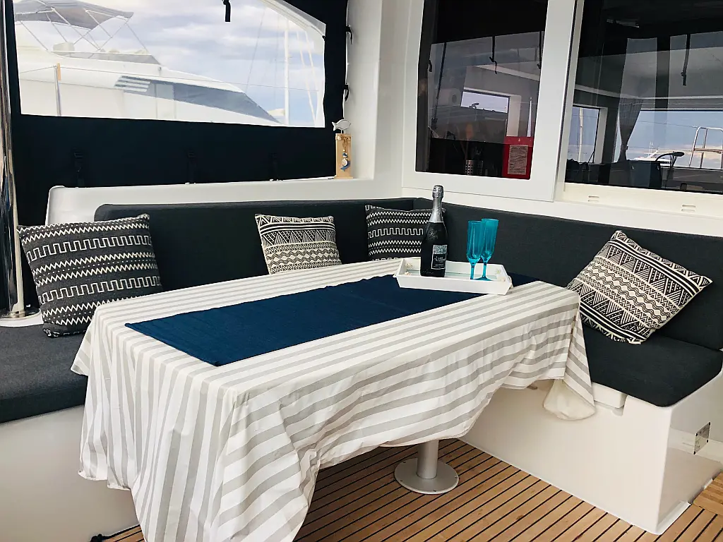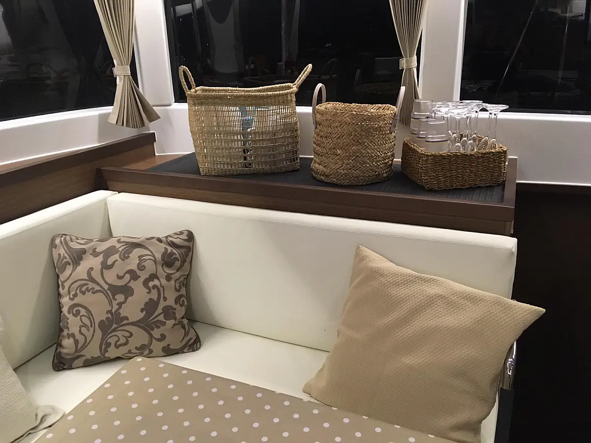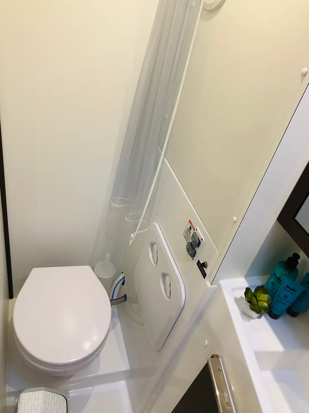 Bimini, Inverter, Cockpit speakers, Teak deck, Dinghy, Electric toilet, Refrigerator