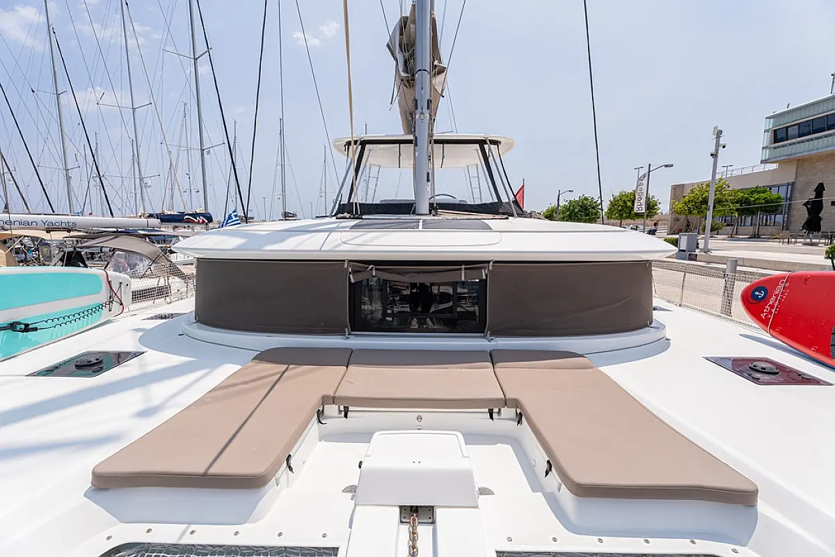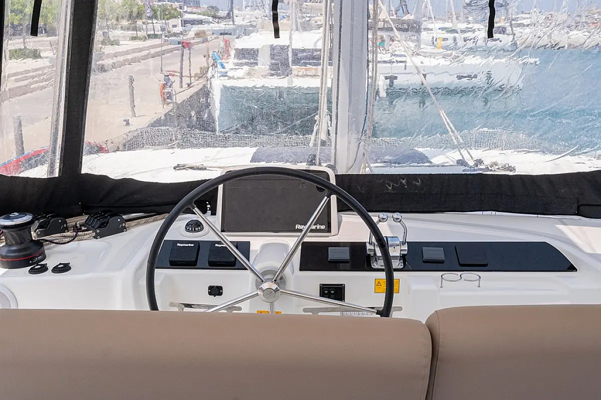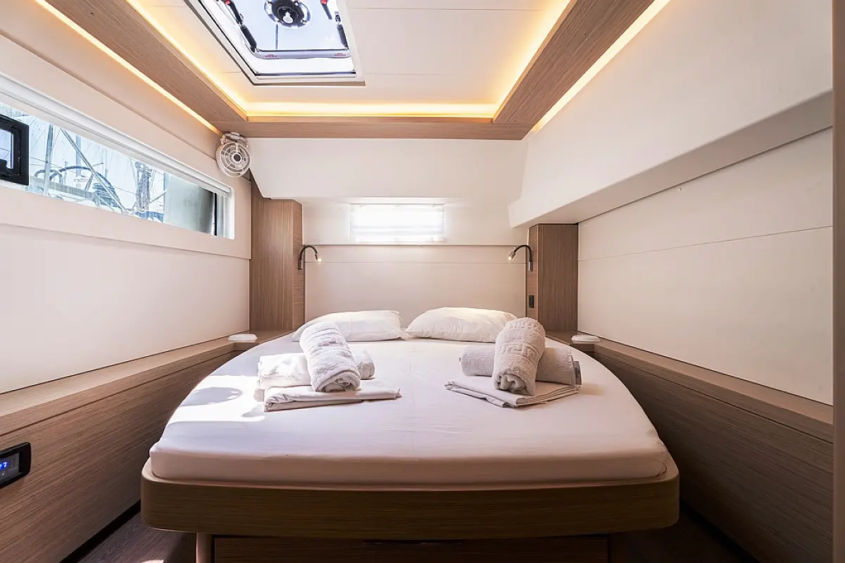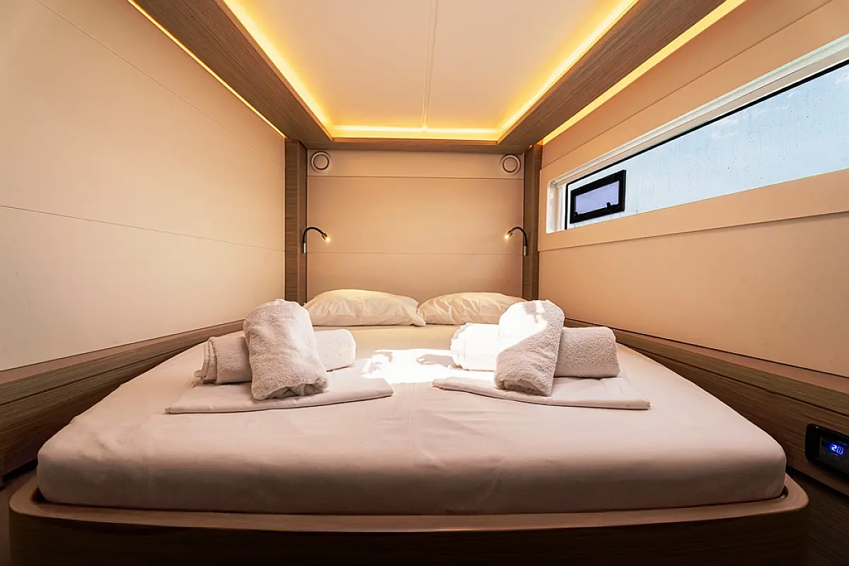 Pomoćni čamac, Vanbrodski motor, Bimini, Jastuci u kokpitu, Električna vitla, Solarni paneli, Klima, Hladnjak, Električni WC, Generator, Desalinizator