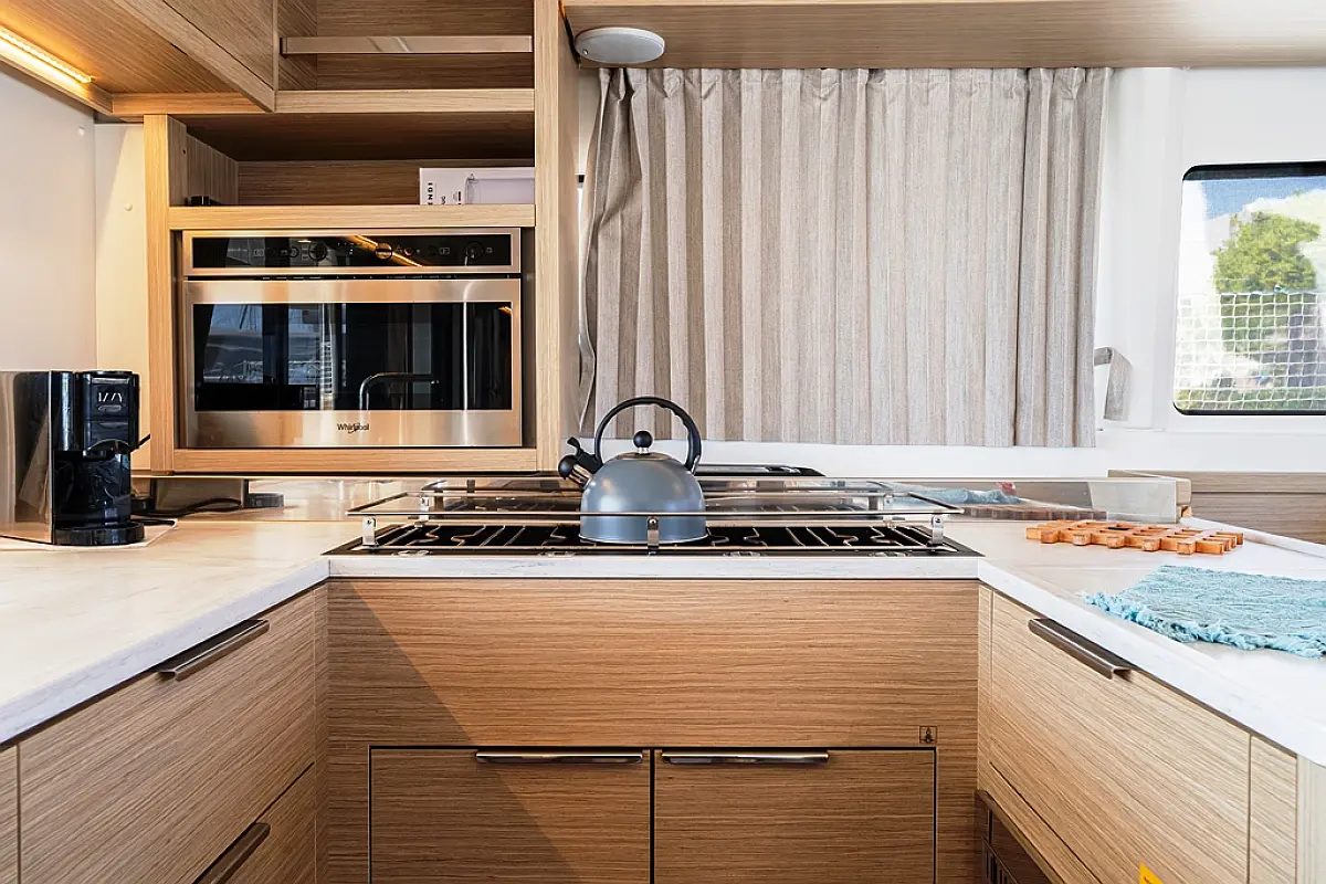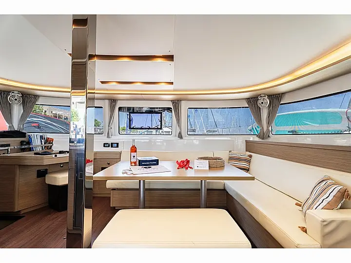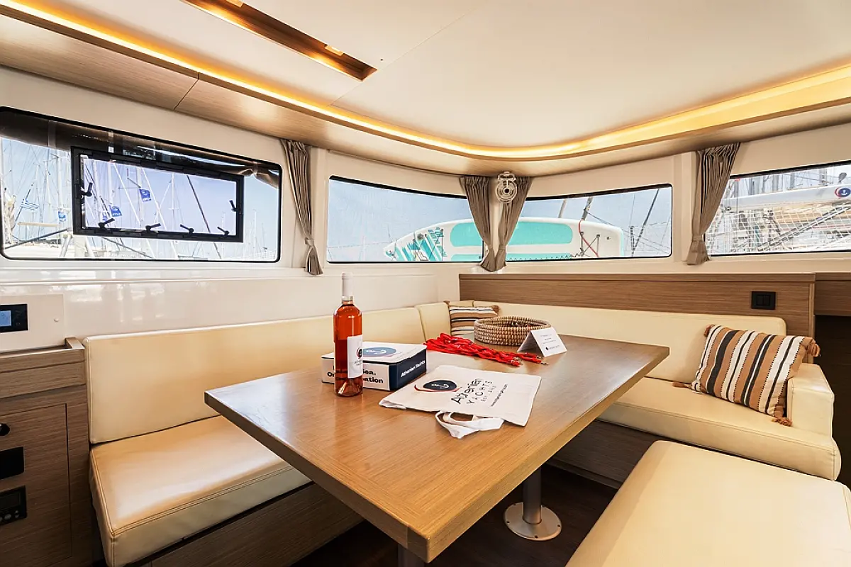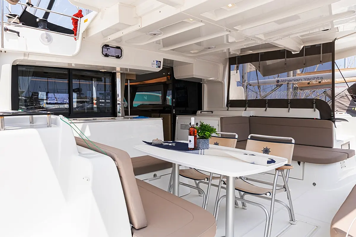 Pomoćni čamac, Vanbrodski motor, Bimini, Jastuci u kokpitu, Električna vitla, Solarni paneli, Klima, Hladnjak, Električni WC, Generator, Desalinizator