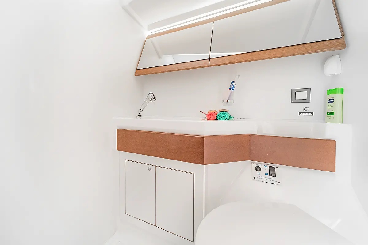 Jastuci u kokpitu, Sprayhood, Bimini, Wi-Fi i internet, Crni tank, Vanbrodski motor, Grijanje, Inverter, Električni WC, Hladnjak, Pomoćni čamac, Zvučnici u kokpitu, Solarni paneli
