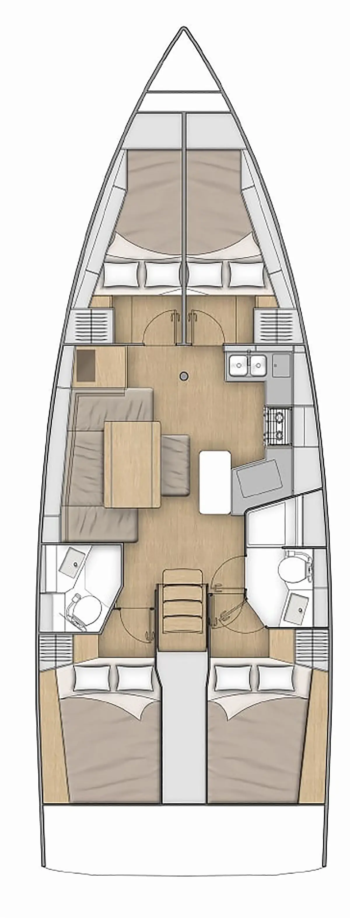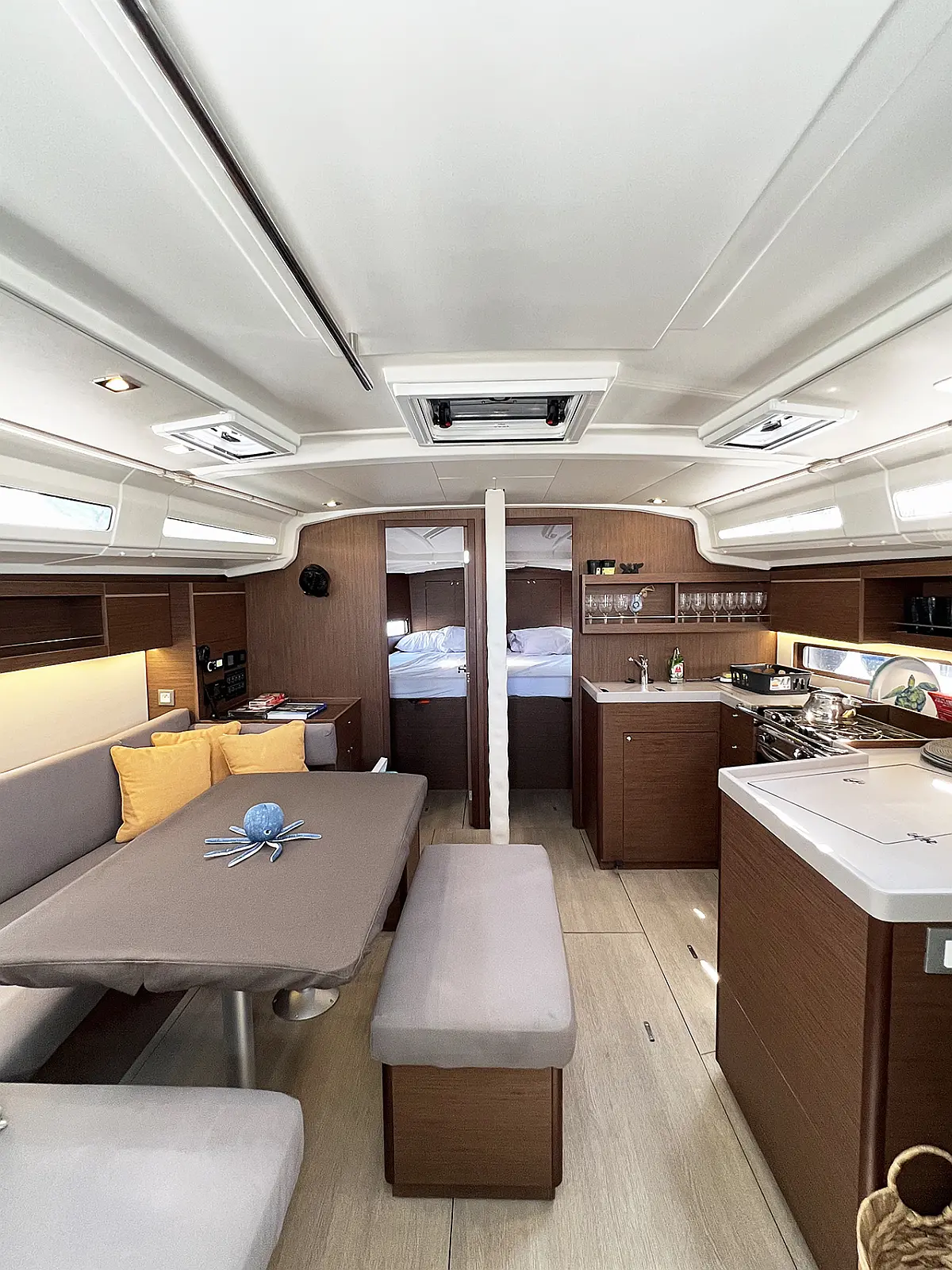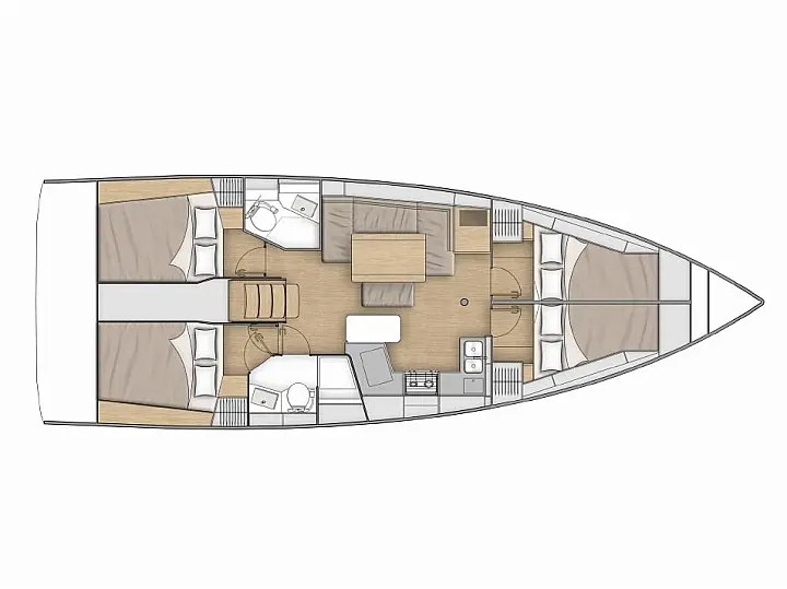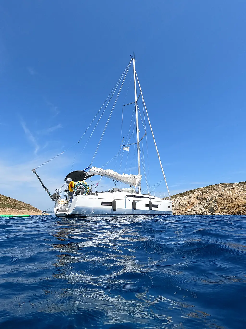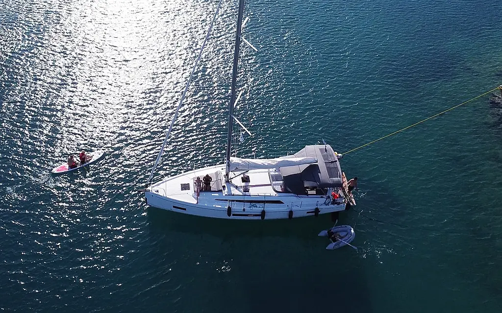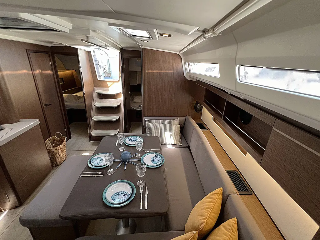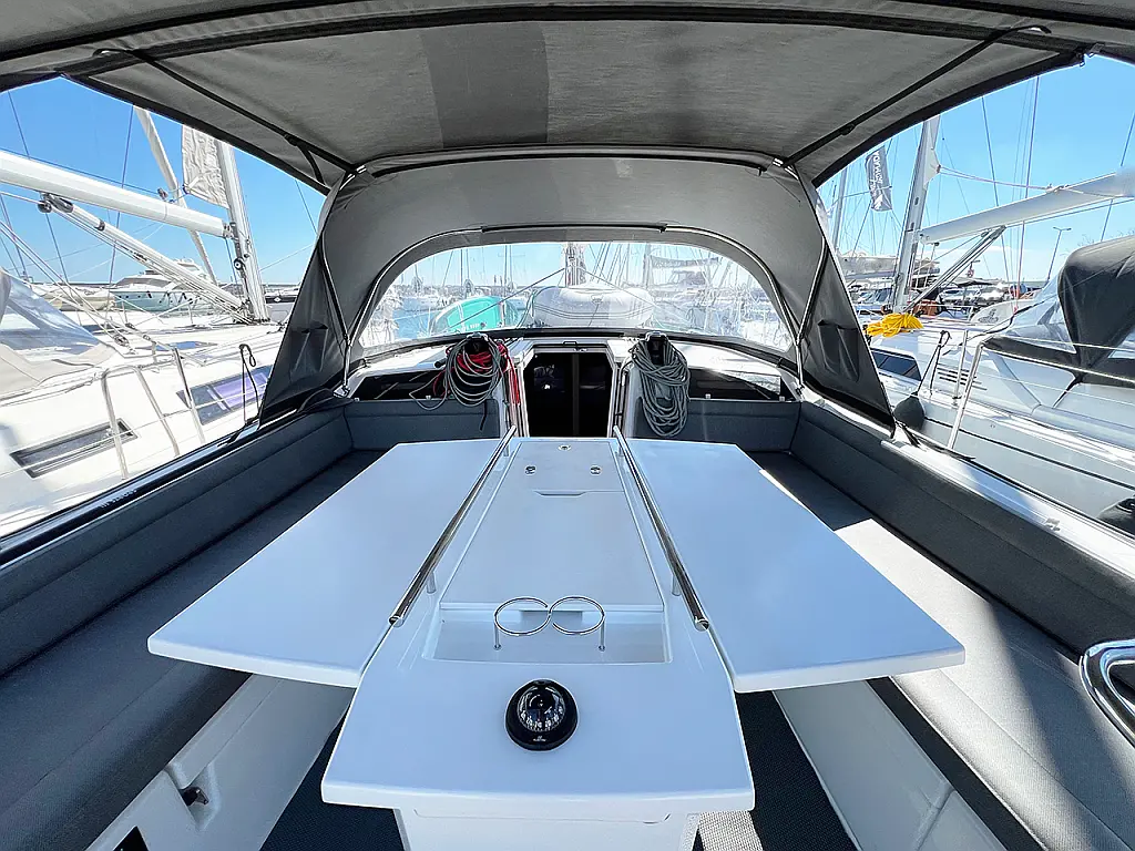 Aria condizionata, Teak in pozzetto , Bimini, Cuscini in pozzetto, Piattaforma da bagno, Tender, Motore fuoribordo, Altoparlanti in pozzetto, Generatore, WC elettrico, Pannelli solari, Frigorifero, Macchina da caffè, Sprayhood