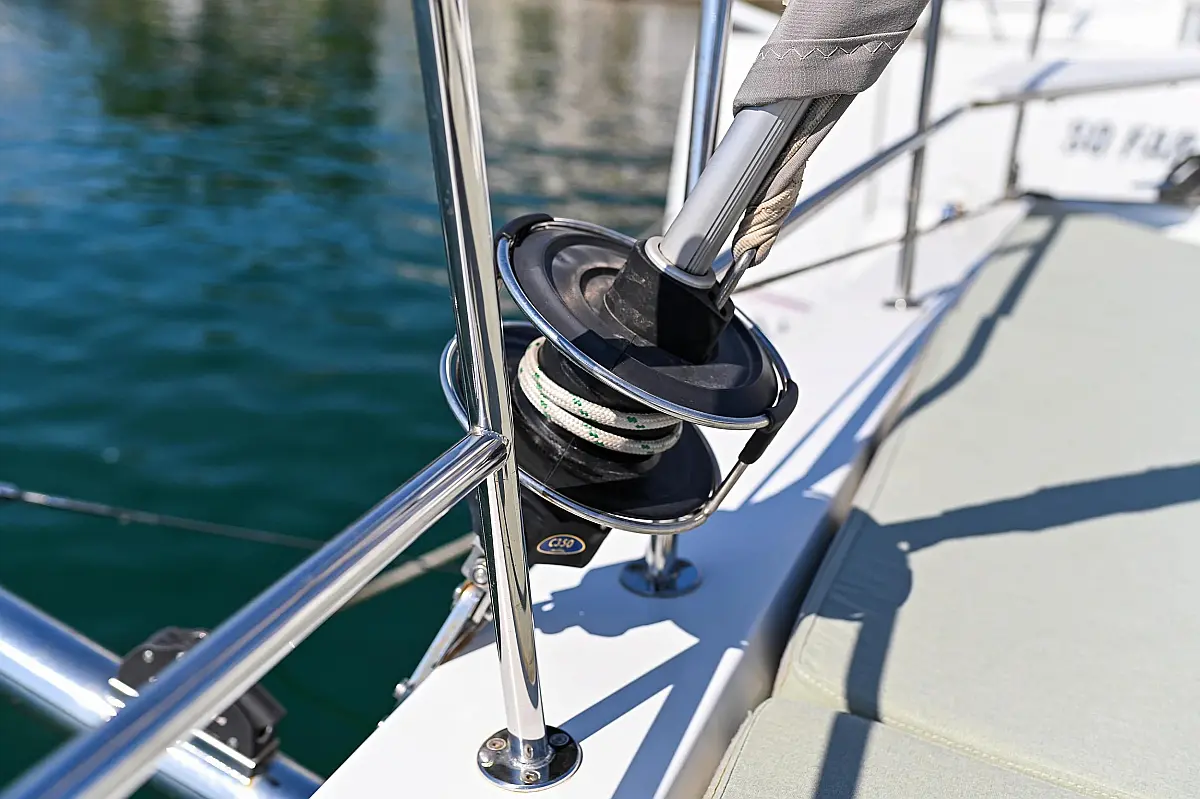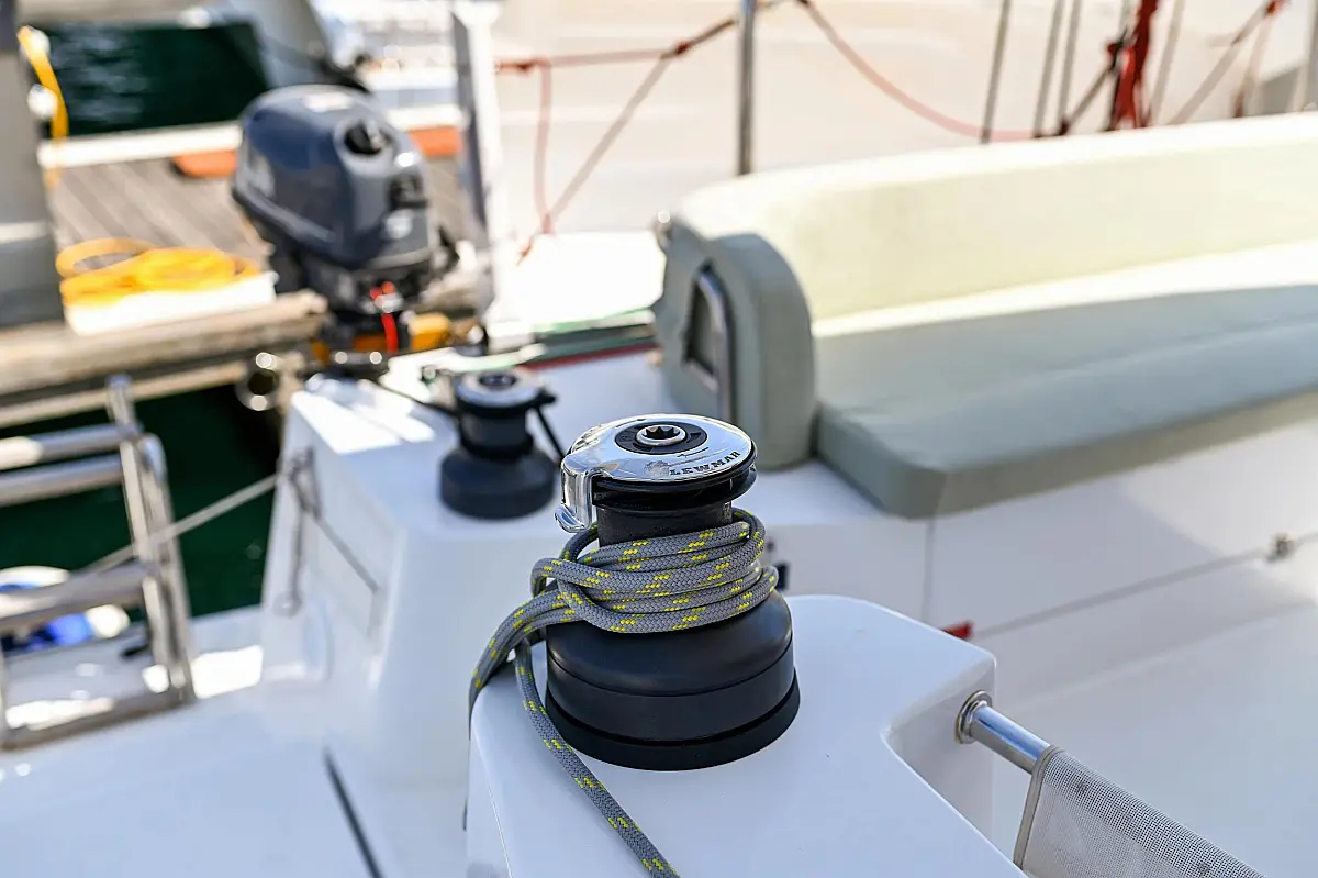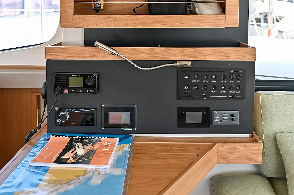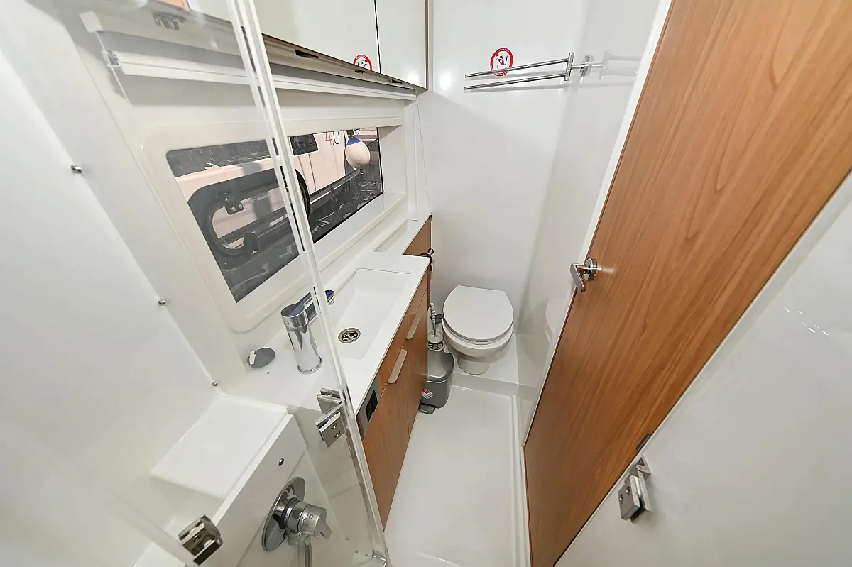 Serbatoio acque nere, Cuscini in pozzetto, Pannelli solari, WC elettrico, Piattaforma da bagno, Tender, Frigorifero