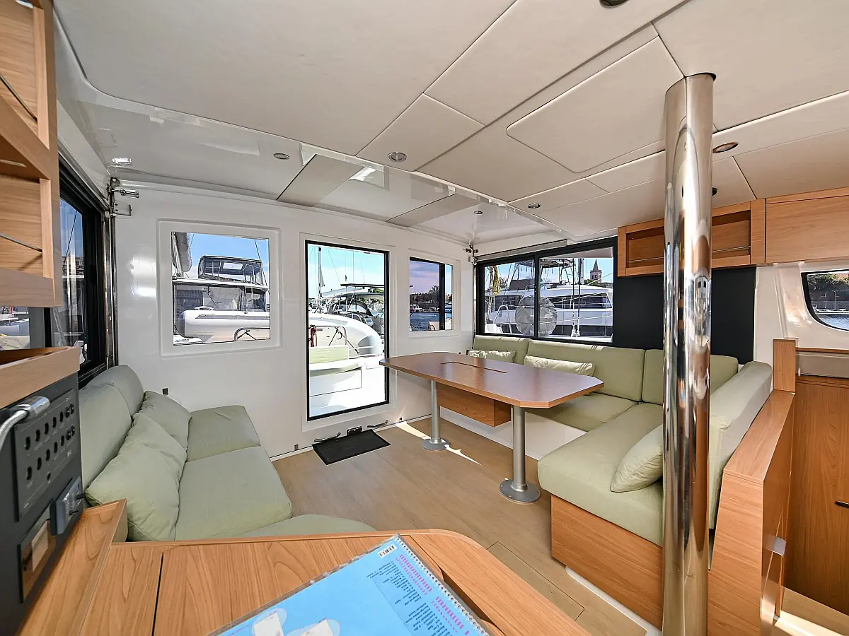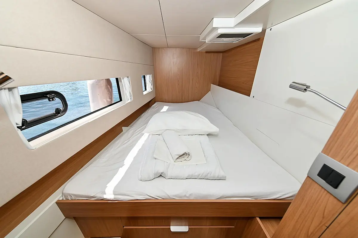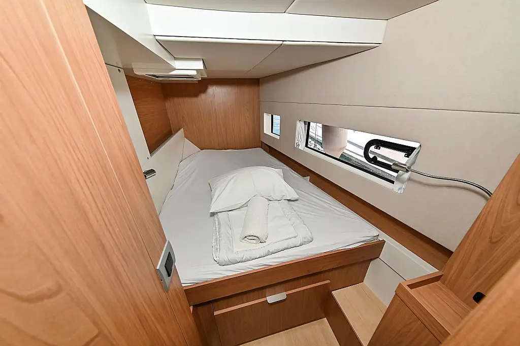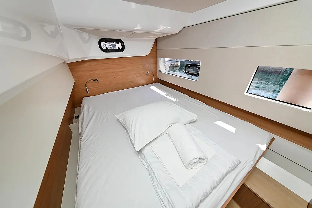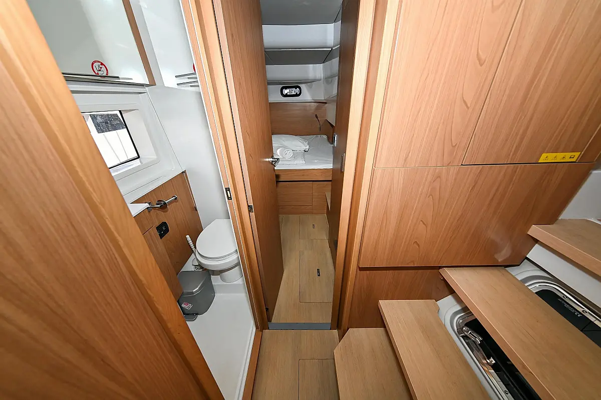 Serbatoio acque nere, Cuscini in pozzetto, Pannelli solari, WC elettrico, Piattaforma da bagno, Tender, Frigorifero