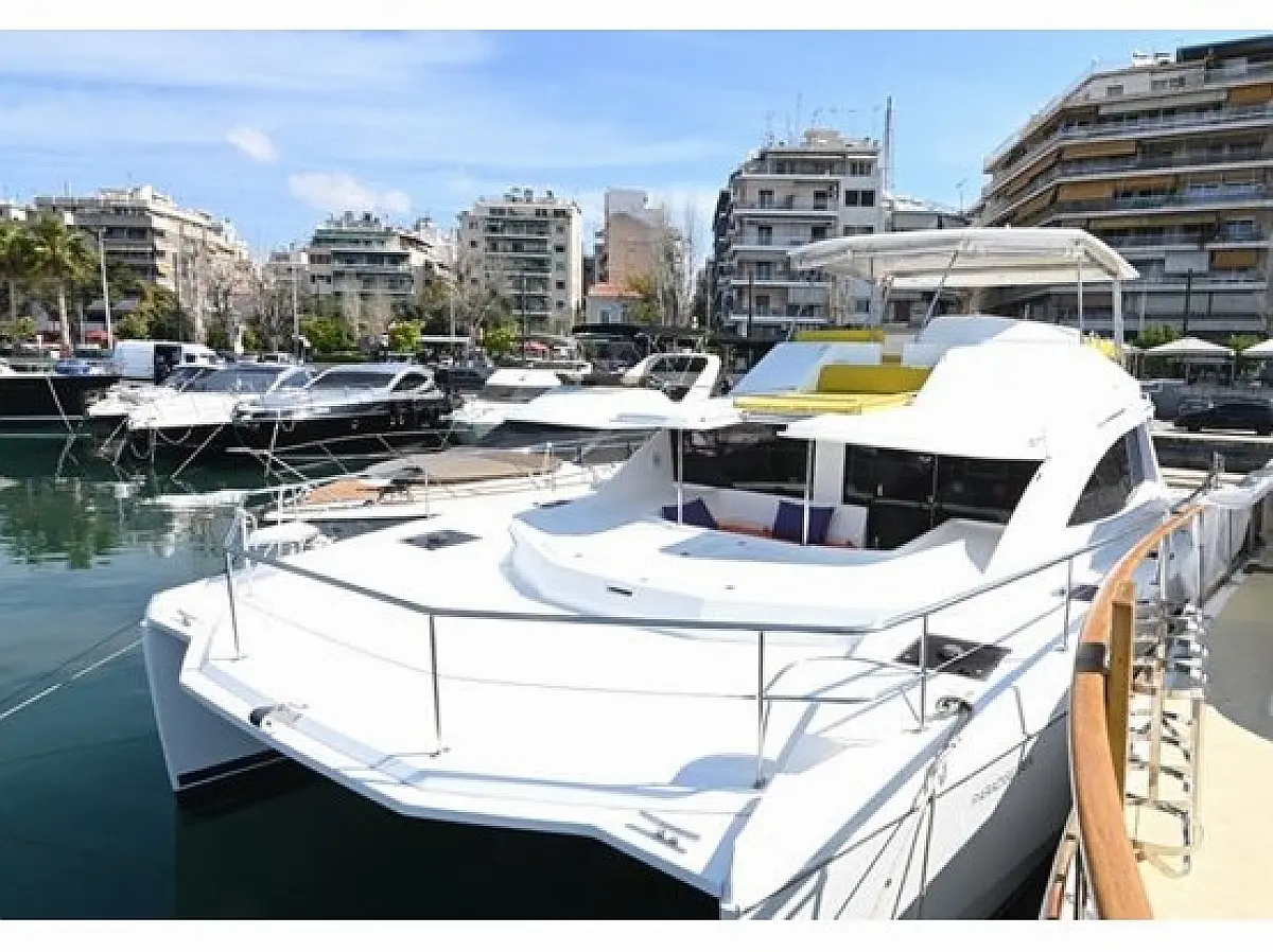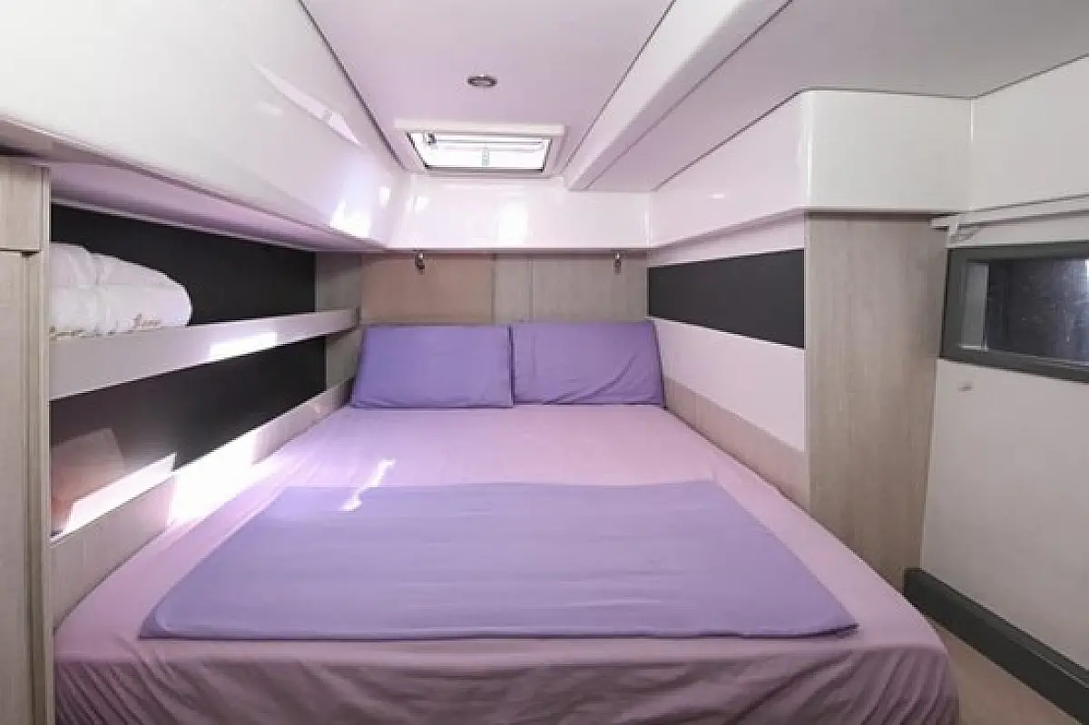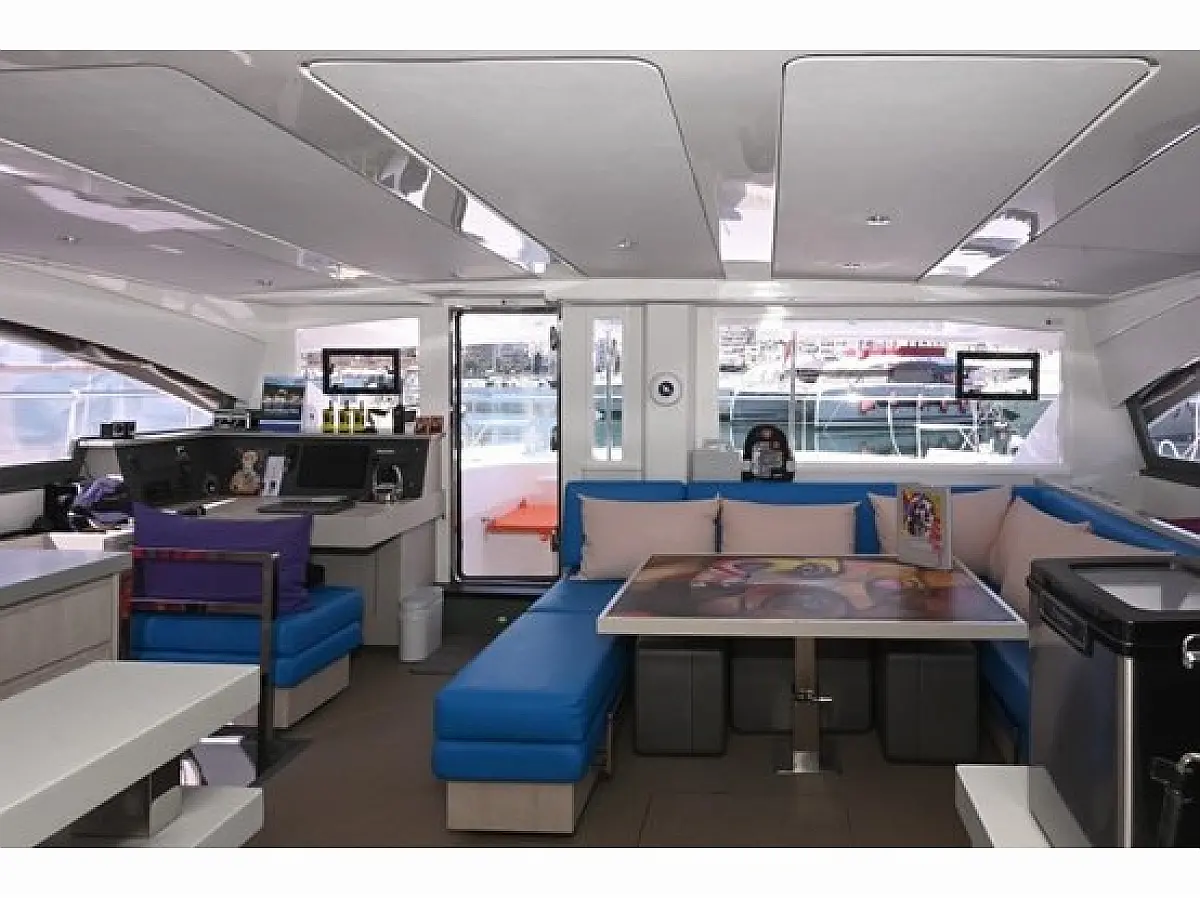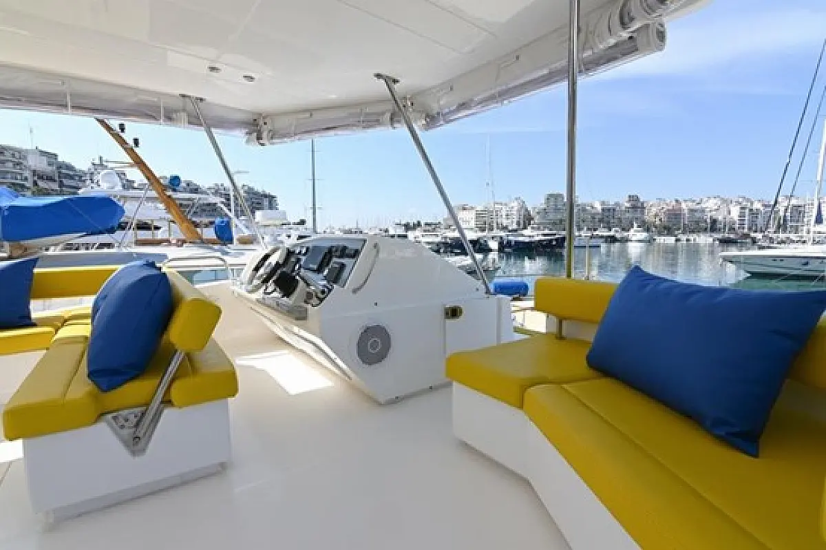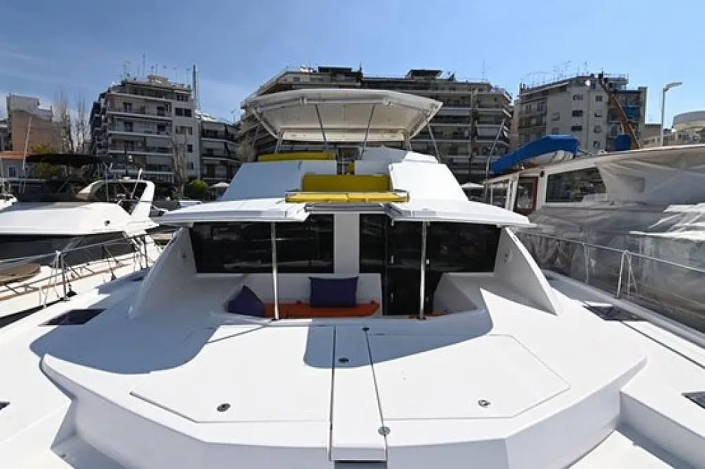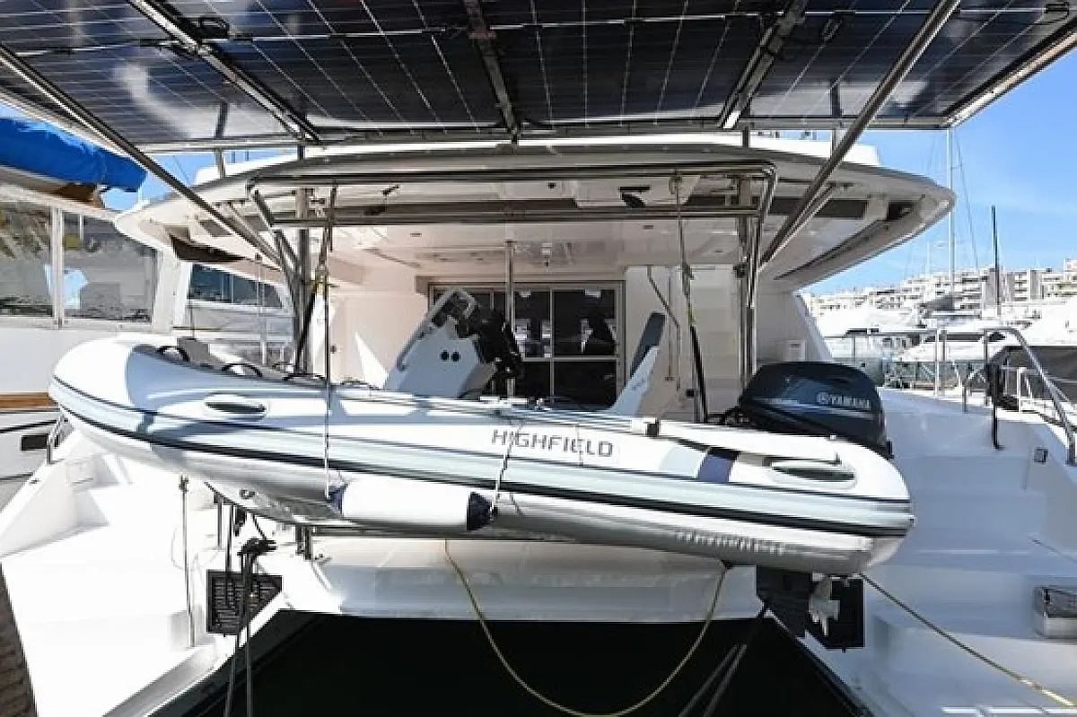 Tender, Motore fuoribordo, Cuscini in pozzetto, Pannelli solari, Aria condizionata, Macchina da caffè, Frigorifero, WC elettrico, Generatore, Passerella idraulica, Macchina del ghiaccio, Inverter, Dissalatore