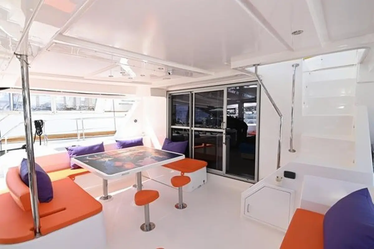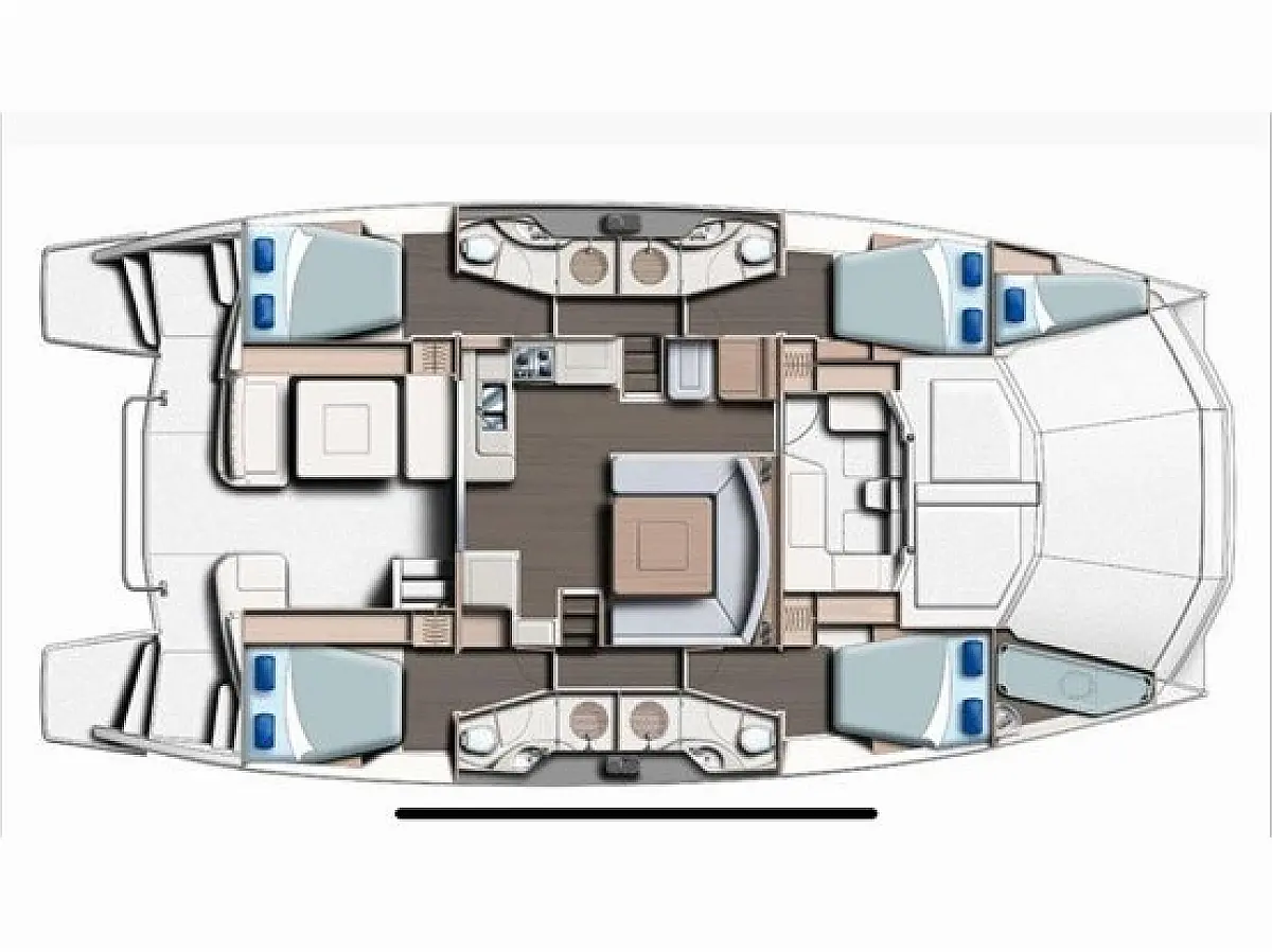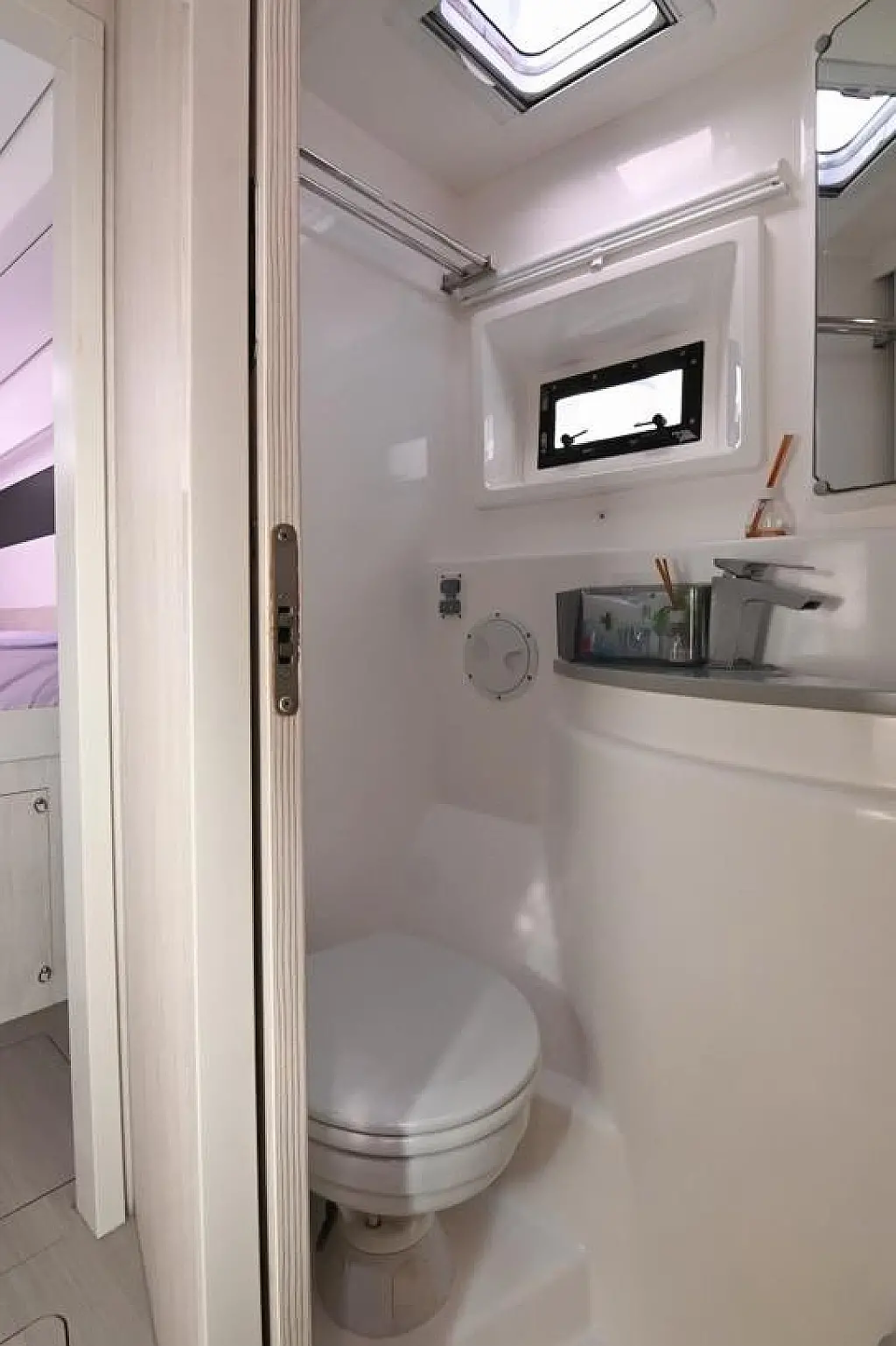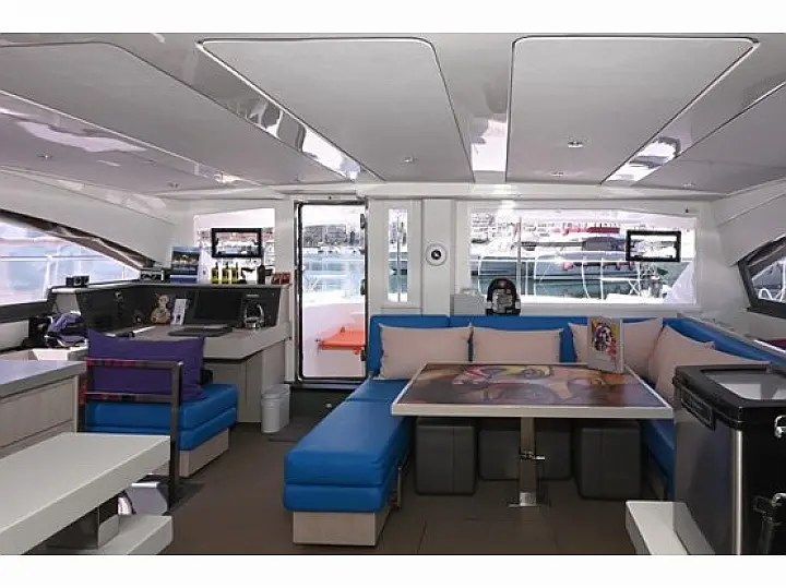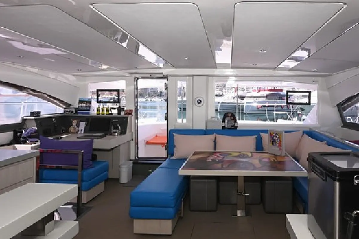 Tender, Motore fuoribordo, Cuscini in pozzetto, Pannelli solari, Aria condizionata, Macchina da caffè, Frigorifero, WC elettrico, Generatore, Passerella idraulica, Macchina del ghiaccio, Inverter, Dissalatore