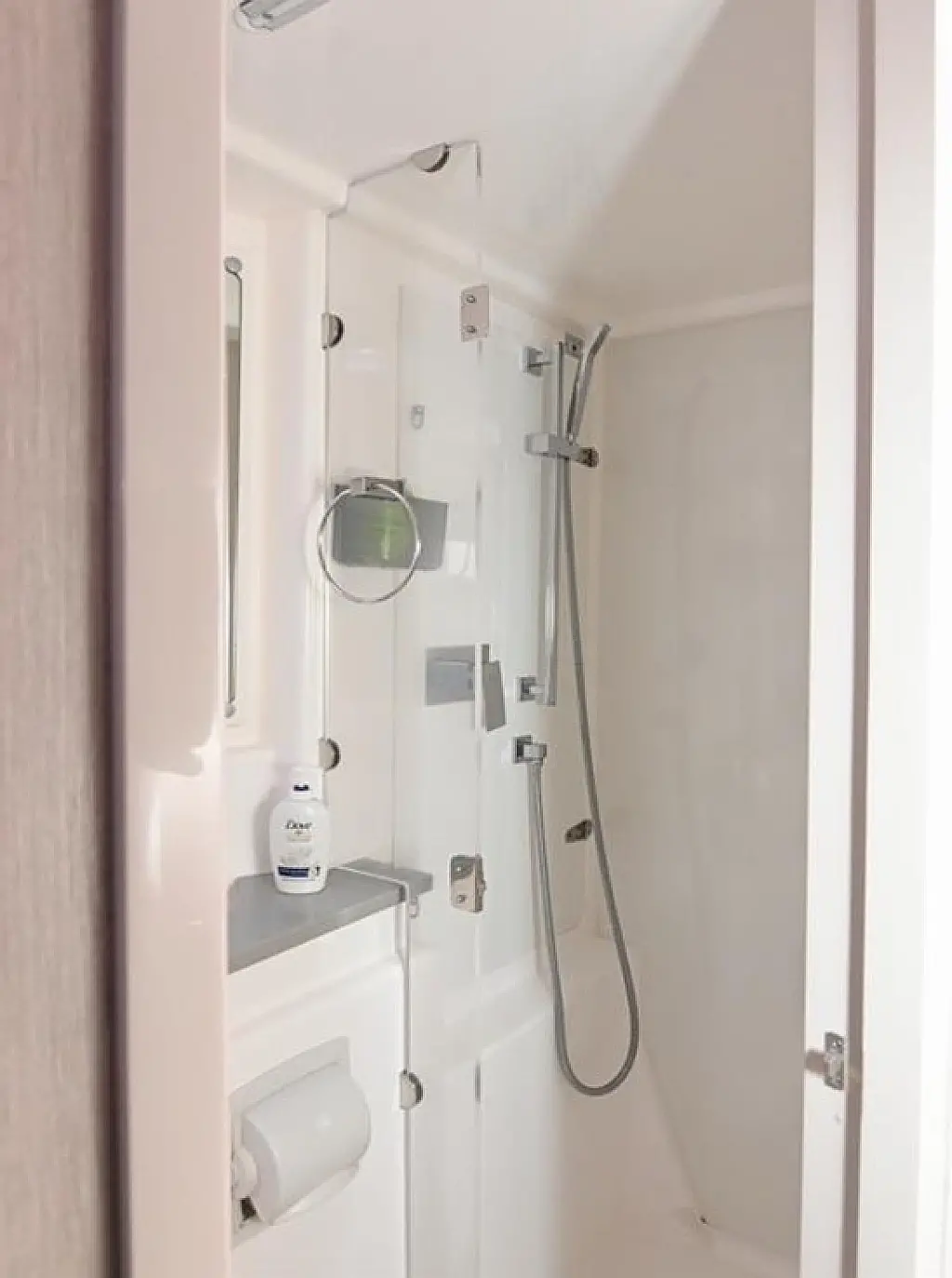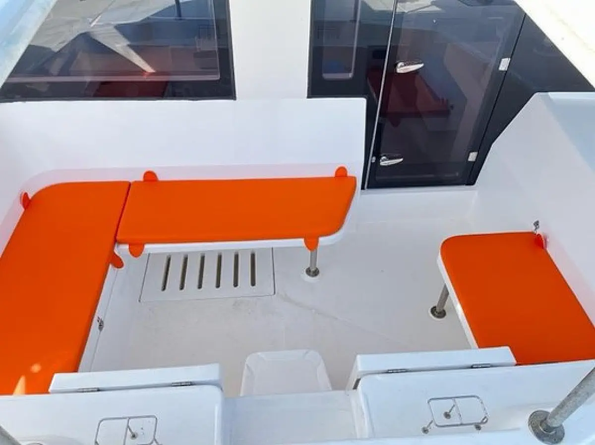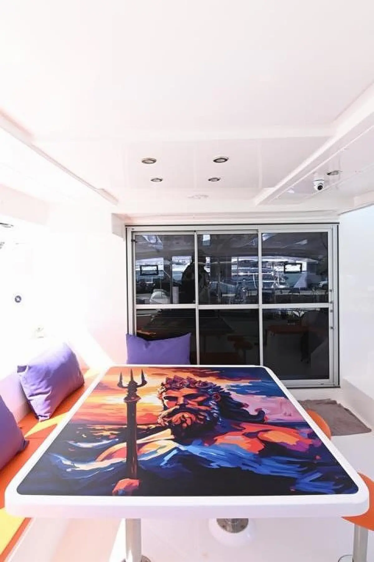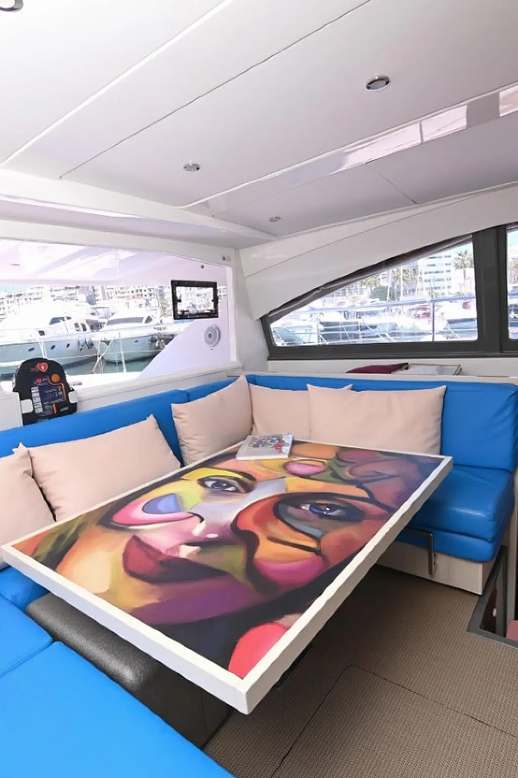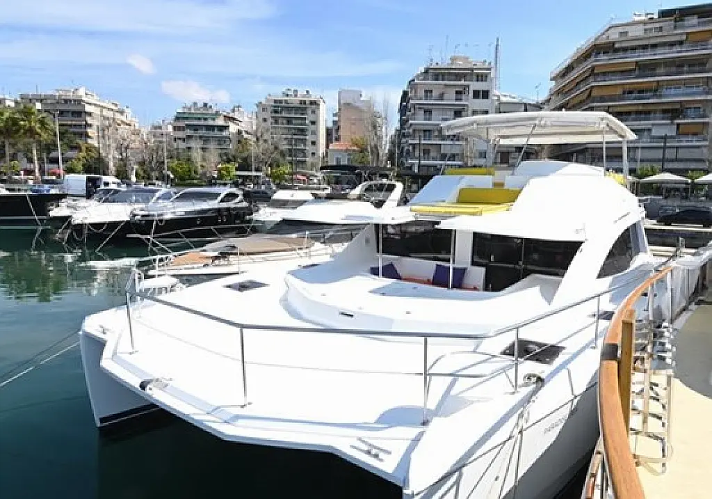 Tender, Motore fuoribordo, Cuscini in pozzetto, Pannelli solari, Aria condizionata, Macchina da caffè, Frigorifero, WC elettrico, Generatore, Passerella idraulica, Macchina del ghiaccio, Inverter, Dissalatore