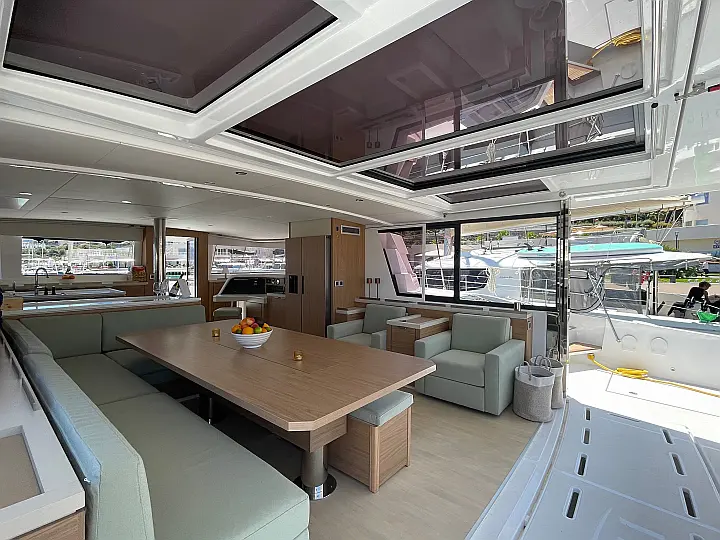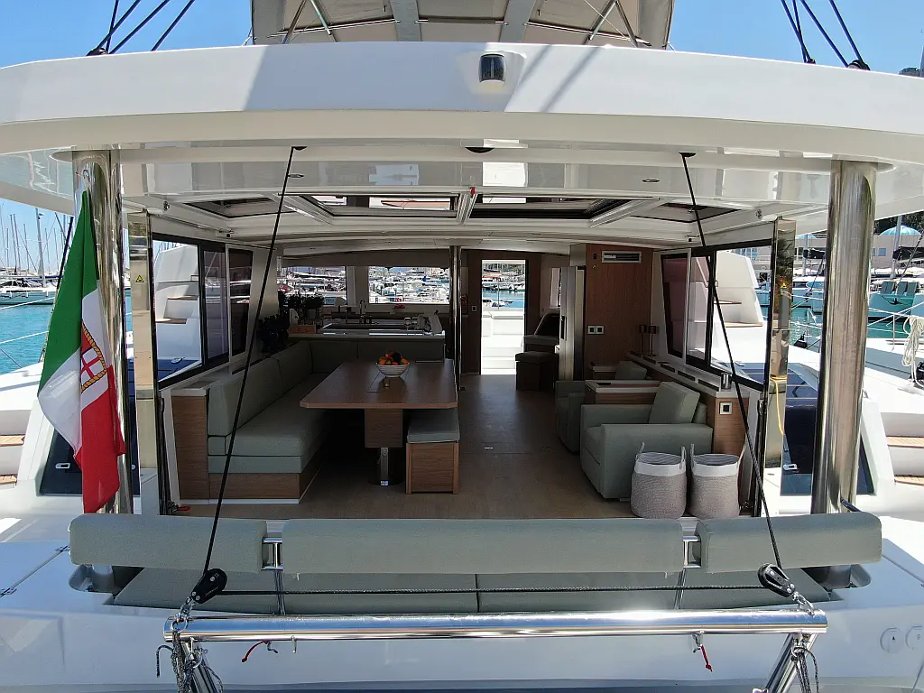 Wi-Fi и Интернет, Кондиционер, Отопление, Бимини, Тиковая палуба, Холодильник, Генератор, Солнечные панели, Динги, Подвесной мотор, Опреснитель морской воды, Электрический туалет, Динамики в кокпите, Ледогенератор, Кофеварка, Подушки в кокпите, Инвертор