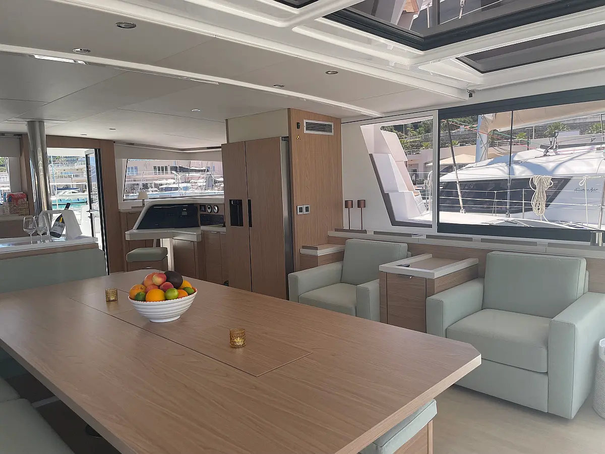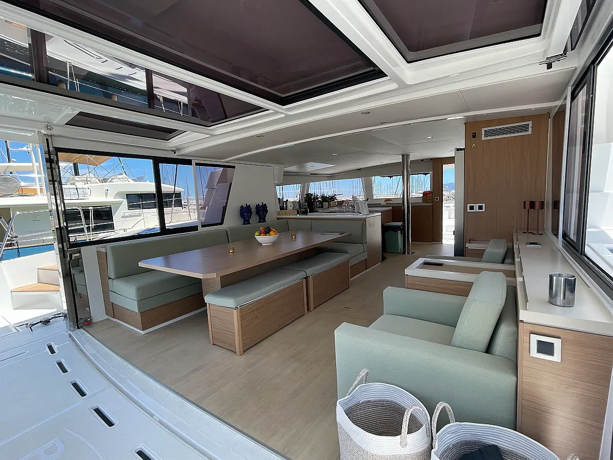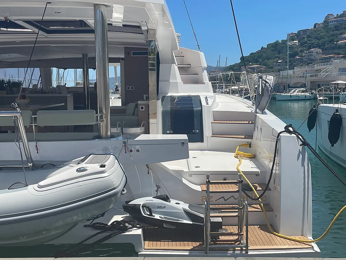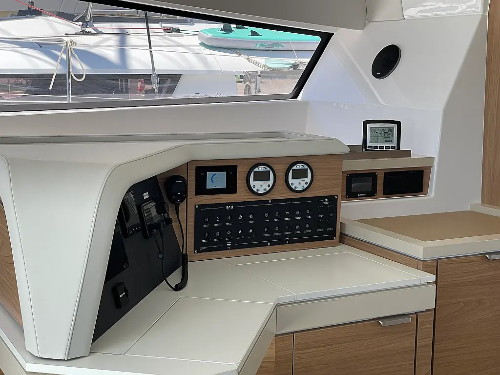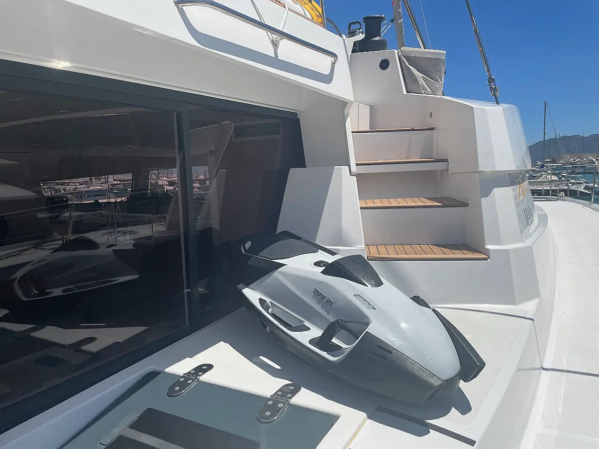 Wi-Fi и Интернет, Кондиционер, Отопление, Бимини, Тиковая палуба, Холодильник, Генератор, Солнечные панели, Динги, Подвесной мотор, Опреснитель морской воды, Электрический туалет, Динамики в кокпите, Ледогенератор, Кофеварка, Подушки в кокпите, Инвертор