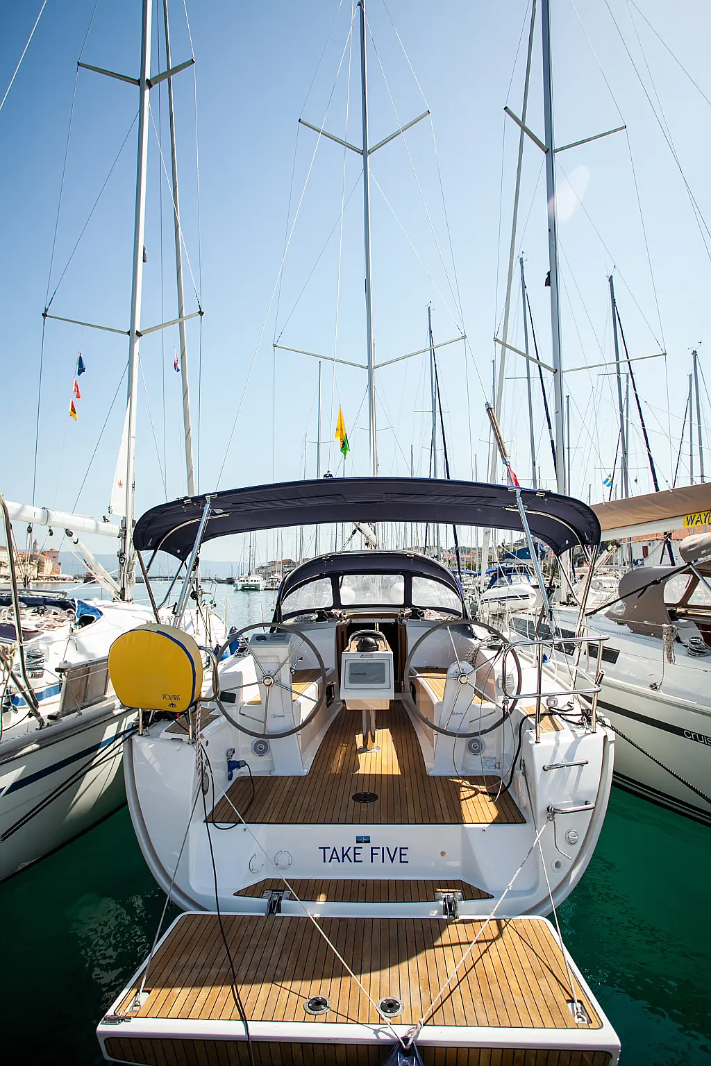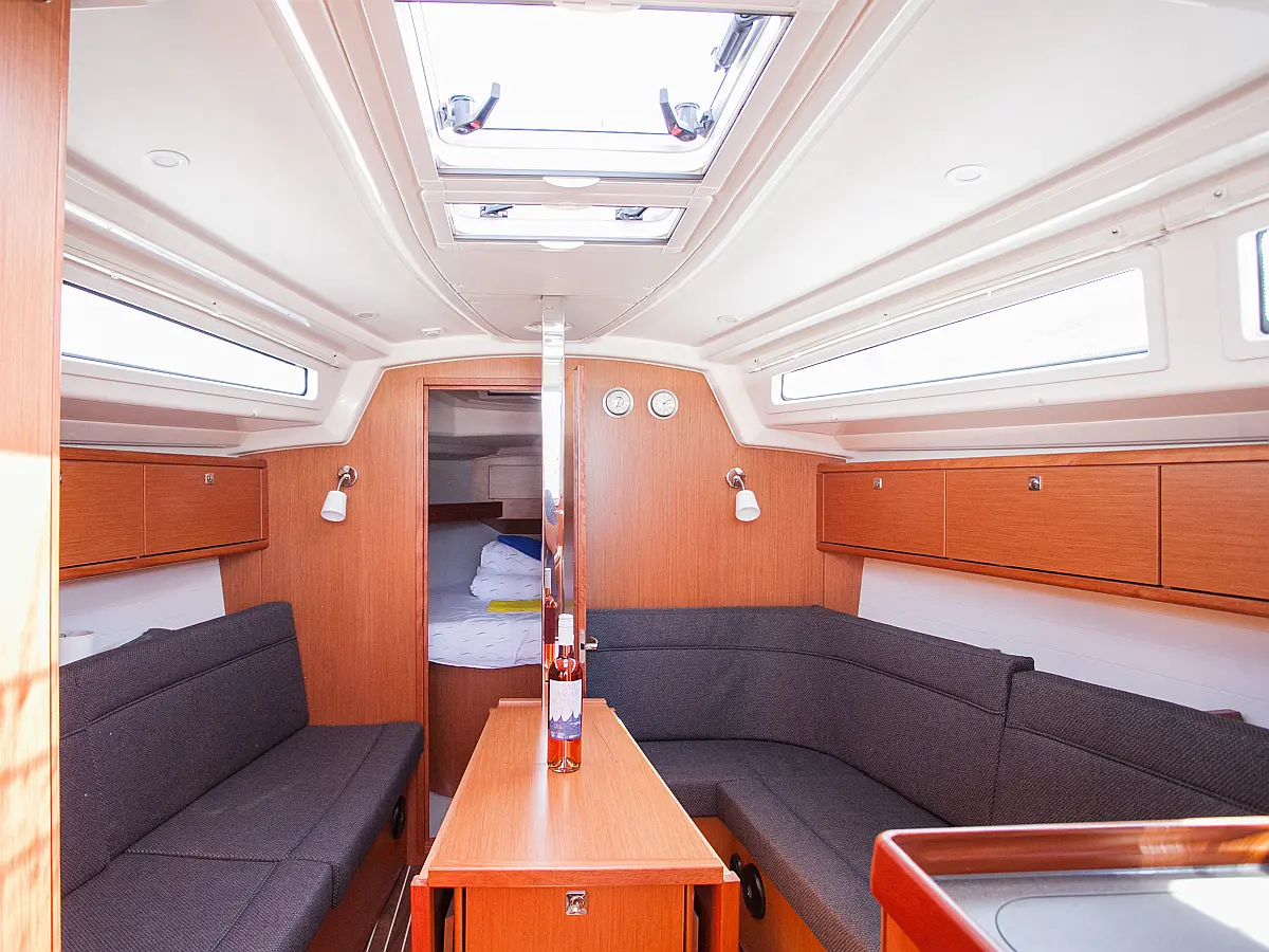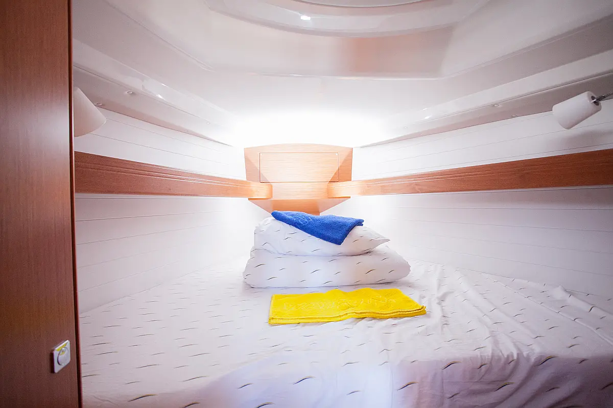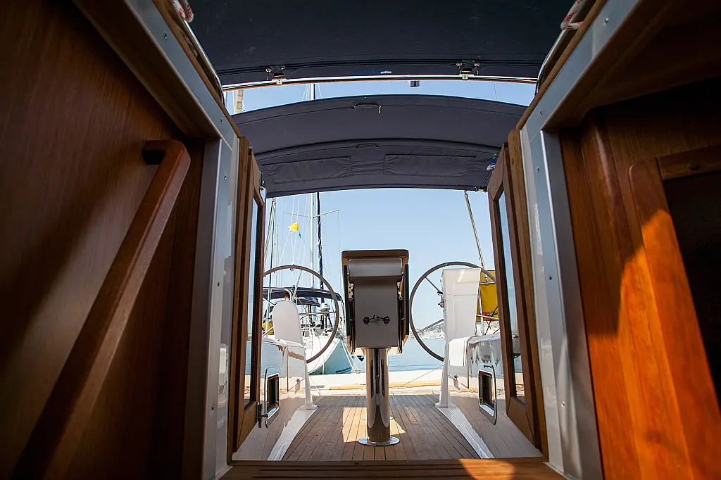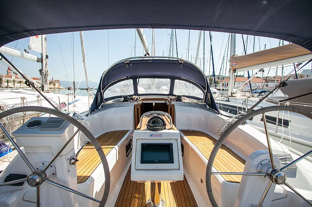 Бимини, Спрейхуд, Подвесной мотор, Электрический туалет, Тиковый кокпит, Отопление, Солнечные панели, Подушки в кокпите
